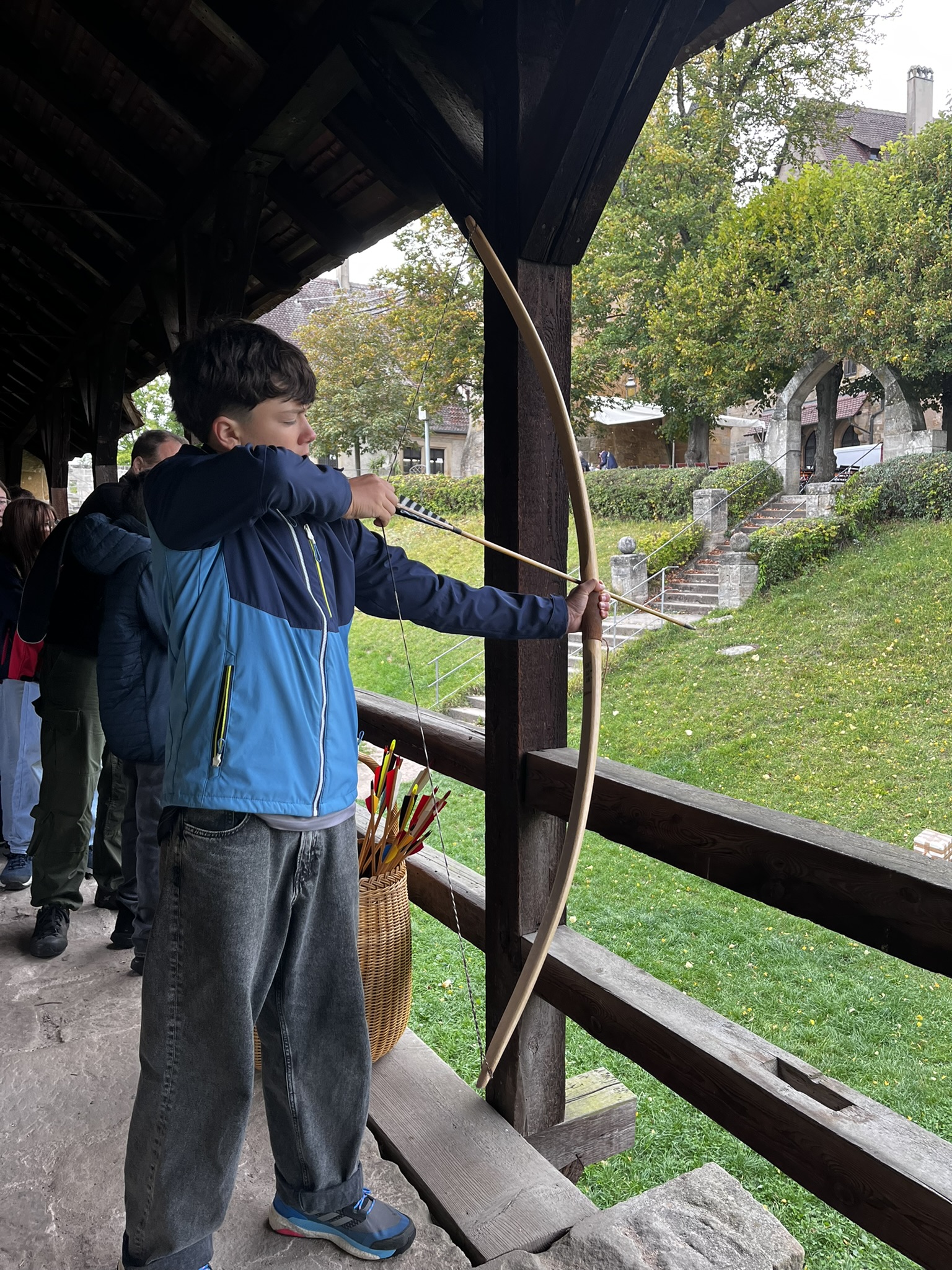 Nach dem verspäteten Ankommen und dem Beziehen der Zimmer blieb noch Zeit, die Umgebung über eine Stadtrallye zu erkunden und sich auf die kommenden Tage einzustimmen.Der Dienstag stand ganz im Zeichen der Teambildung: bei abwechslungsreichen Spielen und Übungen wuchsen die Schülerinnen und Schüler enger zusammen und bewiesen bei einer spannenden Flussüberquerung Mut, Geschick und Zusammenarbeit.Am Mittwoch ging es hoch hinaus zur Altenburg, einer der ältesten Burganlagen Frankens. Bei einer interessanten Führung lernten die Schülerinnen und Schüler viel über die Geschichte der Region. Anschließend konnten sie beim Bogenschießen ihre Zielgenauigkeit unter Beweis stellen – für viele ein echtes Highlight. Den krönenden Abschluss des Tages bildete eine Abendführung durch Bamberg bei spannenden Geschichten aus früheren Tagen und geheimnisvollem Laternenschein.