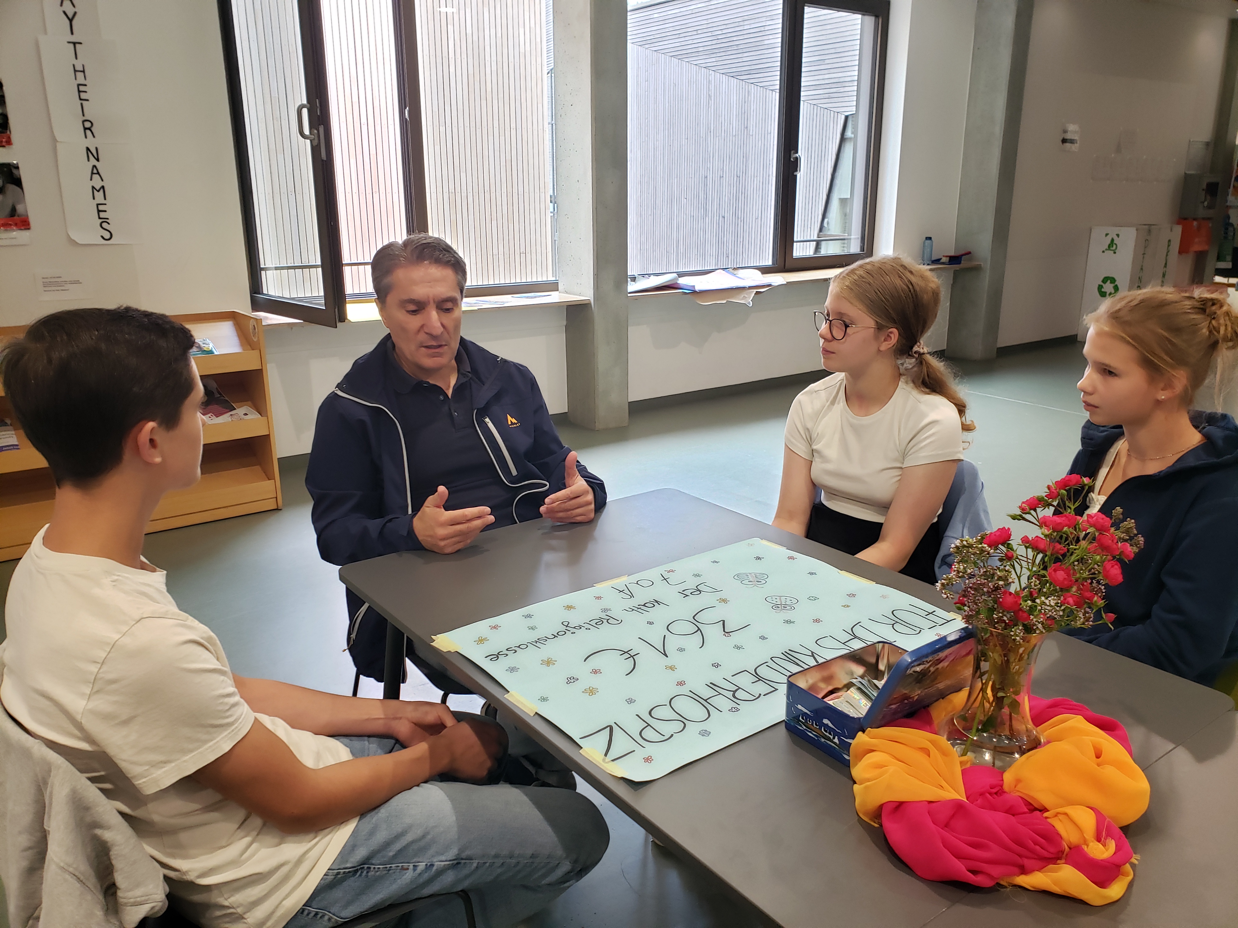 Das Organisationsteam Lola, Julius und Lena kümmerte sich um die Umsetzung. Lola und Julius überlegten, wie sie die Komplimente umsetzen können, und Lena, wo wir das gesammelte Geld hinspenden werden. Die Komplimente wurden im ganzen Schulhaus an verschiedenen Stellen aufgehängt und auch mehrmals aufgefüllt. Unser gesammeltes Geld wollten wir an ein Kinderhospiz in unserer Nähe spenden. Am Tag des Verkaufs waren wir, die ganze Religionsgruppe, sehr aufgeregt. Fast alle beteiligten sich in irgendeiner Form an der Umsetzung unseres Projektes. Wir hatten viele verschiedene Kuchenarten. Am Ende war alles verkauft und uns war noch nicht klar, wie viel Geld wir eingenommen hatten. In der nächsten Reli-Stunde überraschte uns unsere Lehrerin mit dem Betrag: Wir hatten mit dem Kuchenverkauf 361€ eingenommen! Nach dieser Religionsstunde haben wir den Kontakt mit Mehmet Yesilgöz vom Kinderhospizdienst des Neckar-Odenwald-Kreises aufgenommen. Leider fanden wir in diesem Jahr zunächst keinen Termin für ein Treffen, aber in der letzten Woche vor den Ferien hat es endlich geklappt. Herr Yesilgöz kam zu uns ans BGB, wo wir ihn empfingen. Er erzählte uns, dass derzeit 20 Mitarbeiter bei ihm tätig sind. Sie sind ein ambulanter Dienst und kommen zu den Kindern nach Hause. Er erzählte uns auch, dass sie nicht nur zu erkrankten Kindern gehen, sondern auch zu Geschwisterkindern oder Kindern, deren Eltern schwer krank sind. Sie wollen immer, dass die Kinder Spaß haben. Am Ende erzählte er uns noch, warum er zum Hospiz gekommen ist. Seine Eltern kamen aus der Türkei. Er selbst ist in Deutschland geboren und wünschte sich immer wieder, ganz akzeptiert zu werden. Er wollte, dass alle integriert sind: kranke Menschen, aber auch Menschen, die im Gefängnis sitzen. Er erzählte uns, dass er aus diesem Grund im Gefängnis ehrenamtlich arbeitet und zum Hospiz gekommen ist. Das bewegte uns sehr und wir sind dankbar, das gesammelte Geld an das Kinderhospiz nach Mosbach zu spenden.