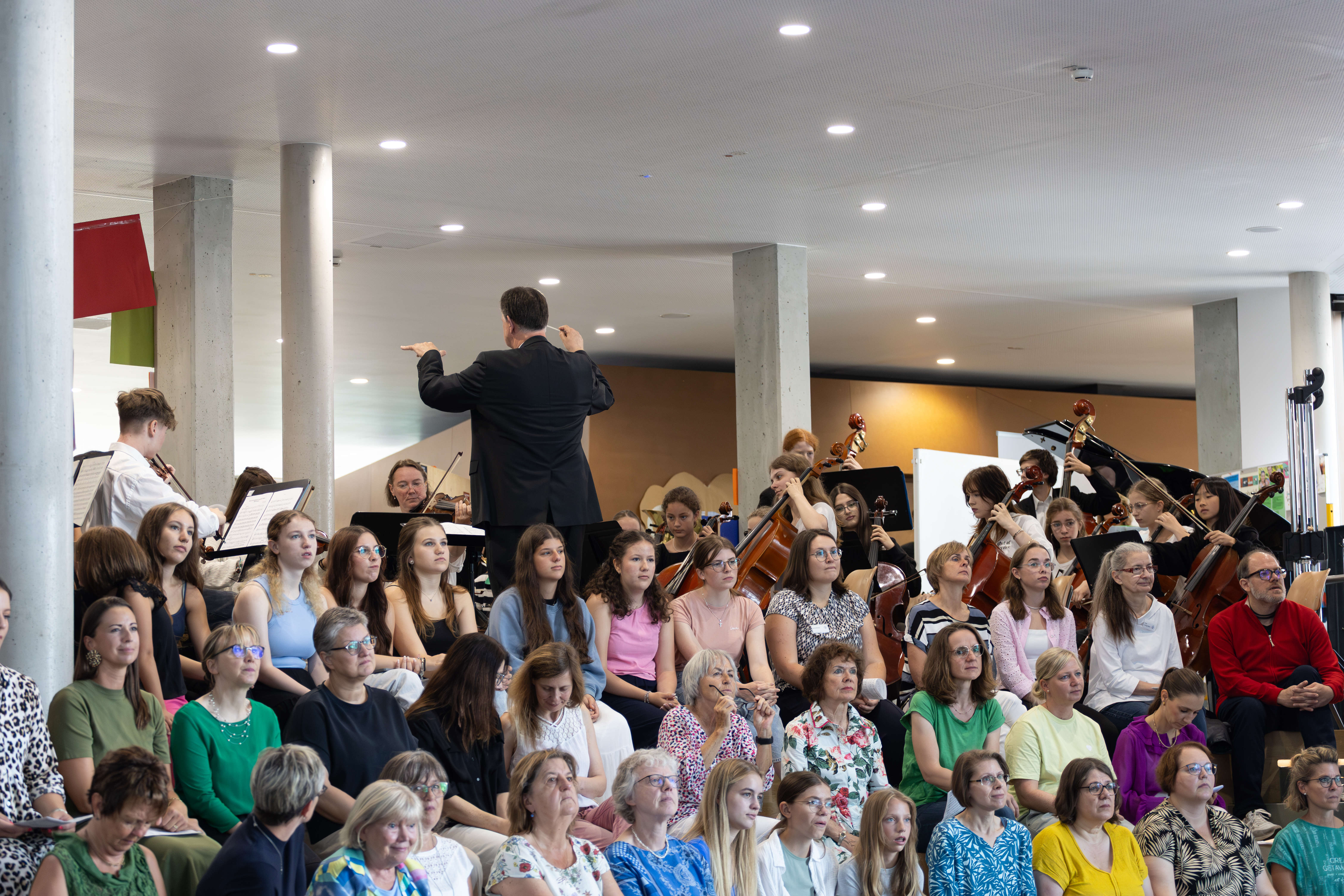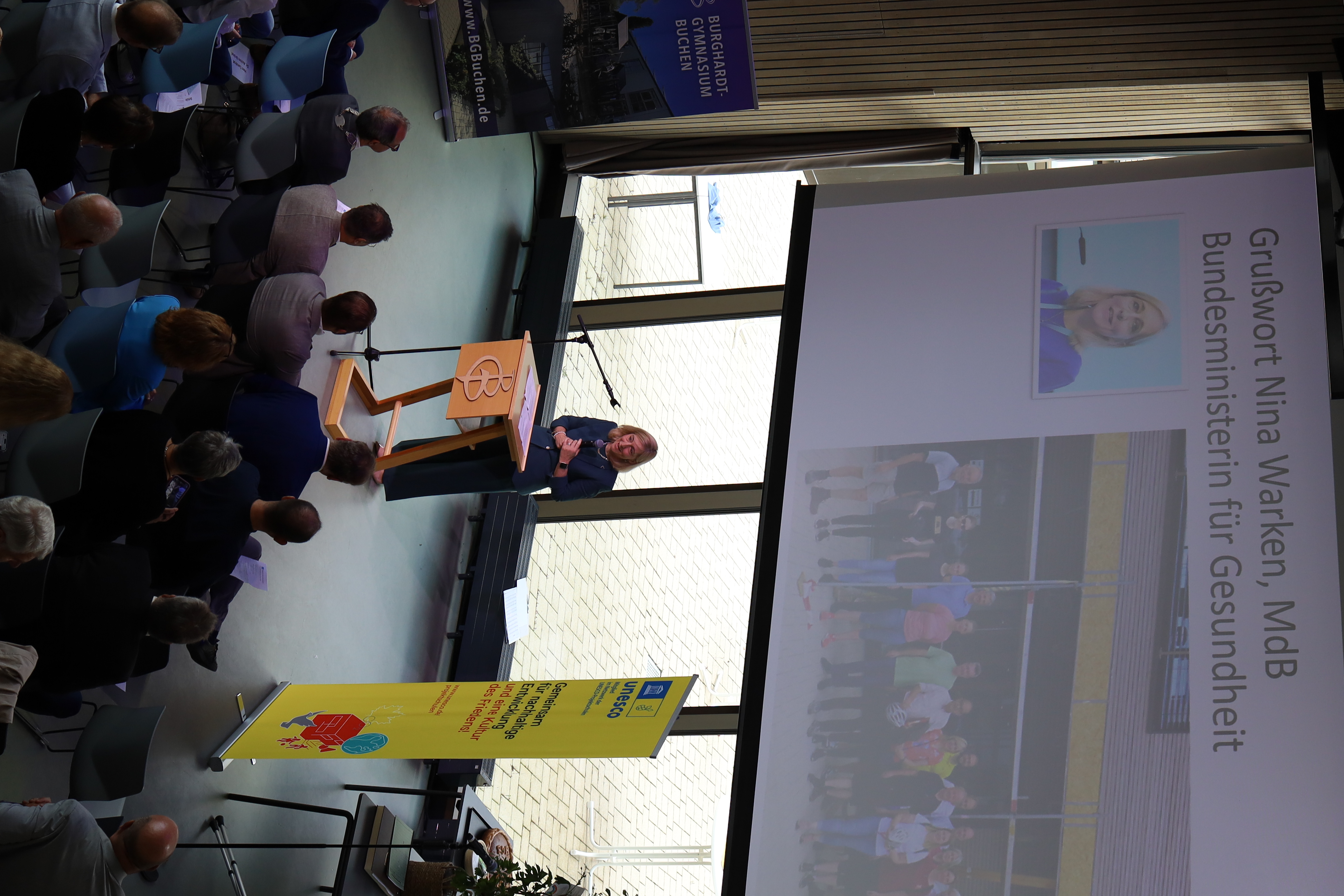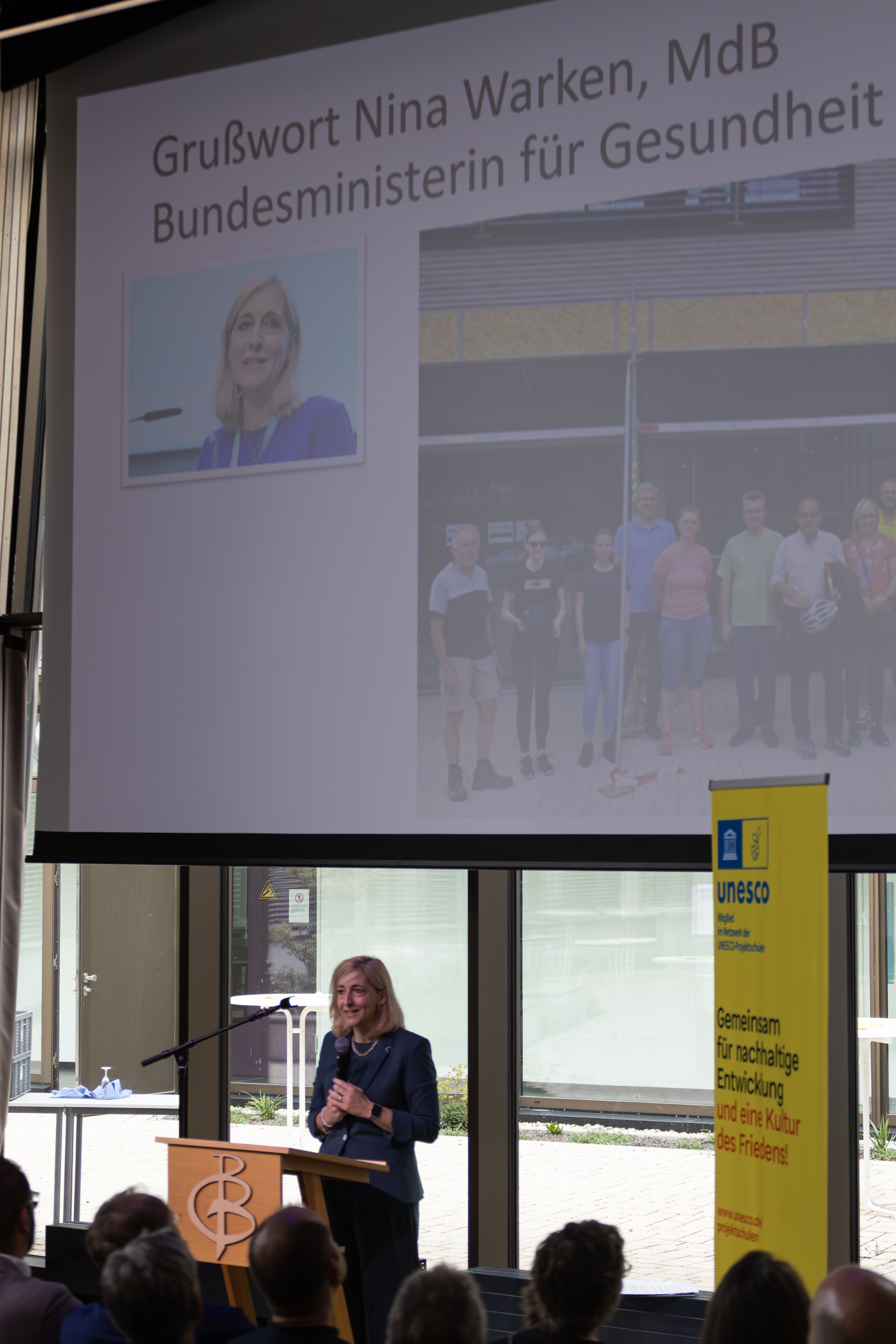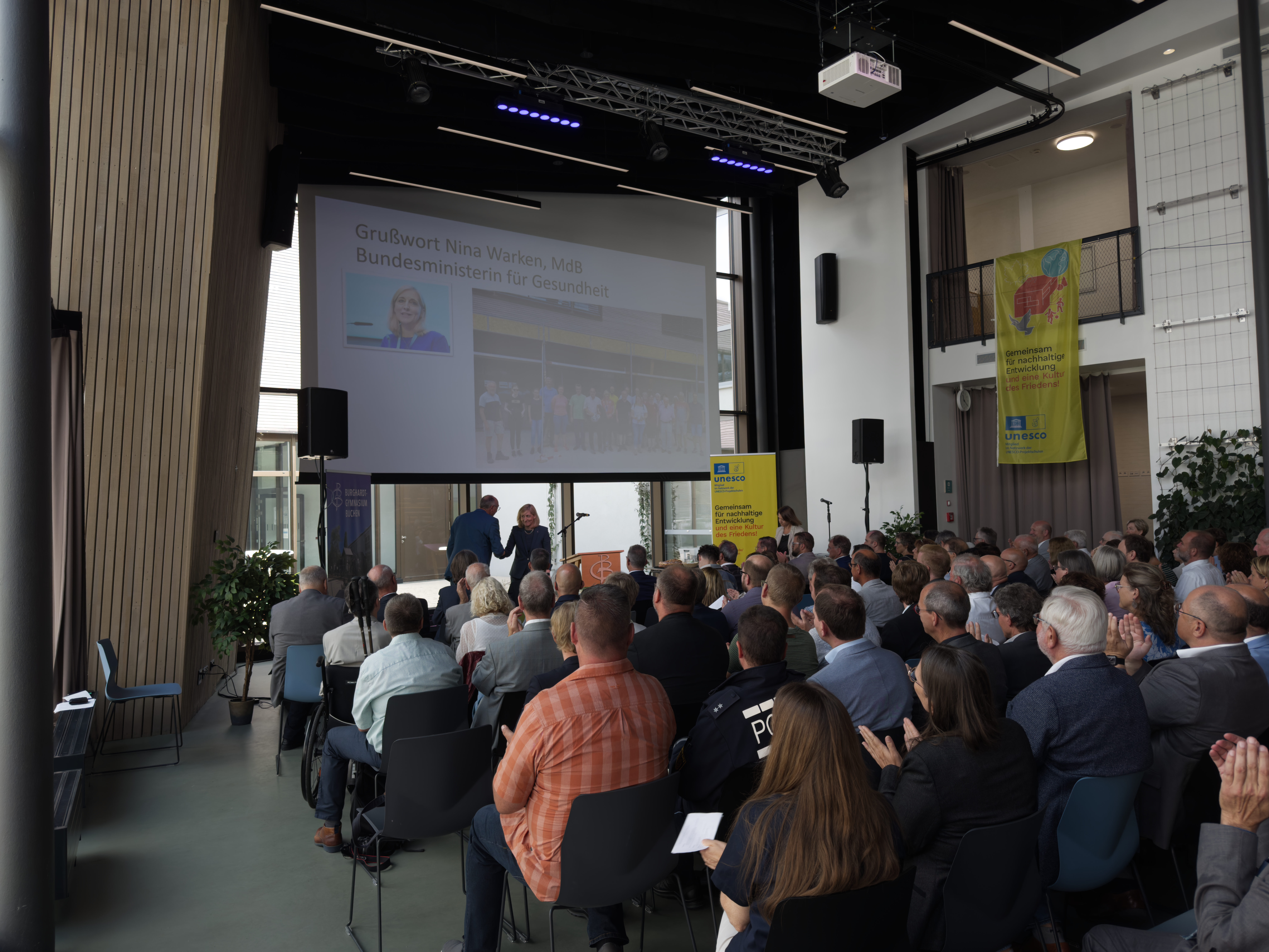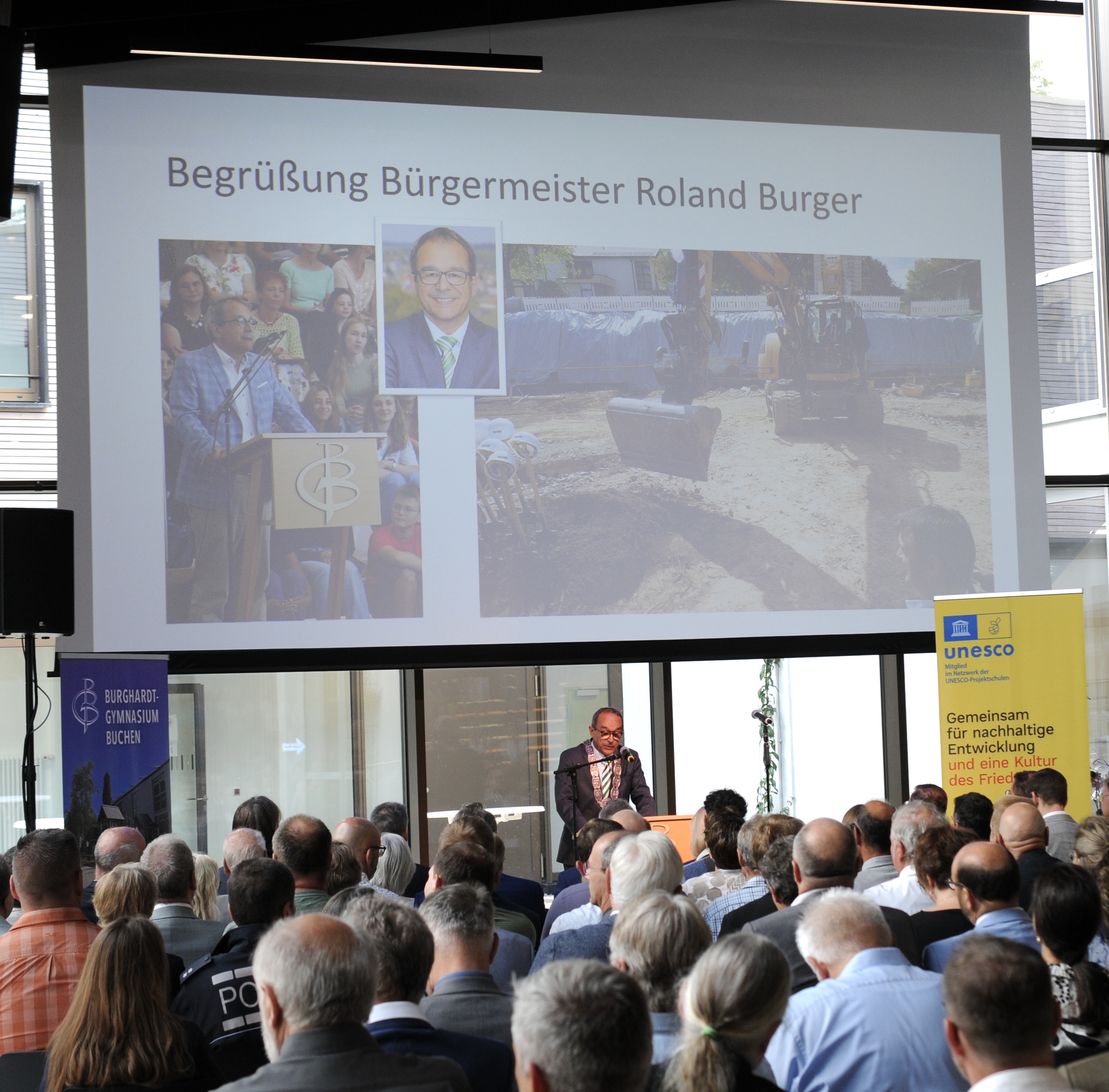 Wenn ein mehr als zweieinhalbstündiger Festakt zu keiner Sekunde als langweilig oder zäh empfunden wird, dann haben die Programmgestalter alles richtig gemacht – so wie am Samstagvormittag im Atrium des Burghardt-Gymnasiums: Erfrischende Reden wechselten sich ab mit packenden musikalischen Beiträgen, und das Ganze wurde garniert mit kreativen Filmbeiträgen und gelungenen Fotoeinblendungen. Im Beisein zahlreicher Gäste aus Politik und Gesellschaft – darunter Bundesgesundheitsministerin Nina Warken und der baden-württembergische Minister für Ernährung, Ländlichen Raum und Verbraucherschutz, Peter Hauk – wurden gleich drei Ereignisse festlich begangen: der Abschluss des Schulumbaus nach sechsjähriger Bauzeit, das Jubiläum „180 Jahre BGB“ und die Anerkennung als eine von weltweit 11 500 Unesco-Projektschulen.