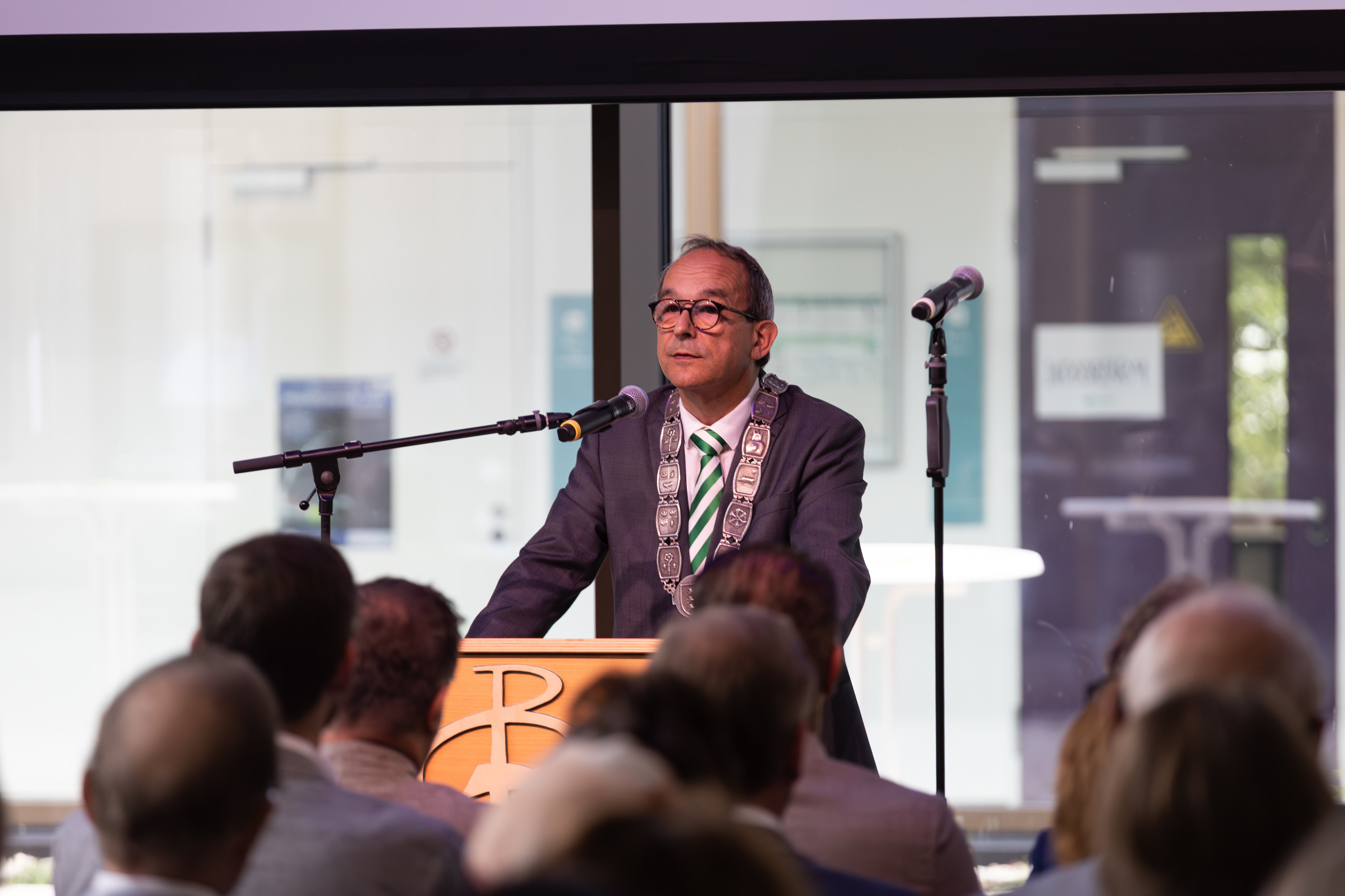 Wie nach ihm auch die weiteren Redner richtete der Bürgermeister Dankesworte an alle Beteiligten – angefangen beim Gemeinderat über Architekt, Handwerker, Bauleiter bis hin zu Schulleiter Jochen Schwab und Stellvertreter Achim Wawatschek: „Sie haben für Ihre Schule gekämpft, und gemeinsam haben wir immer eine gute Lösung gefunden!“ Statt eines Schlüssels überreichte Burger ein Steuerungstablet an Jochen Schwab, damit er das BGB – eine „Schule mit Haltung, Herz und Visionen“ – als Steuermann weiterhin sicher durch die bewegte Bildungslandschaft führen könne.