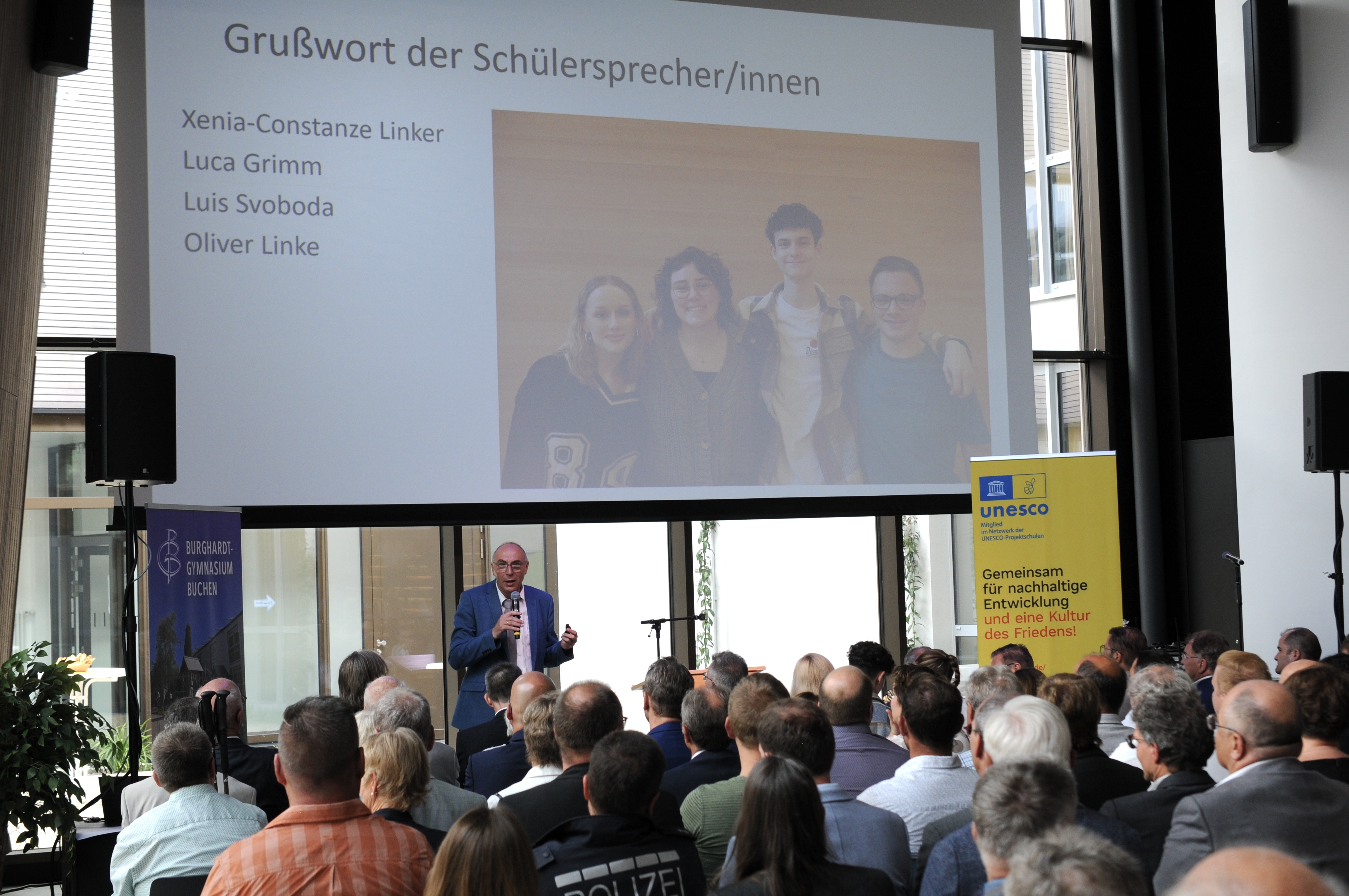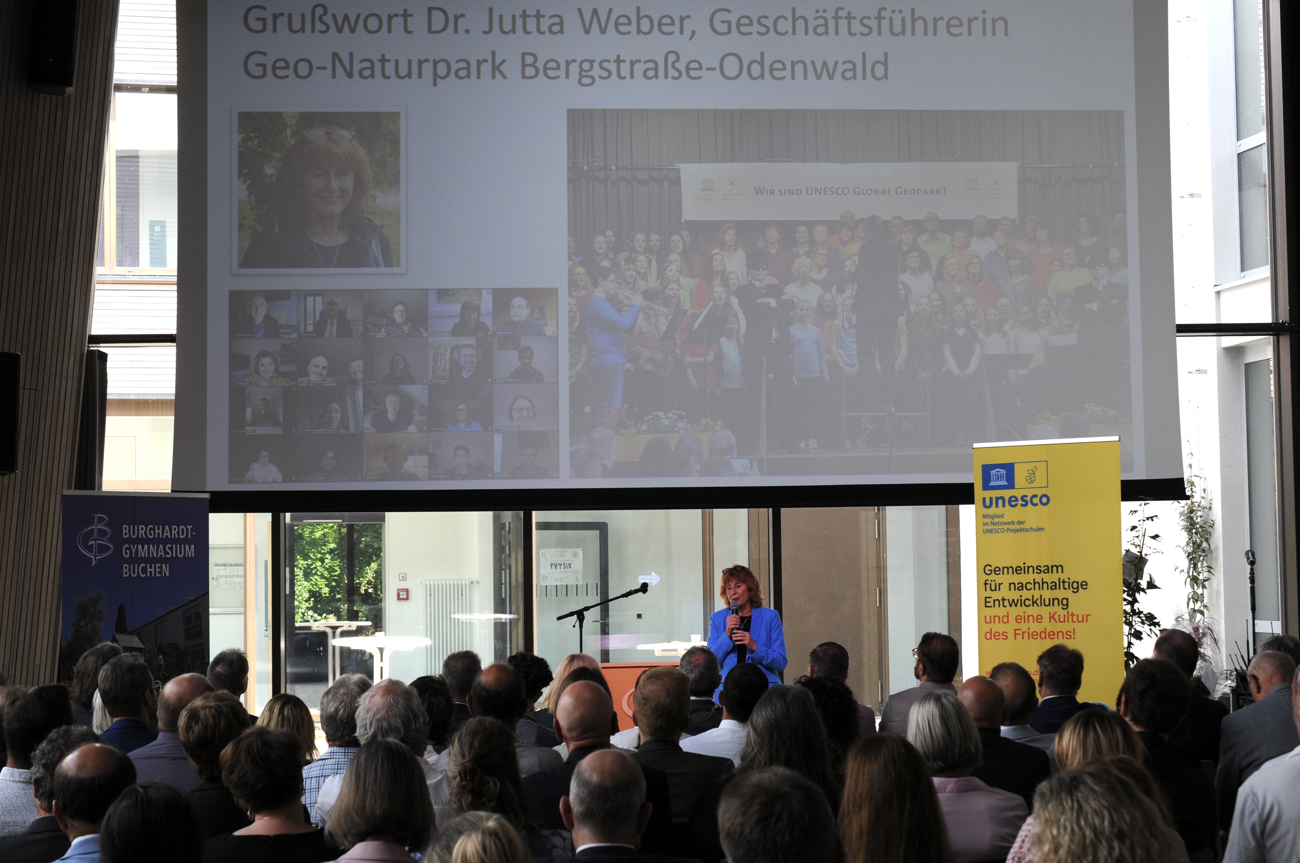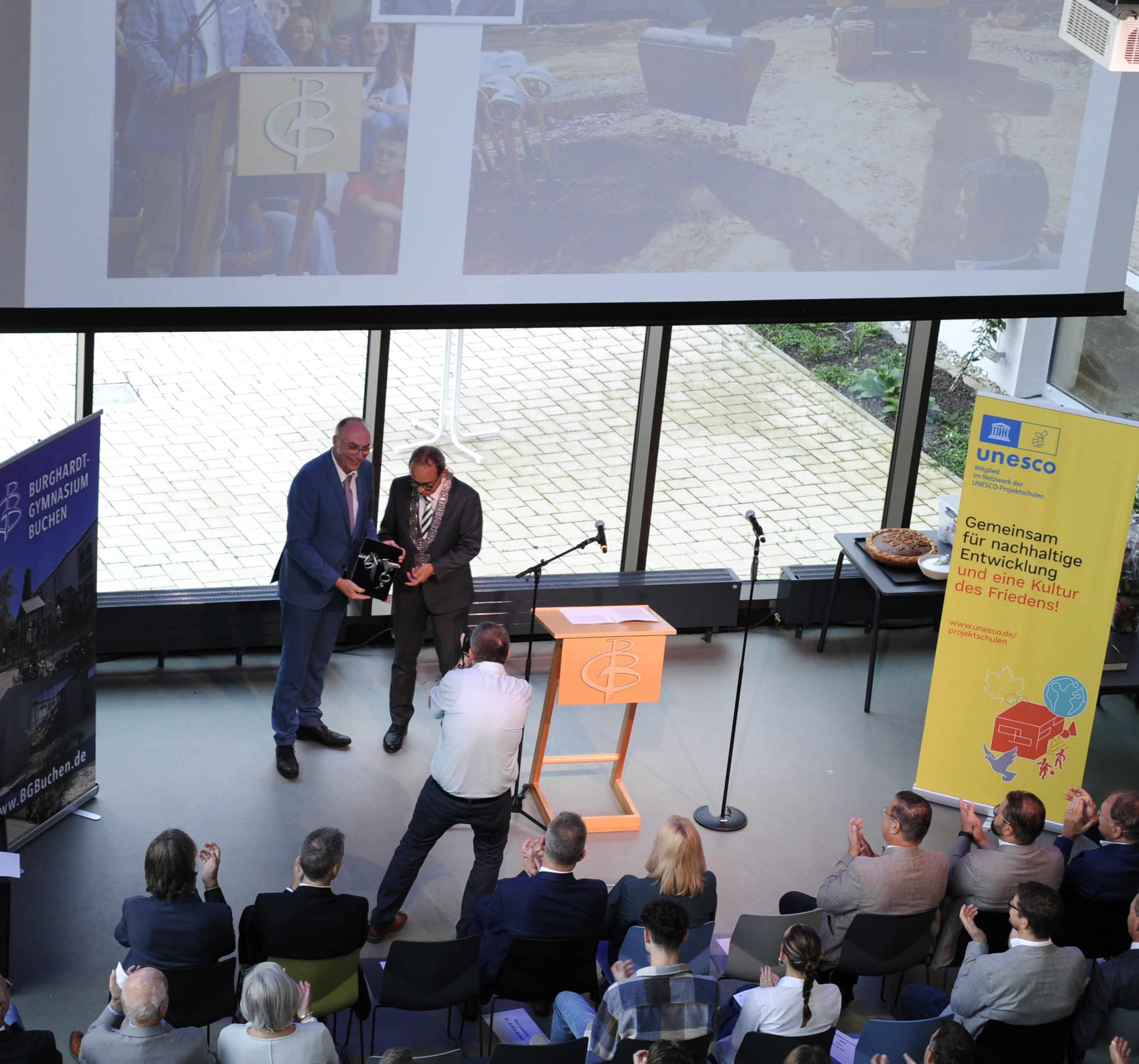 Dr. Jutta Weber vom Unesco-Geopark Bergstraße-Odenwald erinnerte an die Gründung der Geopark-AG 2004 und den damaligen Motor des Projekts, einen Lehrer namens Jochen Schwab. Die Kooperation werde vielfach mit Leben erfüllt und gipfele nun in der Anerkennung als Unesco-Projektschule. Dr. Dirk Laier, der Vorsitzende des Elternbeirats, blickte humorvoll auf die Bauzeit zurück. Statt schnöder Trakte verfüge das BGB nun über Flügel – wie ein Schloss. Bis es so weit war, mussten aber auch Rückschläge wie der Einsturz einer Rohbaudecke verkraftet werden. Statt „Buchens größte Baustelle“ wäre deshalb das Schlagwort „Bewahre Geduld Buchen“ treffender gewesen.