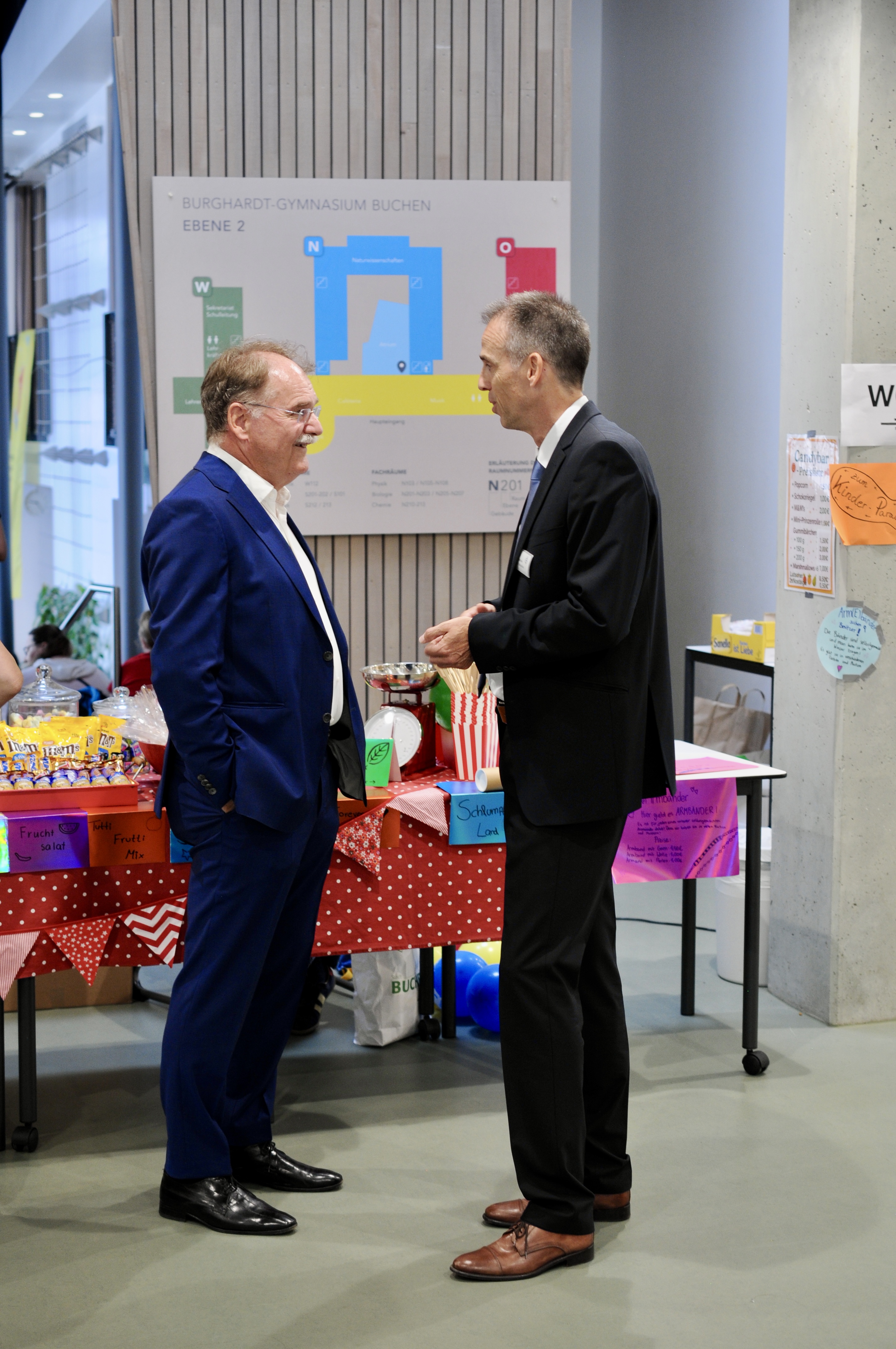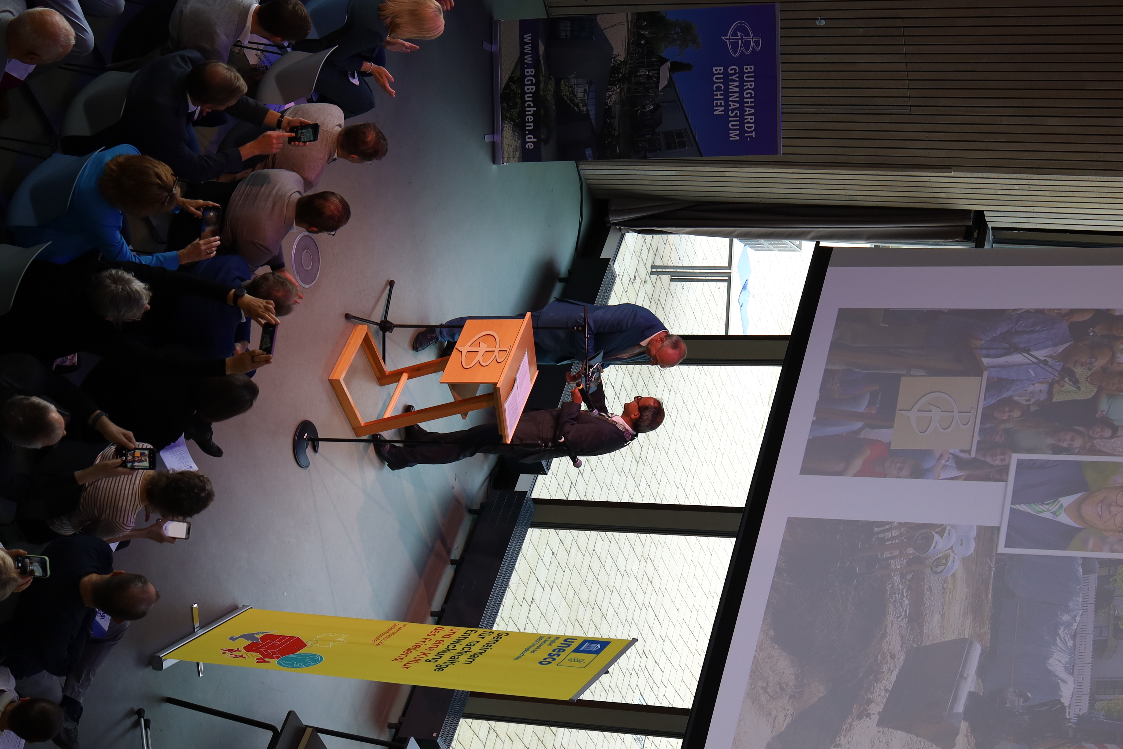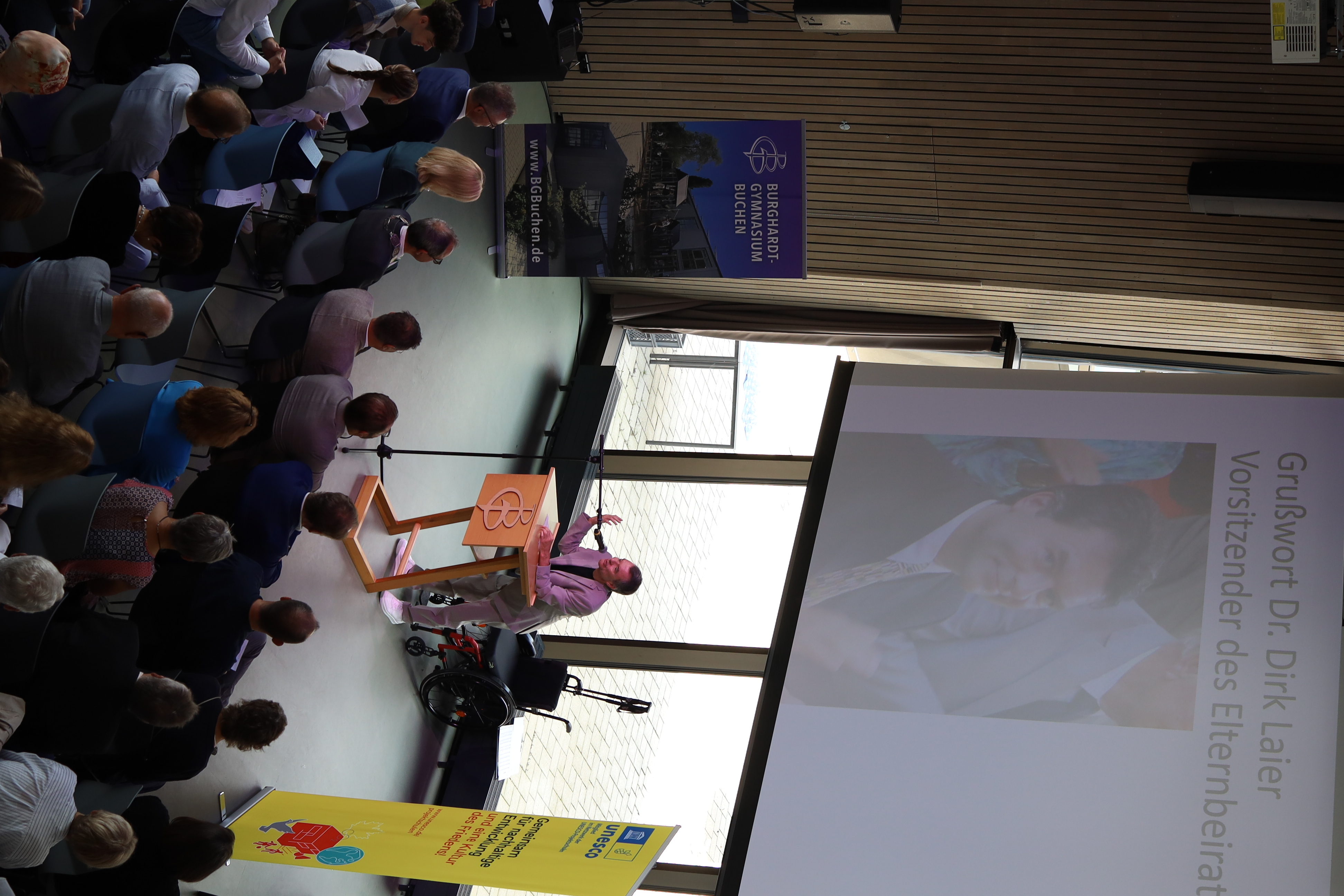 Dr. Jutta Weber vom Unesco-Geopark Bergstraße-Odenwald erinnerte an die Gründung der Geopark-AG 2004 und den damaligen Motor des Projekts, einen Lehrer namens Jochen Schwab. Die Kooperation werde vielfach mit Leben erfüllt und gipfele nun in der Anerkennung als Unesco-Projektschule. Dr. Dirk Laier, der Vorsitzende des Elternbeirats, blickte humorvoll auf die Bauzeit zurück. Statt schnöder Trakte verfüge das BGB nun über Flügel – wie ein Schloss. Bis es so weit war, mussten aber auch Rückschläge wie der Einsturz einer Rohbaudecke verkraftet werden. Statt „Buchens größte Baustelle“ wäre deshalb das Schlagwort „Bewahre Geduld Buchen“ treffender gewesen.