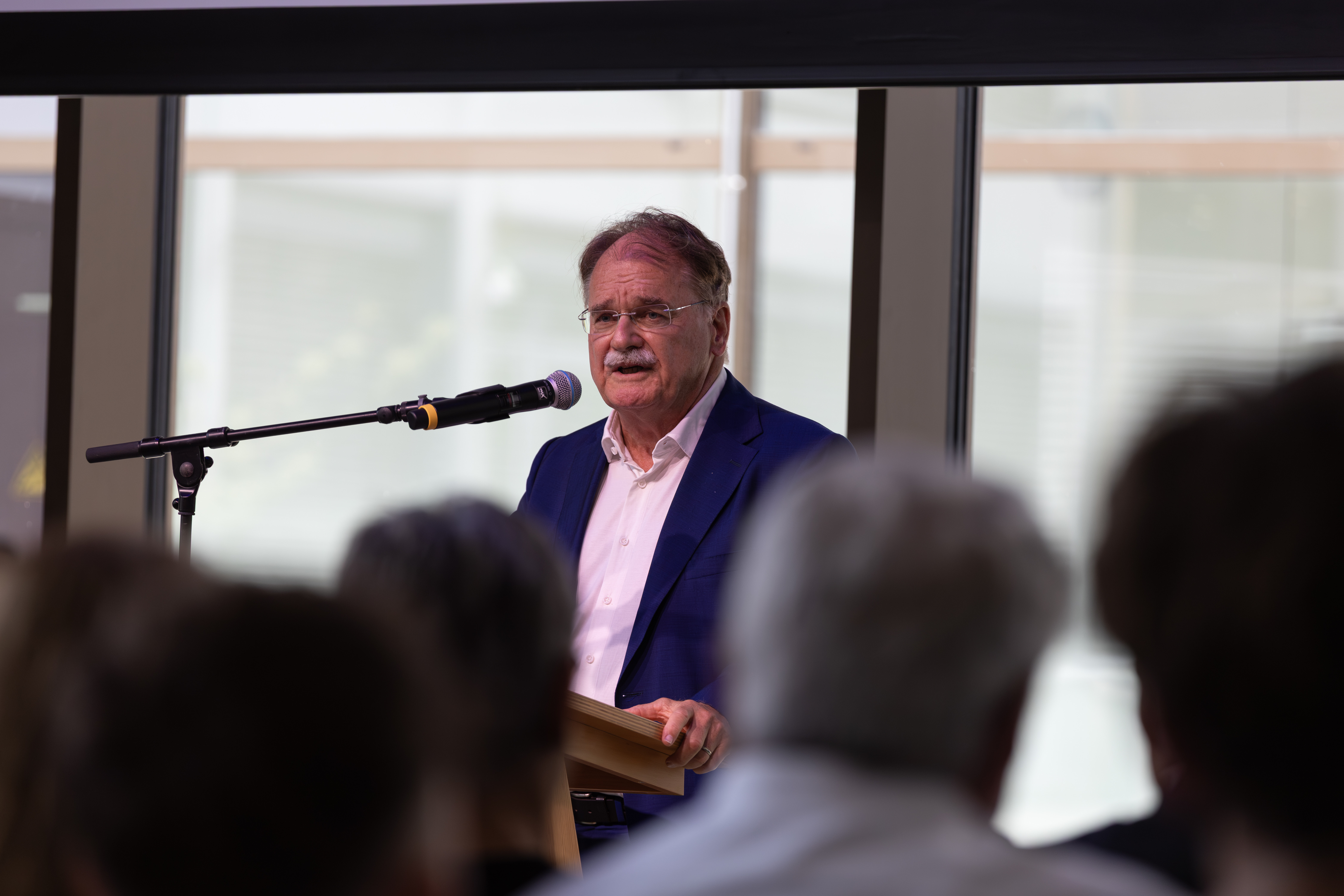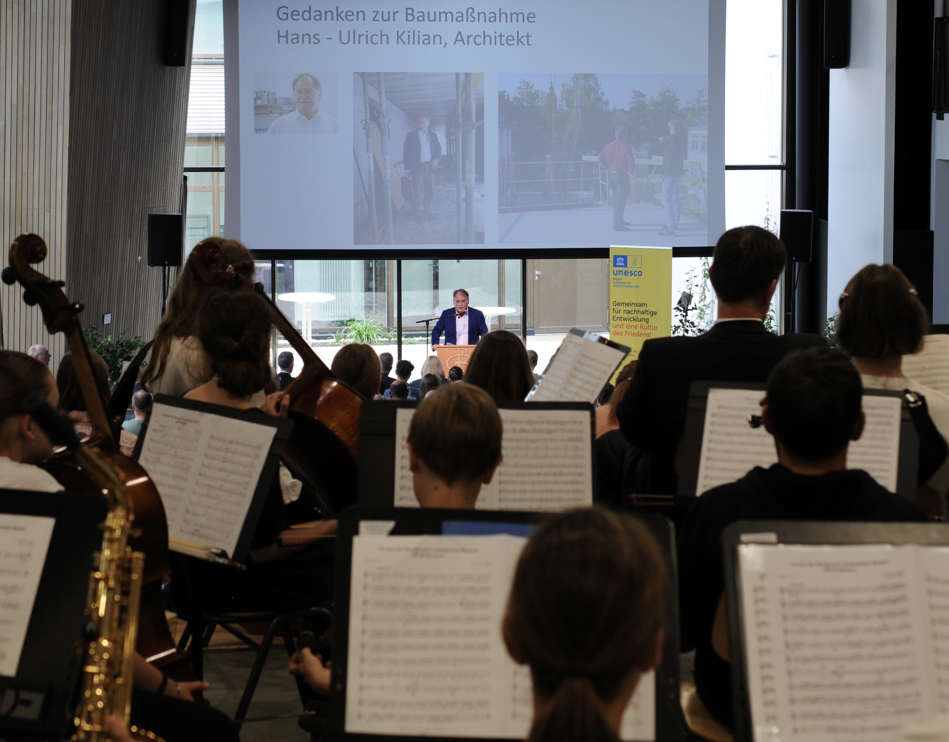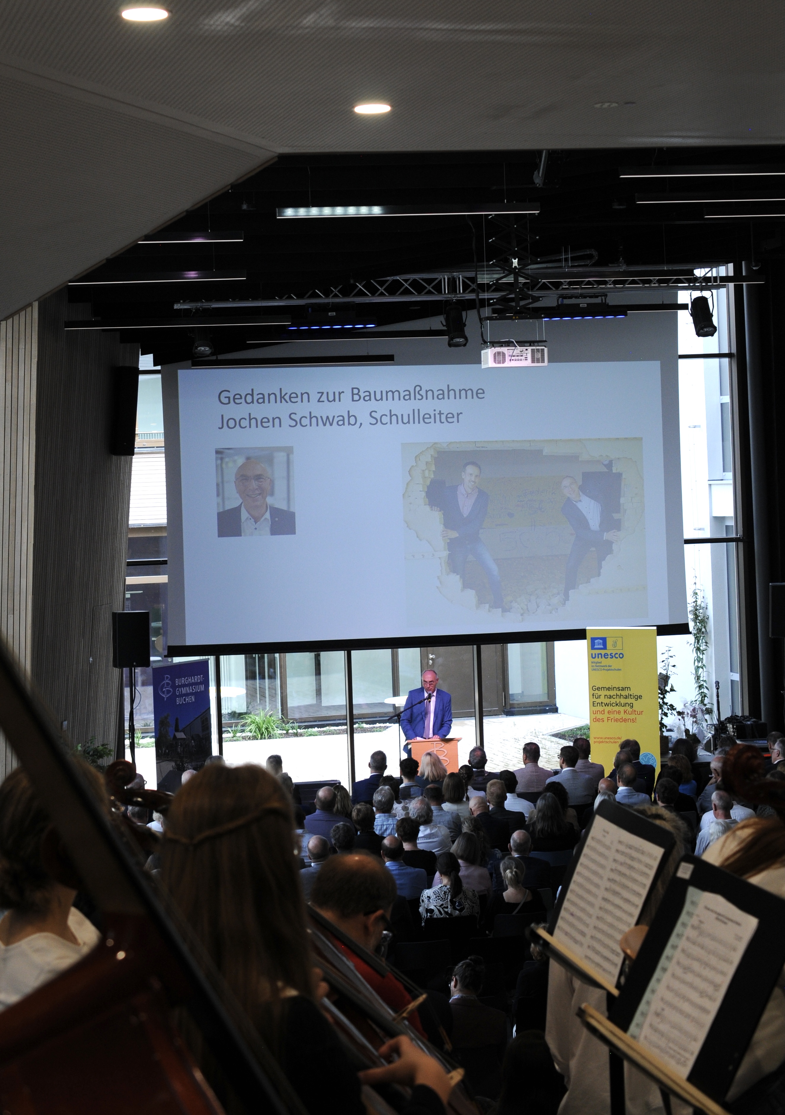 Spannende Einblicke in die Bauzeit ermöglichte ein Filmbeitrag der Kunst-AG unter Leitung von Balazs Nemethy. Architekt Prof. Hans-Ulrich Kilian (Stuttgart) blickte anschließend in Worten auf das „herausfordernde Projekt“ zurück. Aus Hiobsbotschaften wie der, dass Trakt II wegen schlechter Bausubstanz nicht zu halten sei, hätten sich Glücksfälle wie der neue dreistöckige Südflügel ergeben. Insgesamt sei ein Lehr- und Lernort geschaffen worden, der seinem Namen gerecht werde. „Wir haben nun eine moderne Schule auf optimalem Stand“, betonte Schulleiter Jochen Schwab, „und sind fit für die Herausforderungen der Zukunft.“ Auch er dankte allen Beteiligten, besonders aber den aktuell 1075 Schülern und 90 Lehrern sowie den Fördervereinen, die alle toll mitgezogen hätten: „Es war eine echte Gemeinschaftsleistung!“
