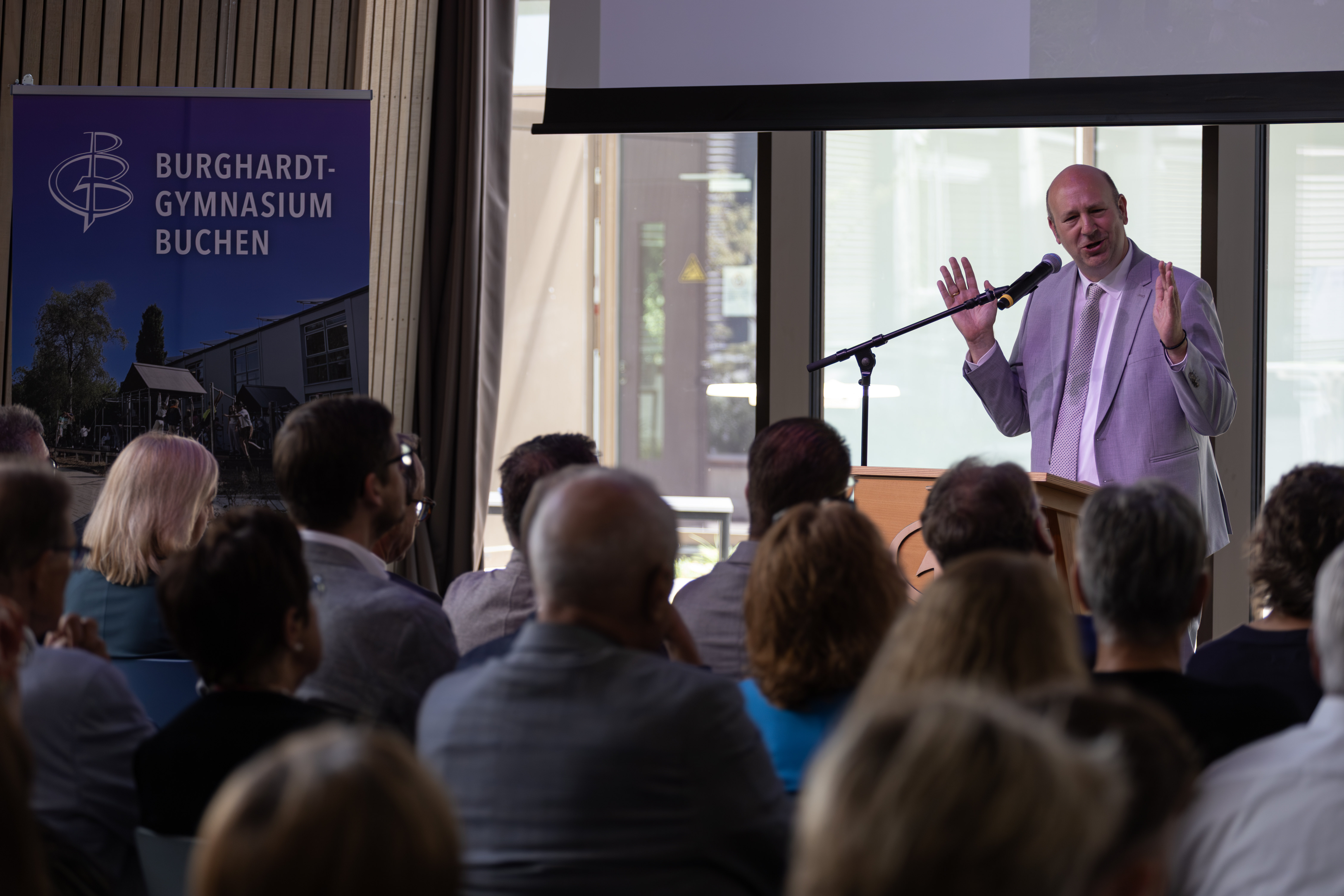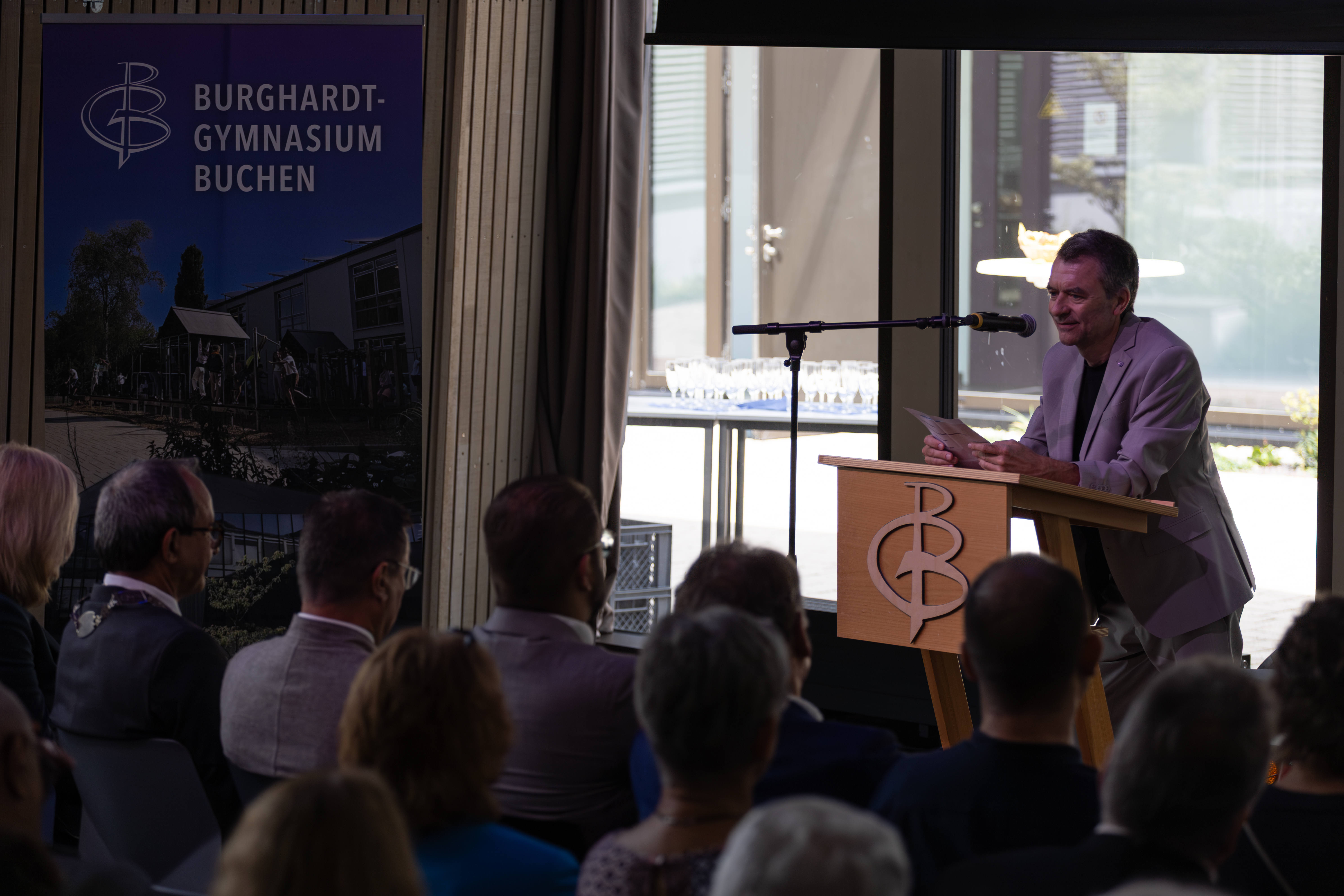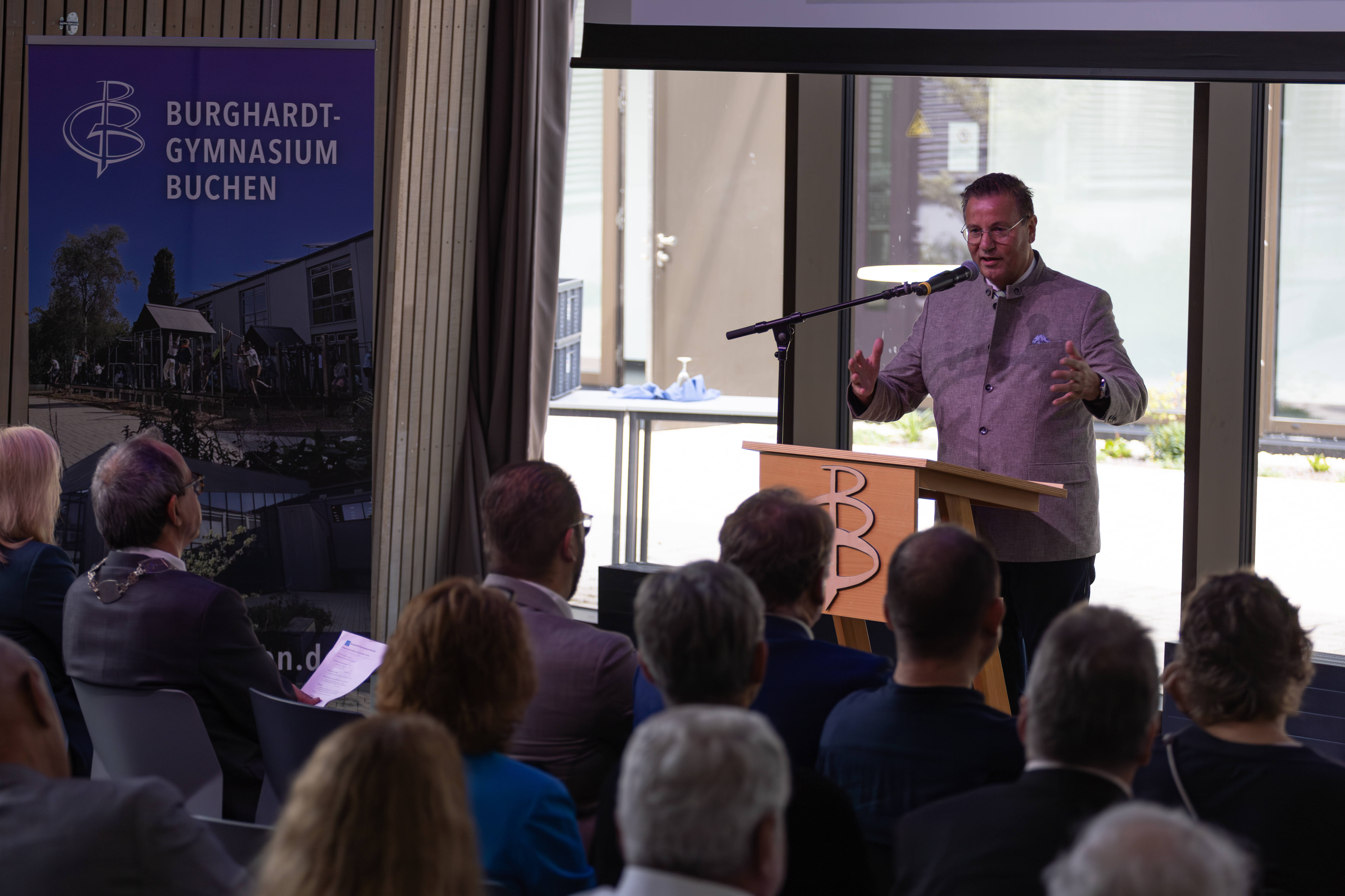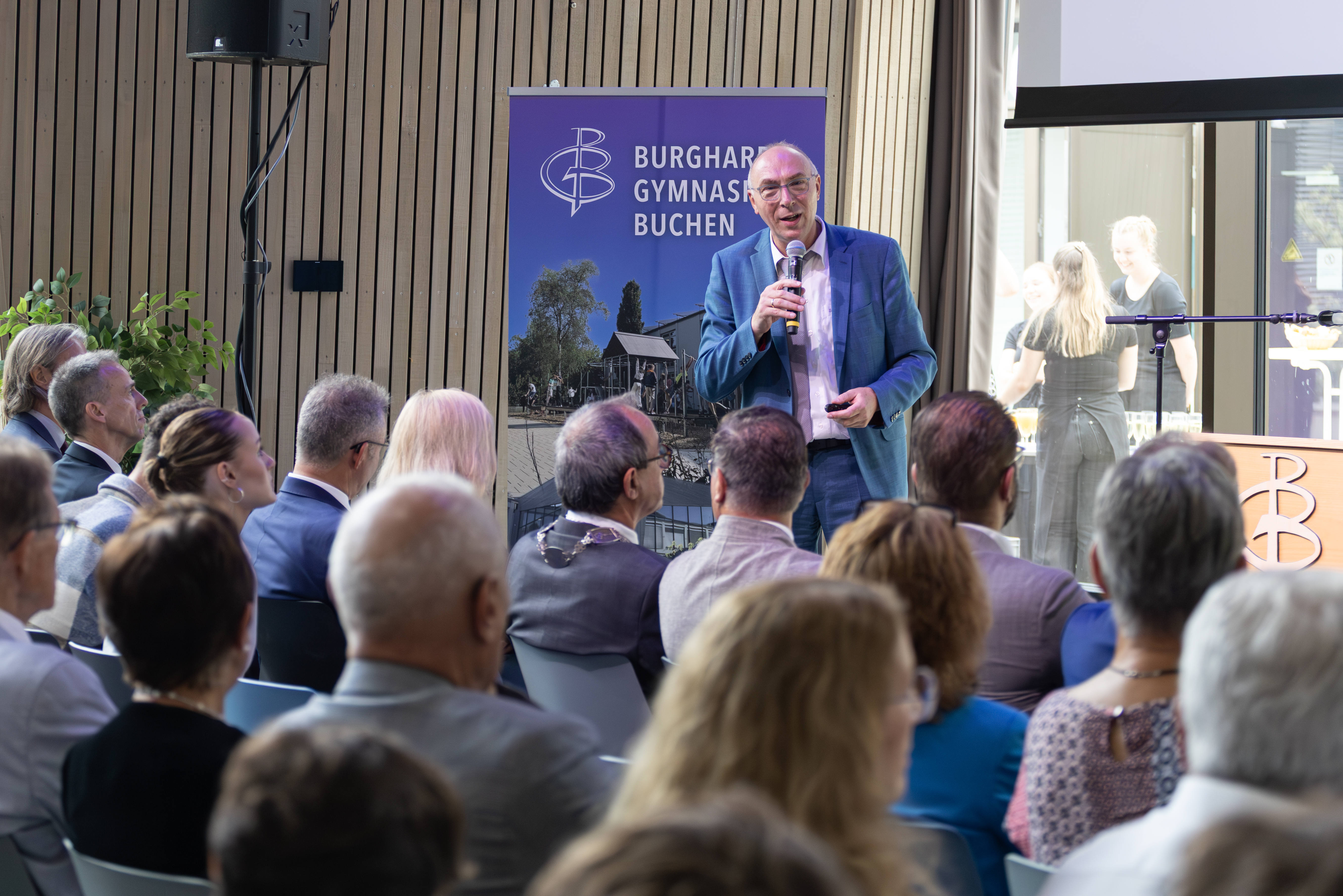 Der stimmgewaltige BGB-Chor eröffnete das Programm mit dem Lied „Glaubst du“ von „Provinz“, ehe Bürgermeister Roland Burger auf die „größte Baustelle, die Buchen je gestemmt hat“ zurückblickte (die RNZ berichtete ausführlich). Eine chronische Raumnot durch steigende Schülerzahlen und ein hoher Sanierungsbedarf der zwischen 1958 und 1973 errichteten Gebäude seien ausschlaggebend für das Großprojekt gewesen. Nach sechs Jahren mit Höhen und Tiefen gebe es nun einen glücklichen Abschluss. Das Ergebnis sei ein „Quantensprung für das BGB“. Von den 33 Millionen Euro Baukosten trage die Stadt 20 Millionen selbst. Die deutlichen Kostensteigerungen gegenüber der ursprünglichen Planung seien durch Corona, Preisexplosionen am Bau und Auftragserweiterungen zu erklären: „Bei einem Umbau gibt es immer Überraschungen in der Substanz.“