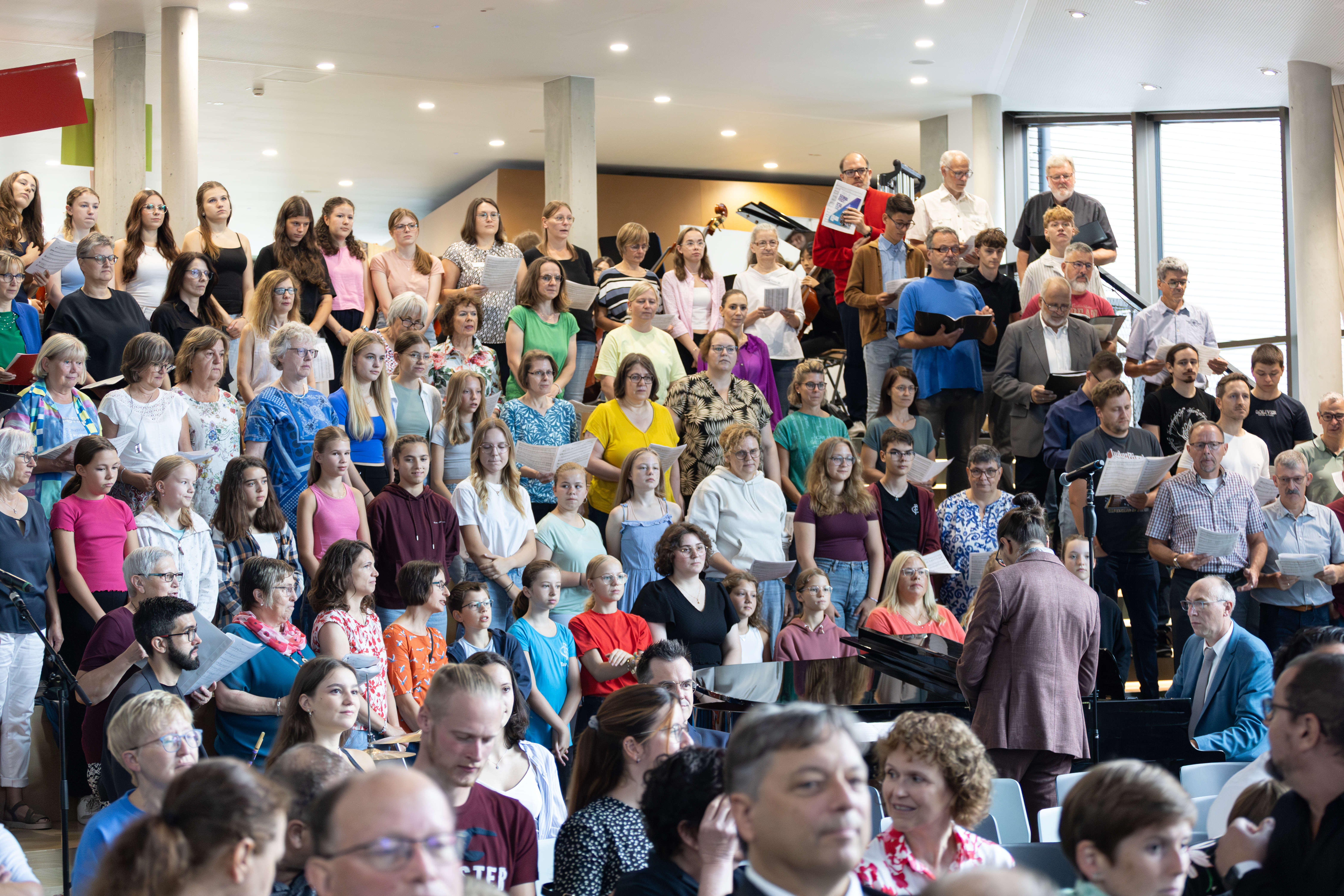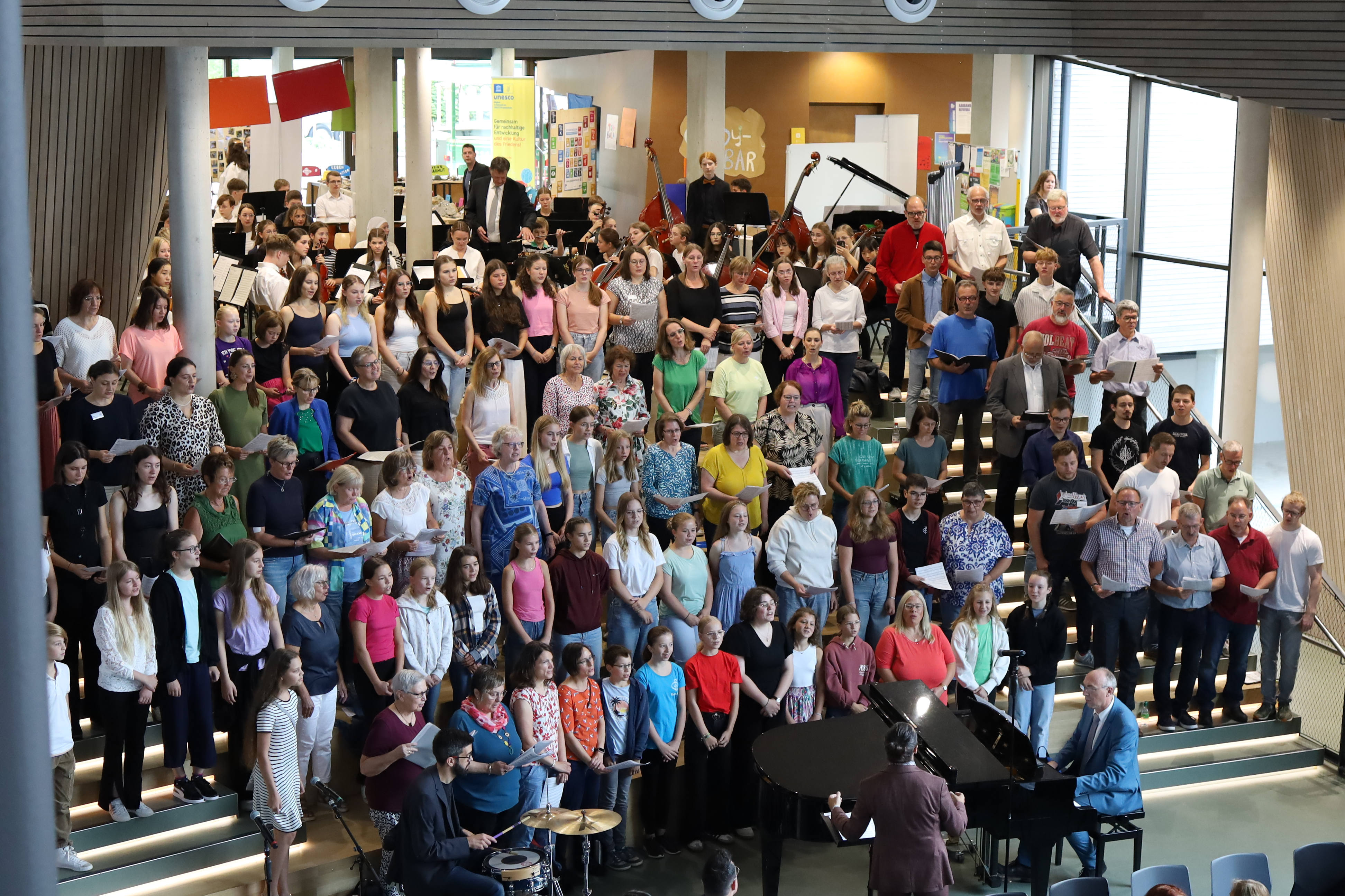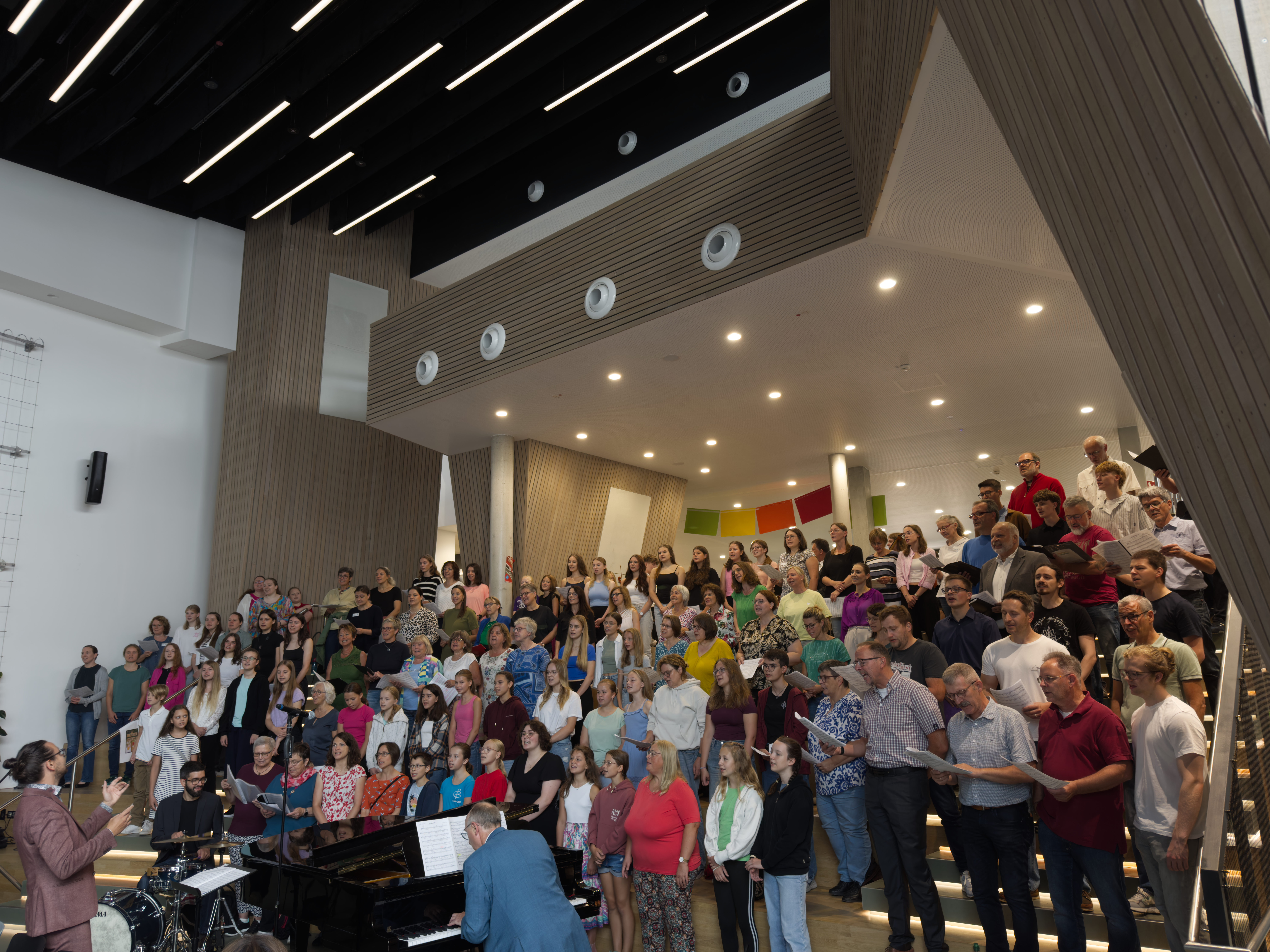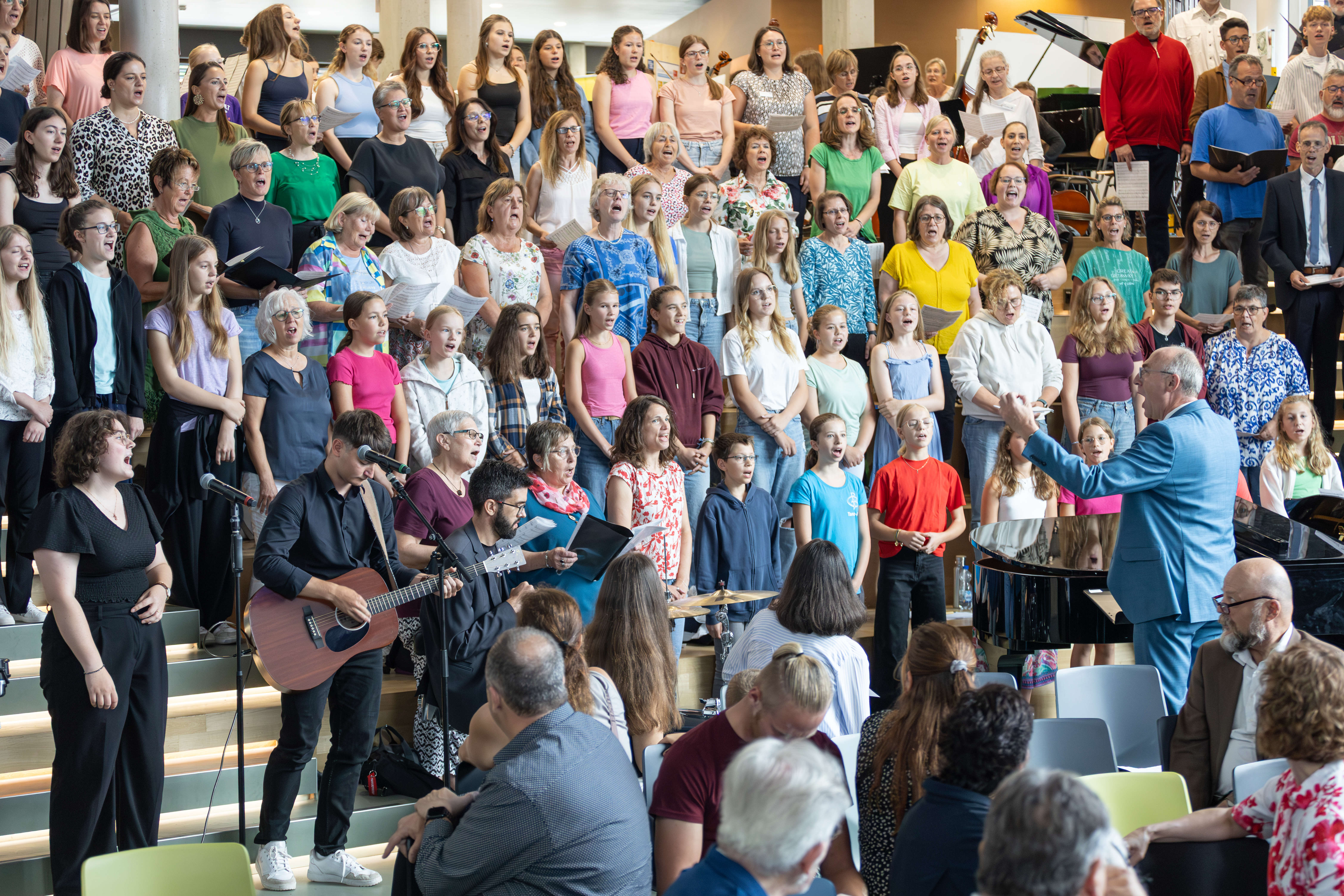 Der stimmgewaltige BGB-Chor eröffnete das Programm mit dem Lied „Glaubst du“ von „Provinz“, ehe Bürgermeister Roland Burger auf die „größte Baustelle, die Buchen je gestemmt hat“ zurückblickte (die RNZ berichtete ausführlich). Eine chronische Raumnot durch steigende Schülerzahlen und ein hoher Sanierungsbedarf der zwischen 1958 und 1973 errichteten Gebäude seien ausschlaggebend für das Großprojekt gewesen. Nach sechs Jahren mit Höhen und Tiefen gebe es nun einen glücklichen Abschluss. Das Ergebnis sei ein „Quantensprung für das BGB“. Von den 33 Millionen Euro Baukosten trage die Stadt 20 Millionen selbst. Die deutlichen Kostensteigerungen gegenüber der ursprünglichen Planung seien durch Corona, Preisexplosionen am Bau und Auftragserweiterungen zu erklären: „Bei einem Umbau gibt es immer Überraschungen in der Substanz.“