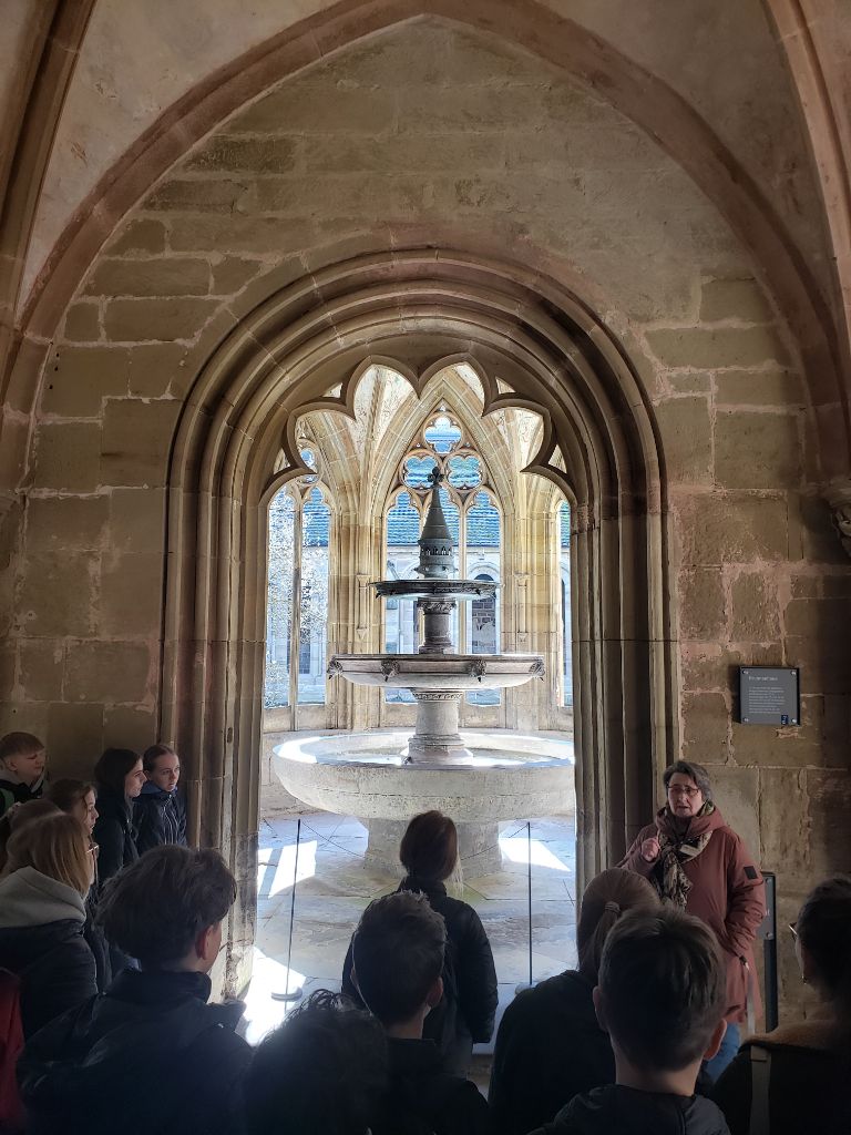 Zuerst wurden wir durch den berühmten Kreuzgang geführt, einen überdachten Säulengang, der die verschiedenen Teile des Klosters miteinander verbindet. Danach sahen wir einen Brunnen, aus dem das Wasser wie vor hunderten von Jahren herausplätscherte. Unsere Gruppenführerin erklärte uns, dass die Mönche hier im Kloster nicht nur gebetet haben, sondern dass es wie eine kleine Stadt war mit Werkstätten, Wohnbereichen und sogar einer Schule. Das Internat gibt es sogar heute noch, man kann es ab der 9. Klasse besuchen. Außerdem lernten wir, dass die Zisterzienser nach der Regel „ora et labora“ lebten, was soviel heißt wie „bete und arbeite.“ Wenn man die Säulen, die kunstvollen Fenster mit den feinen Verzierungen und die hohen Decken sieht, merkt man, wie viel Arbeit und handwerkliches Geschick dahintersteckt. Ohne moderne Maschinen wie Bagger oder Kräne, die uns heutzutage helfen, ist das für uns kaum vorstellbar. Die Mönche waren damals schon echte Technikexperten. Sie entwickelten zum Beispiel Bewässerungssysteme für ihre Felder oder nutzten die Wasserkraft, um das Getreide zu mahlen. Das zeigt, dass die Mönche sehr erfinderisch waren und dass der Fortschritt und der Glaube schon zusammengehörten.