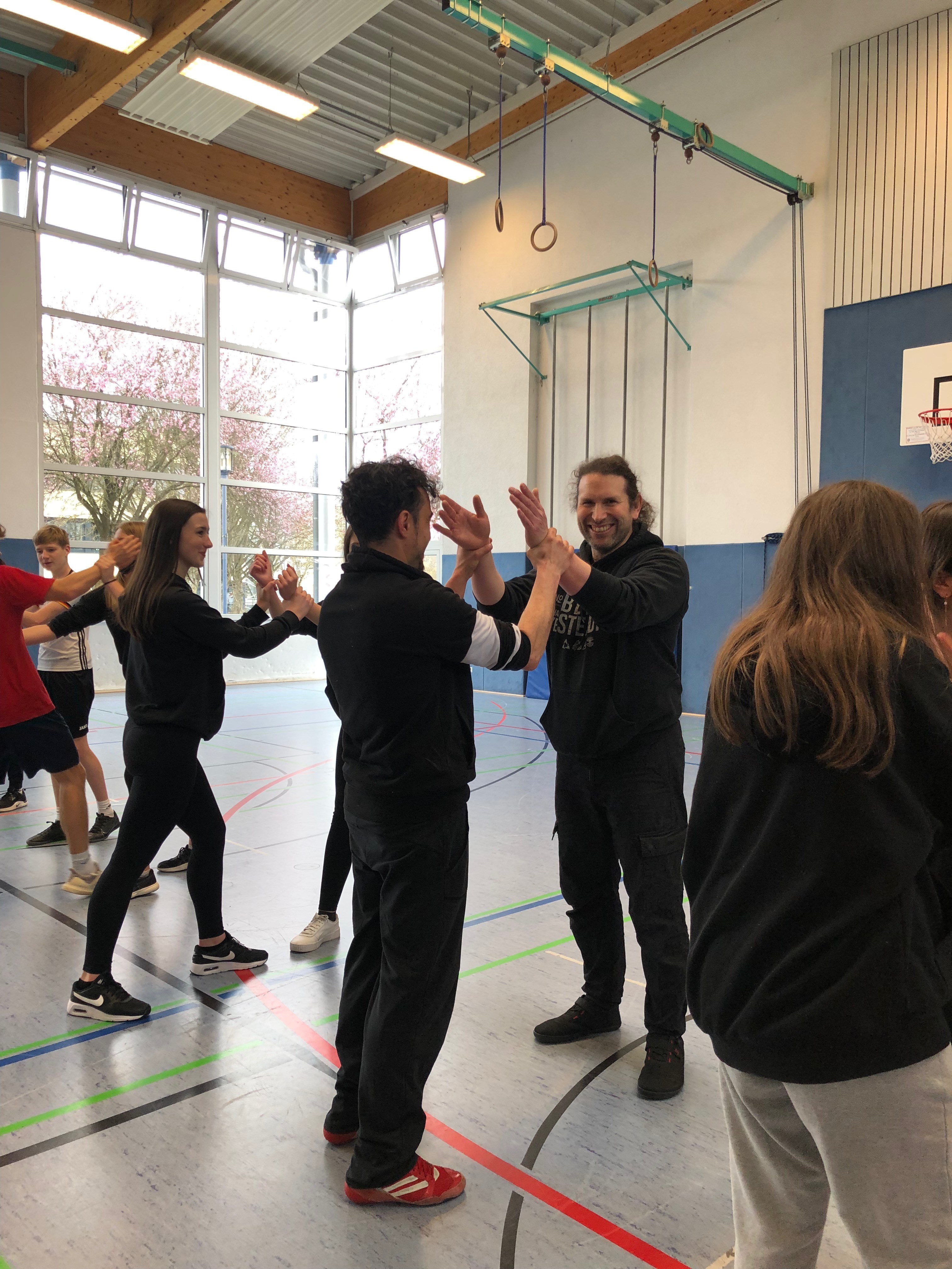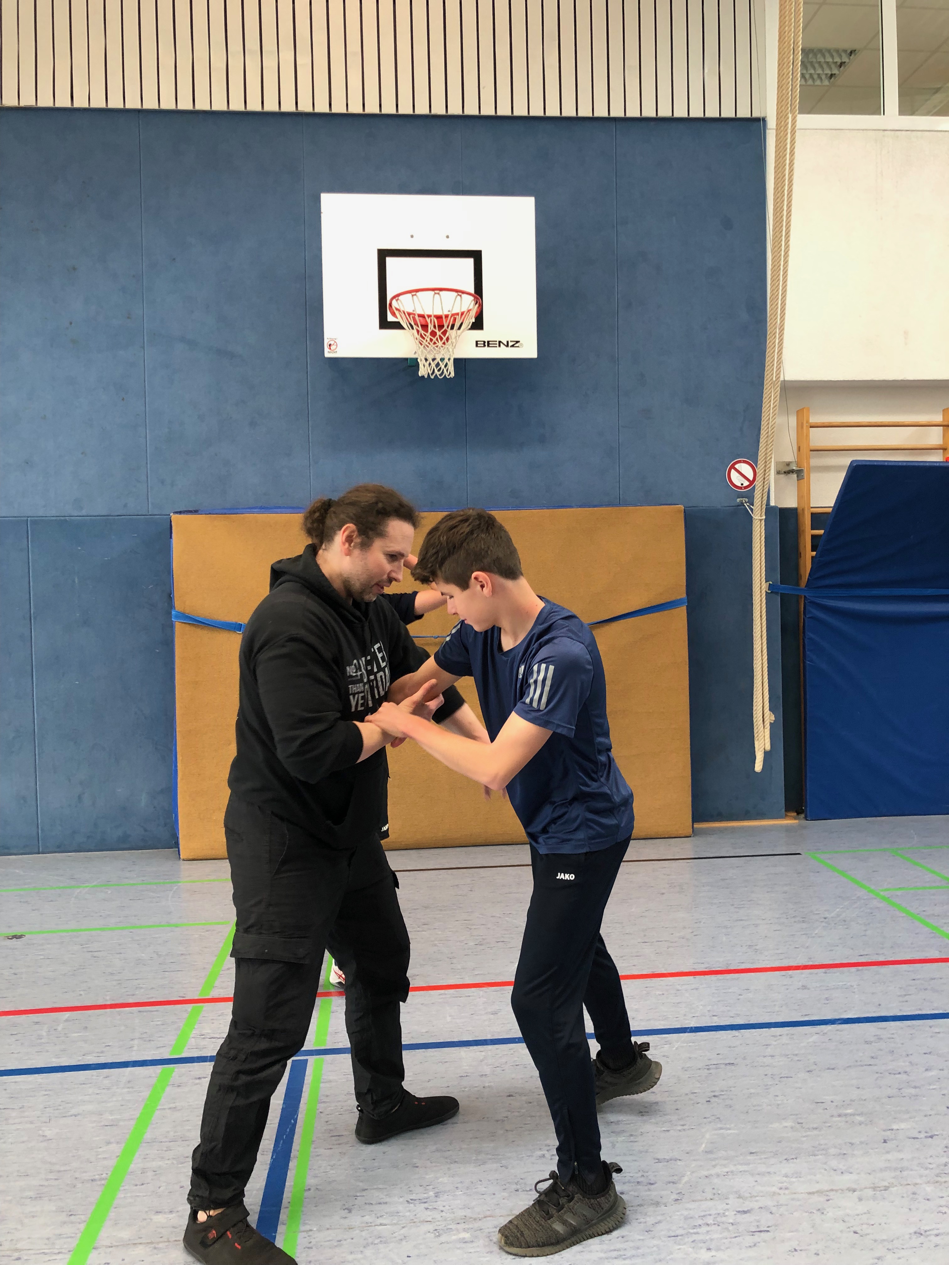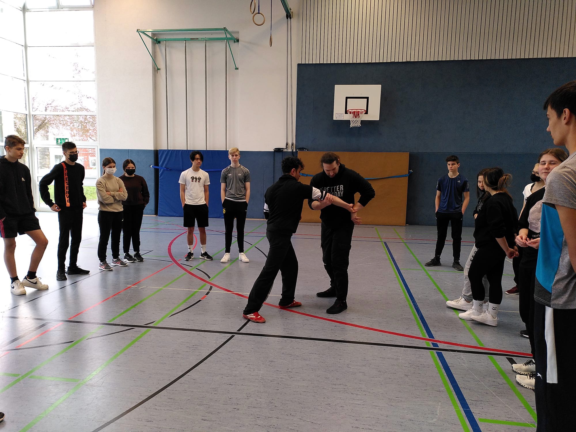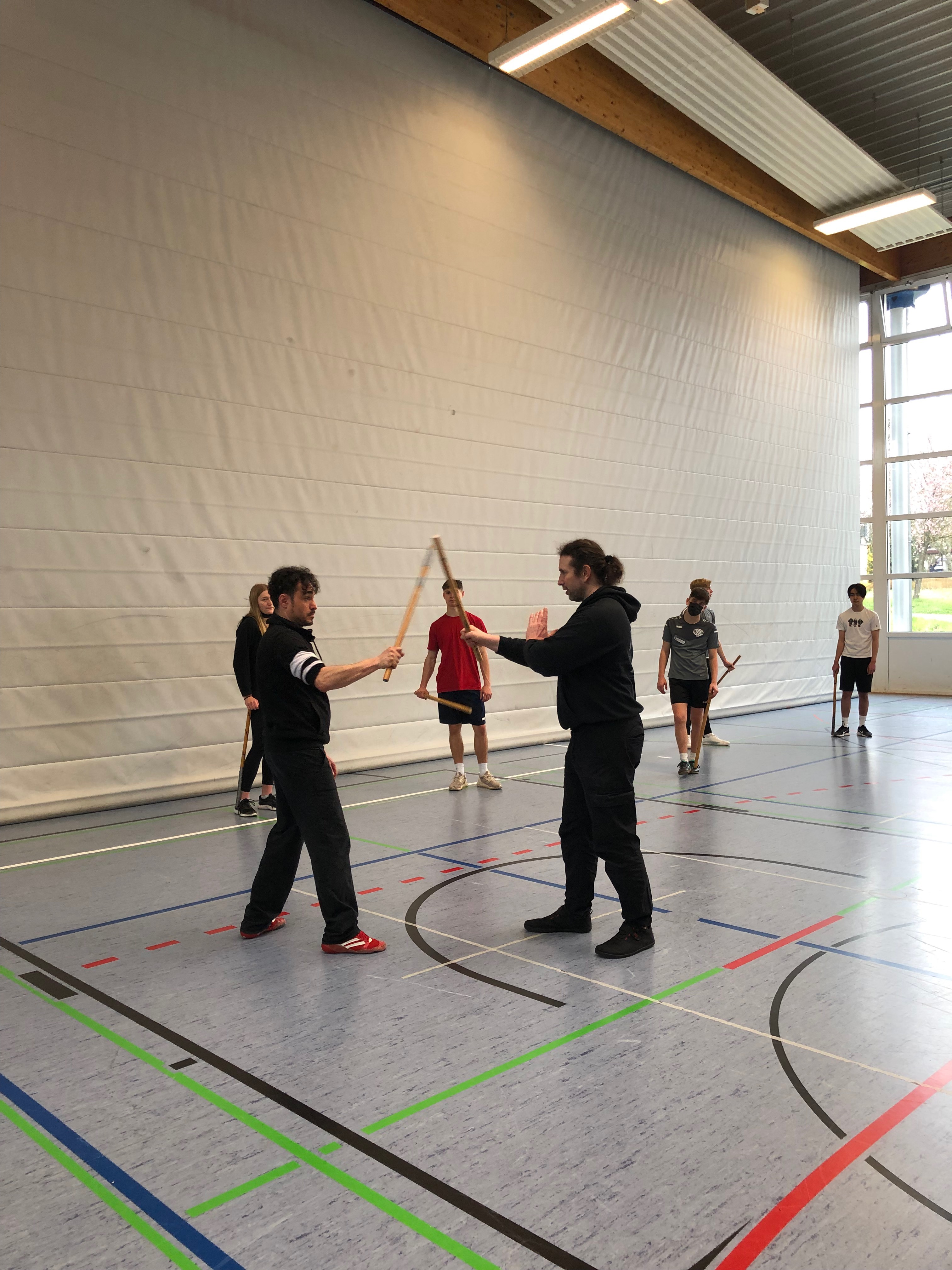 Mit dem Ziel, das Selbstvertrauen der Schüler*innen zu stärken und ihnen Techniken zur Selbstverteidigung an die Hand zu geben, bot Bernd Altenhöfer, der seit vielen Jahren als Kampfsportlehrer tätig ist, einen Workshop zu Stockkampf und Selbstverteidigung an. Anfangs gab er den Teilnehmer*innen vor allem Strategien zur friedlichen Abwehr an die Hand, während er im Verlauf des Workshops die Eskalationsstufen weiter mit ihnen besprach und ihnen Fertigkeiten zur Verteidigung für diverse Situationen an die Hand gab.