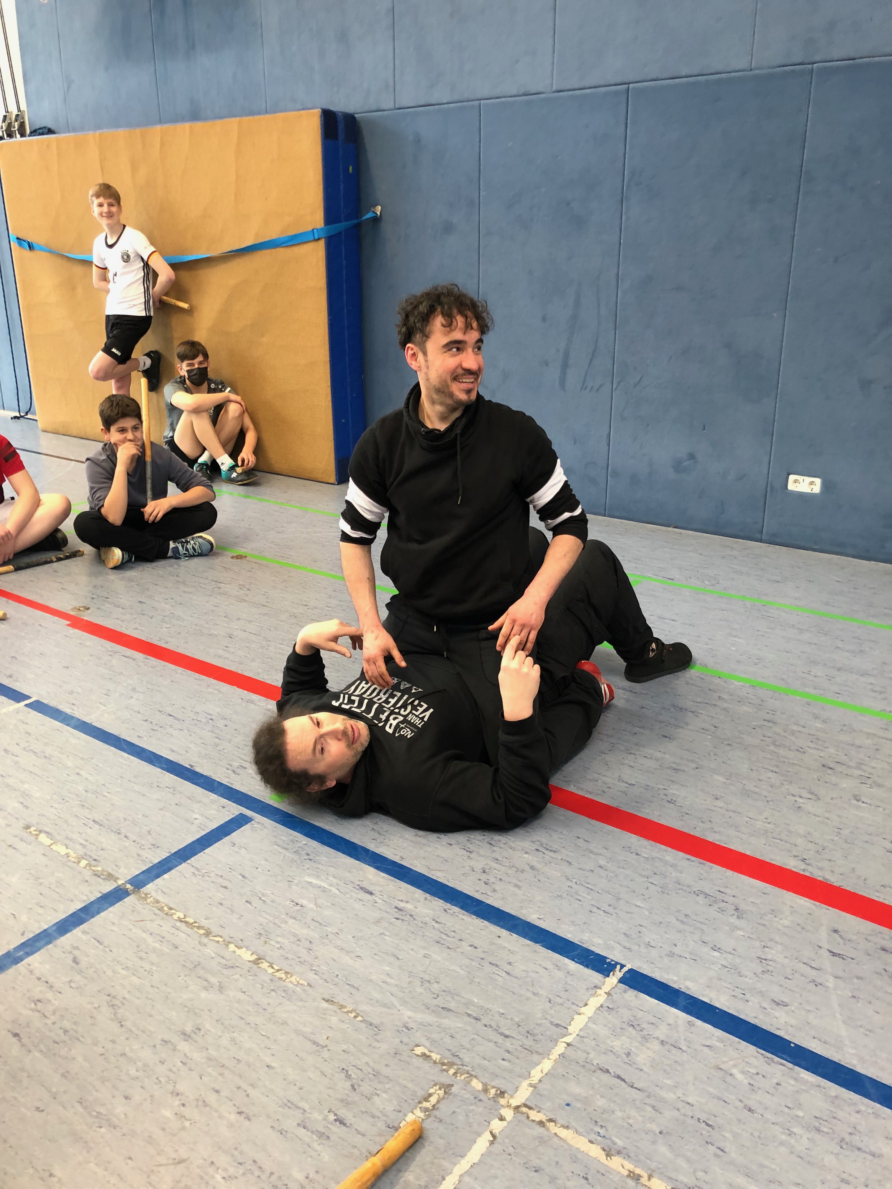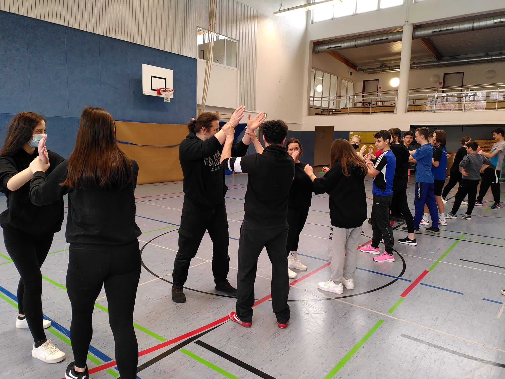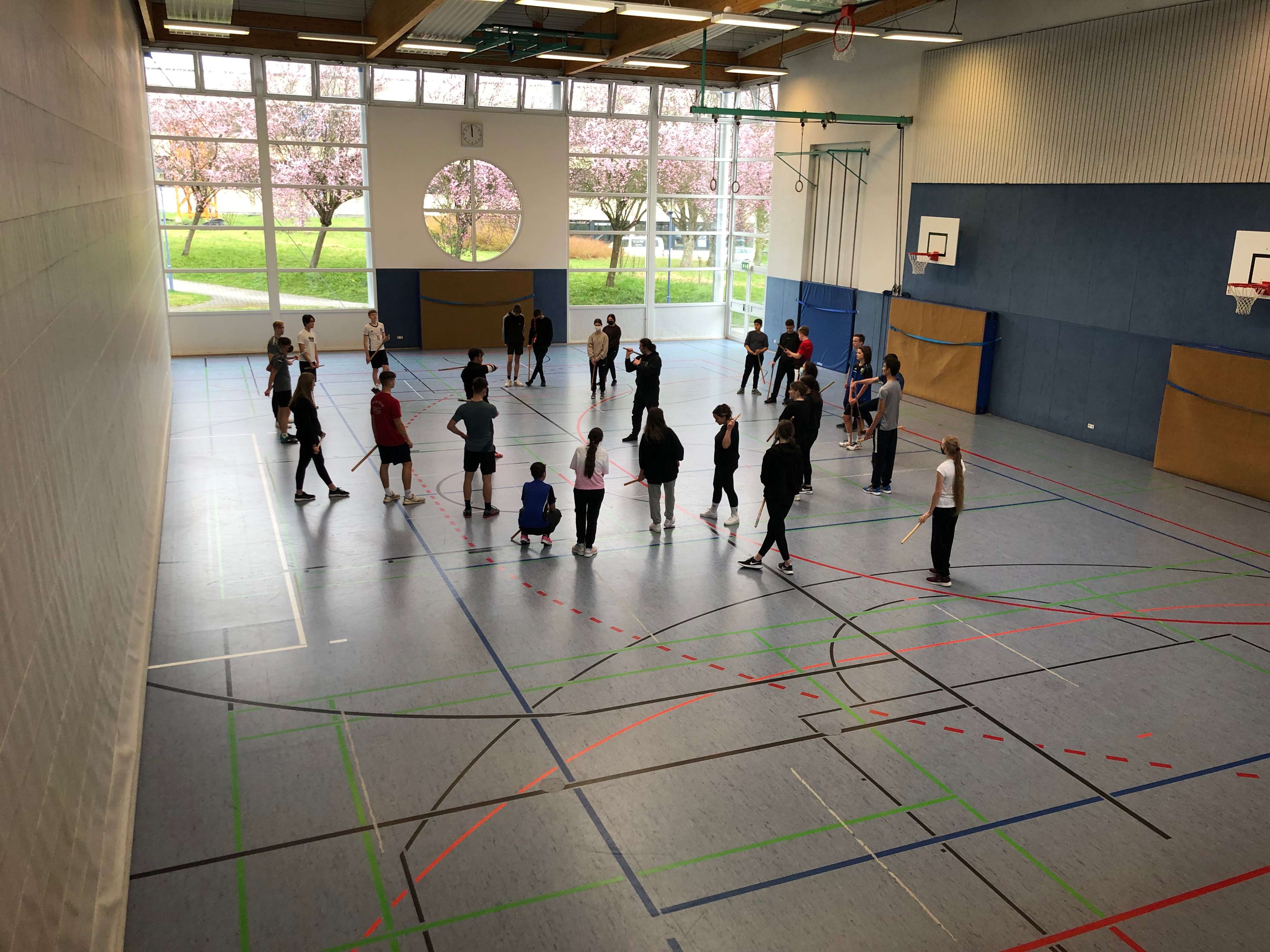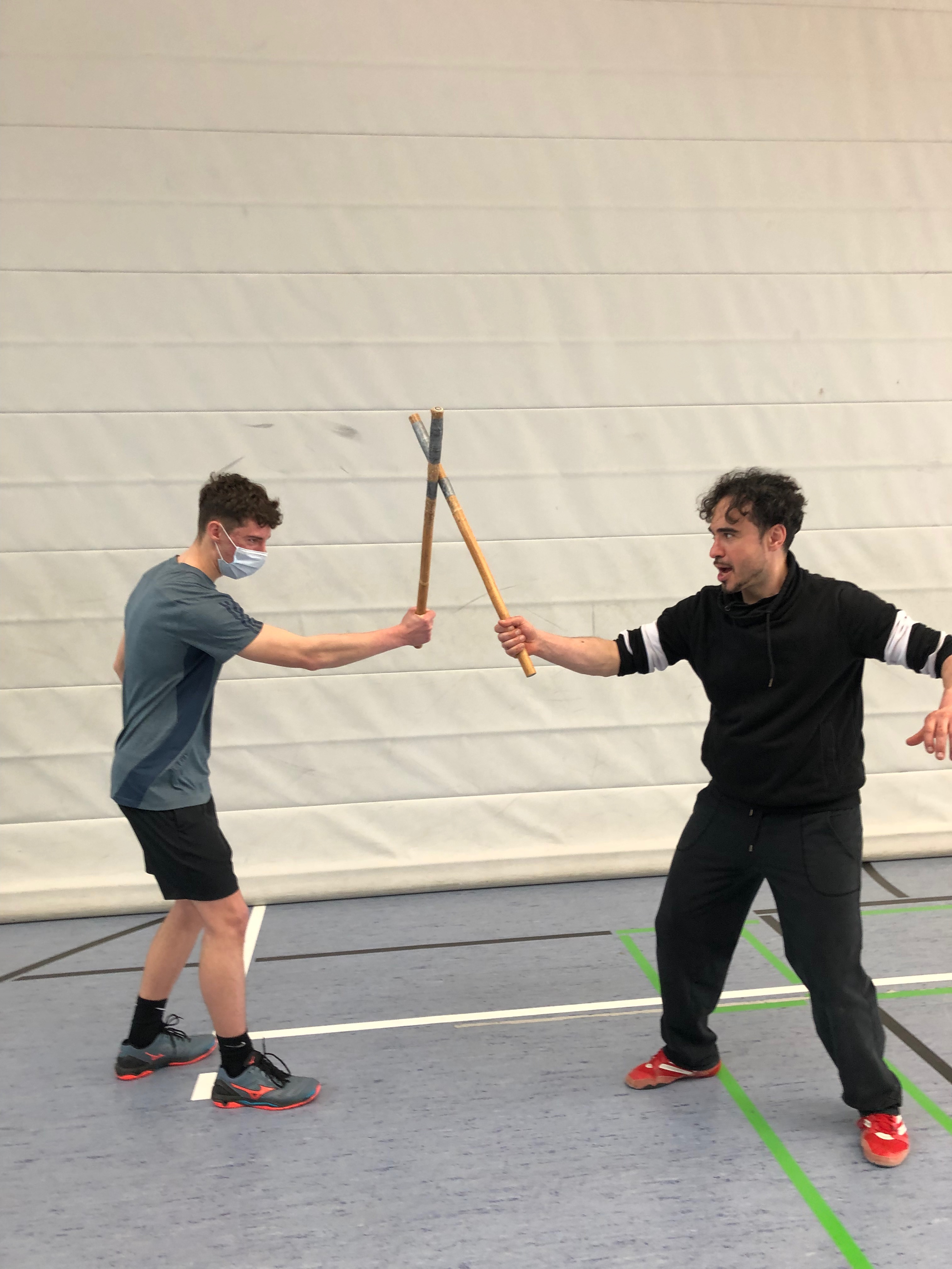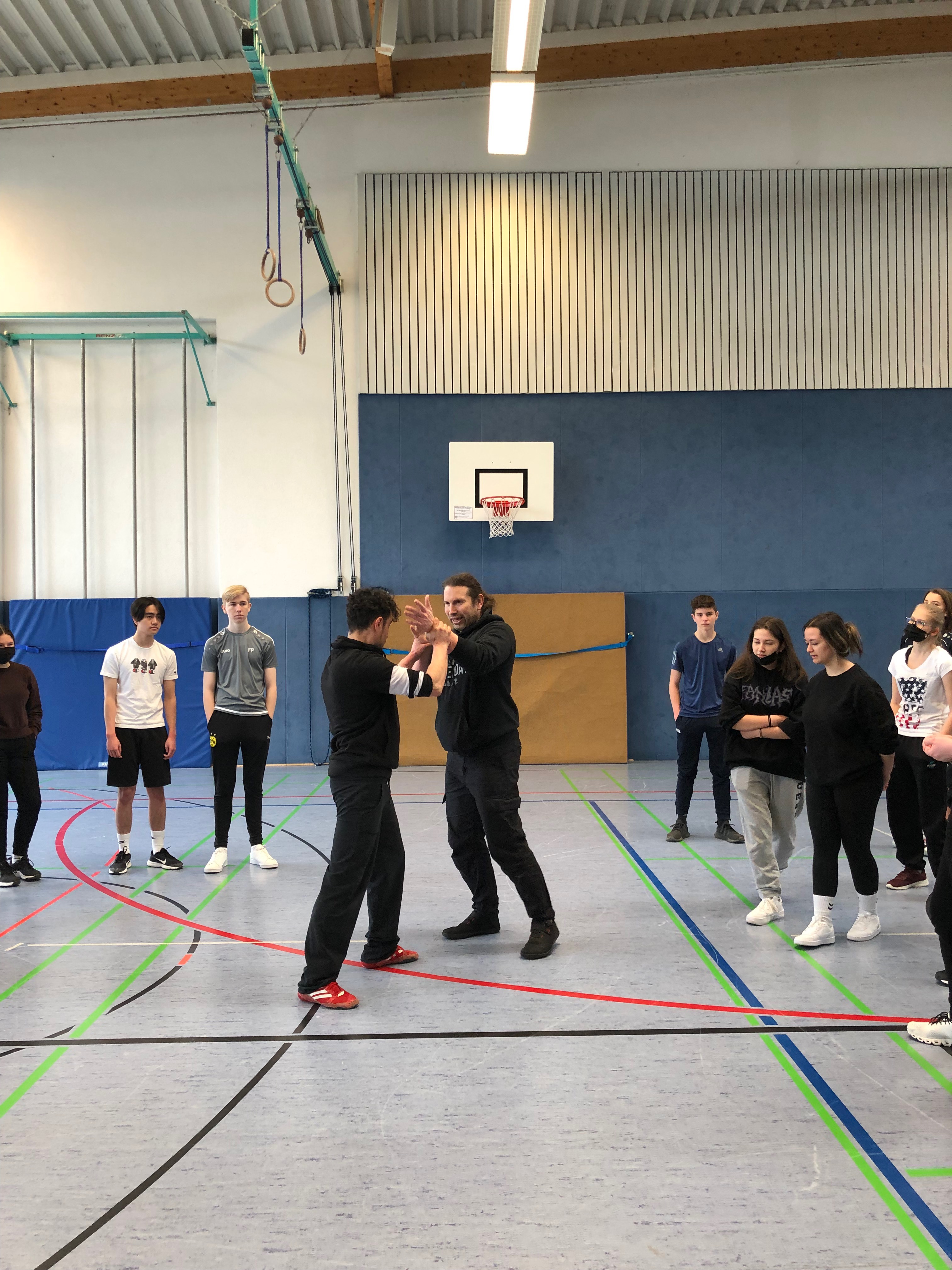 Mit dem Ziel, das Selbstvertrauen der Schüler*innen zu stärken und ihnen Techniken zur Selbstverteidigung an die Hand zu geben, bot Bernd Altenhöfer, der seit vielen Jahren als Kampfsportlehrer tätig ist, einen Workshop zu Stockkampf und Selbstverteidigung an. Anfangs gab er den Teilnehmer*innen vor allem Strategien zur friedlichen Abwehr an die Hand, während er im Verlauf des Workshops die Eskalationsstufen weiter mit ihnen besprach und ihnen Fertigkeiten zur Verteidigung für diverse Situationen an die Hand gab.