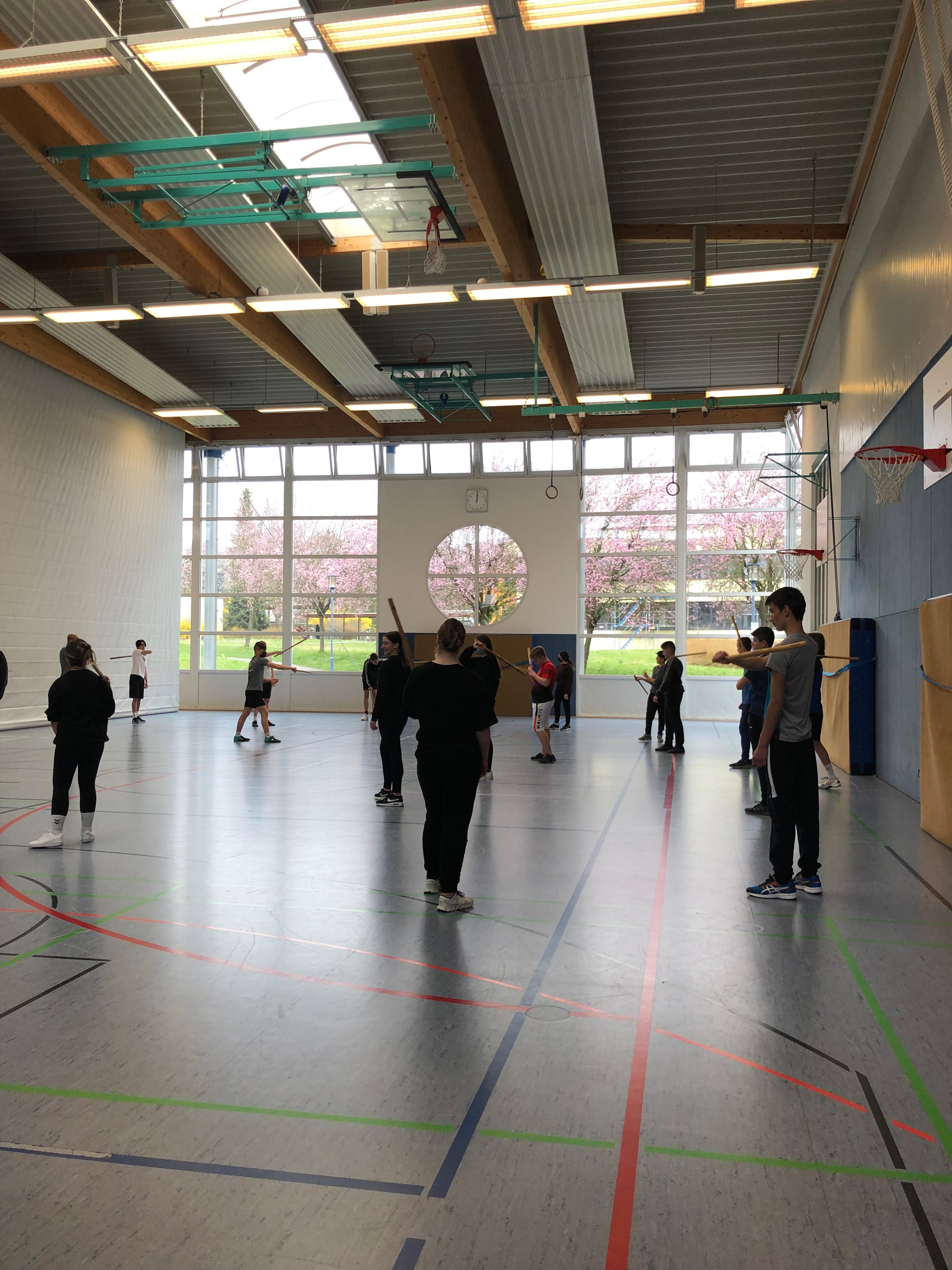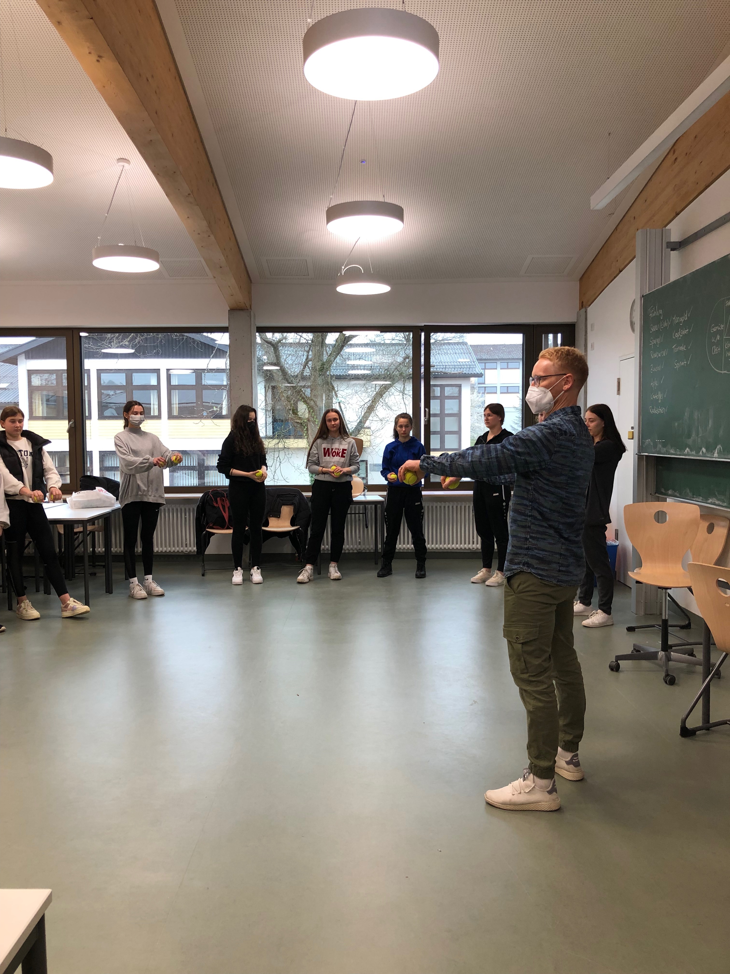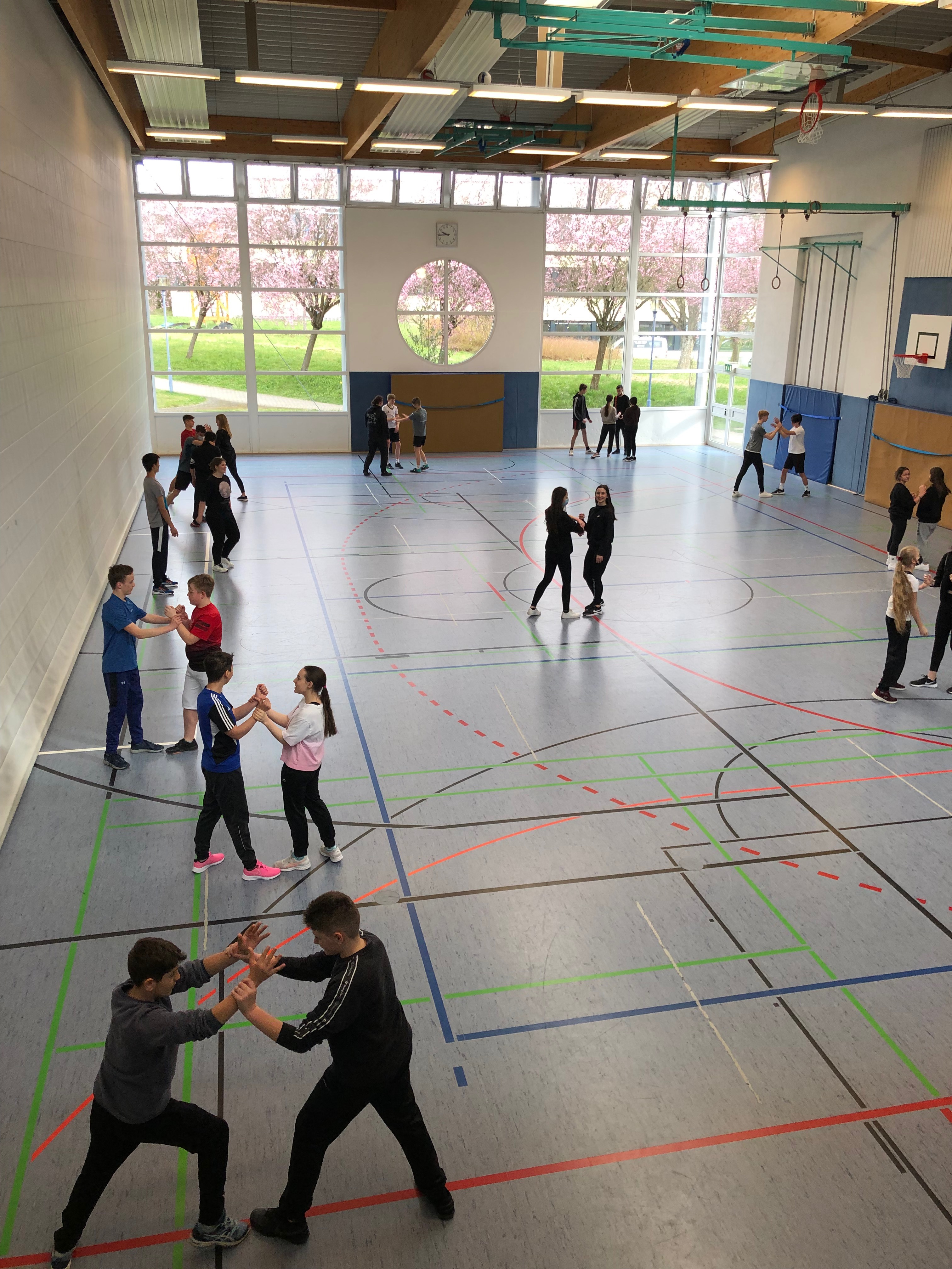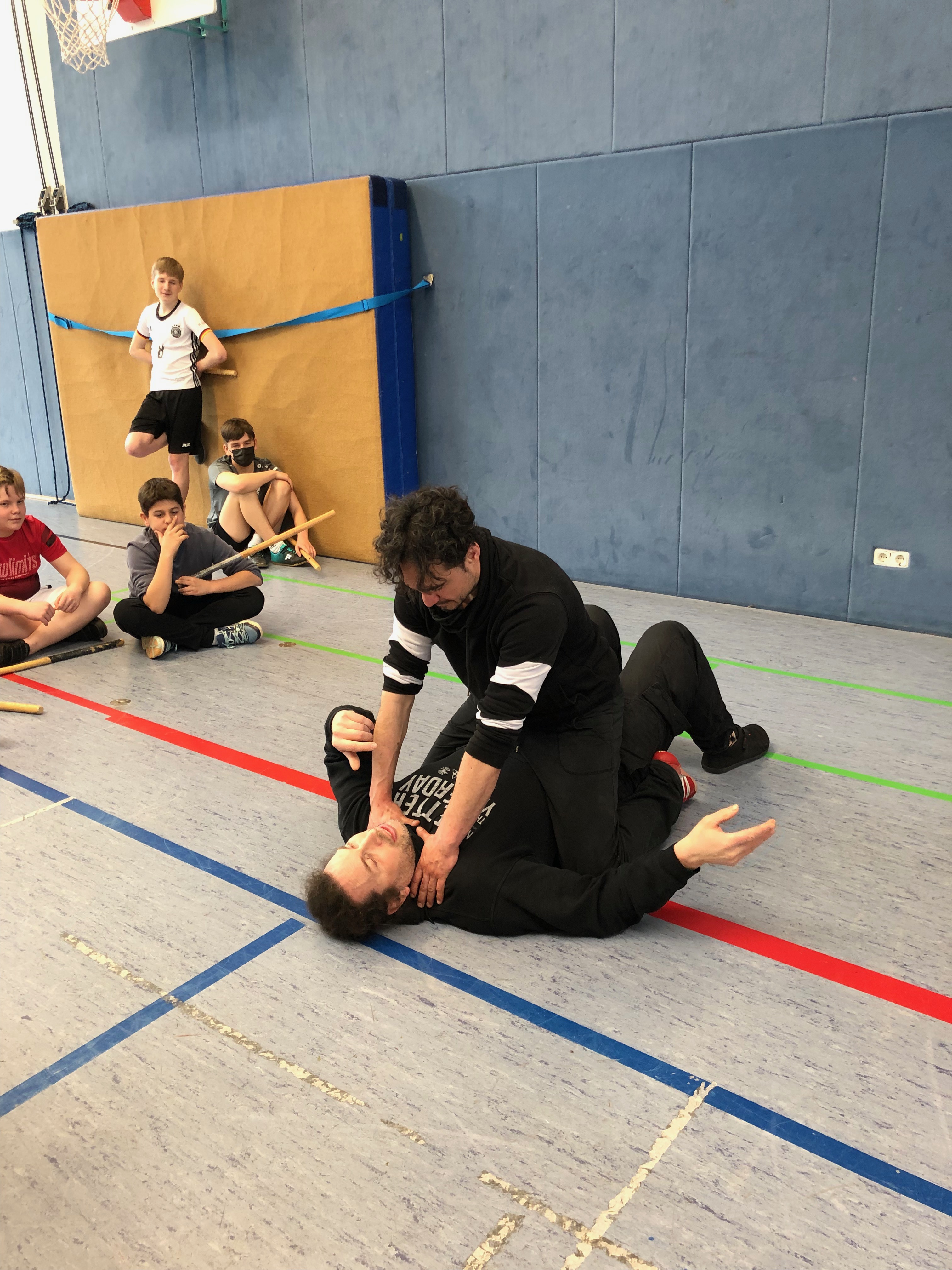 Mit dem Ziel, das Selbstvertrauen der Schüler*innen zu stärken und ihnen Techniken zur Selbstverteidigung an die Hand zu geben, bot Bernd Altenhöfer, der seit vielen Jahren als Kampfsportlehrer tätig ist, einen Workshop zu Stockkampf und Selbstverteidigung an. Anfangs gab er den Teilnehmer*innen vor allem Strategien zur friedlichen Abwehr an die Hand, während er im Verlauf des Workshops die Eskalationsstufen weiter mit ihnen besprach und ihnen Fertigkeiten zur Verteidigung für diverse Situationen an die Hand gab.