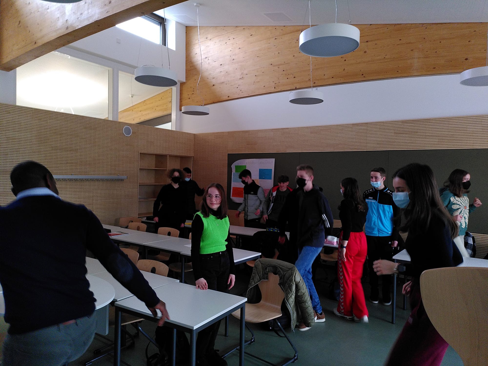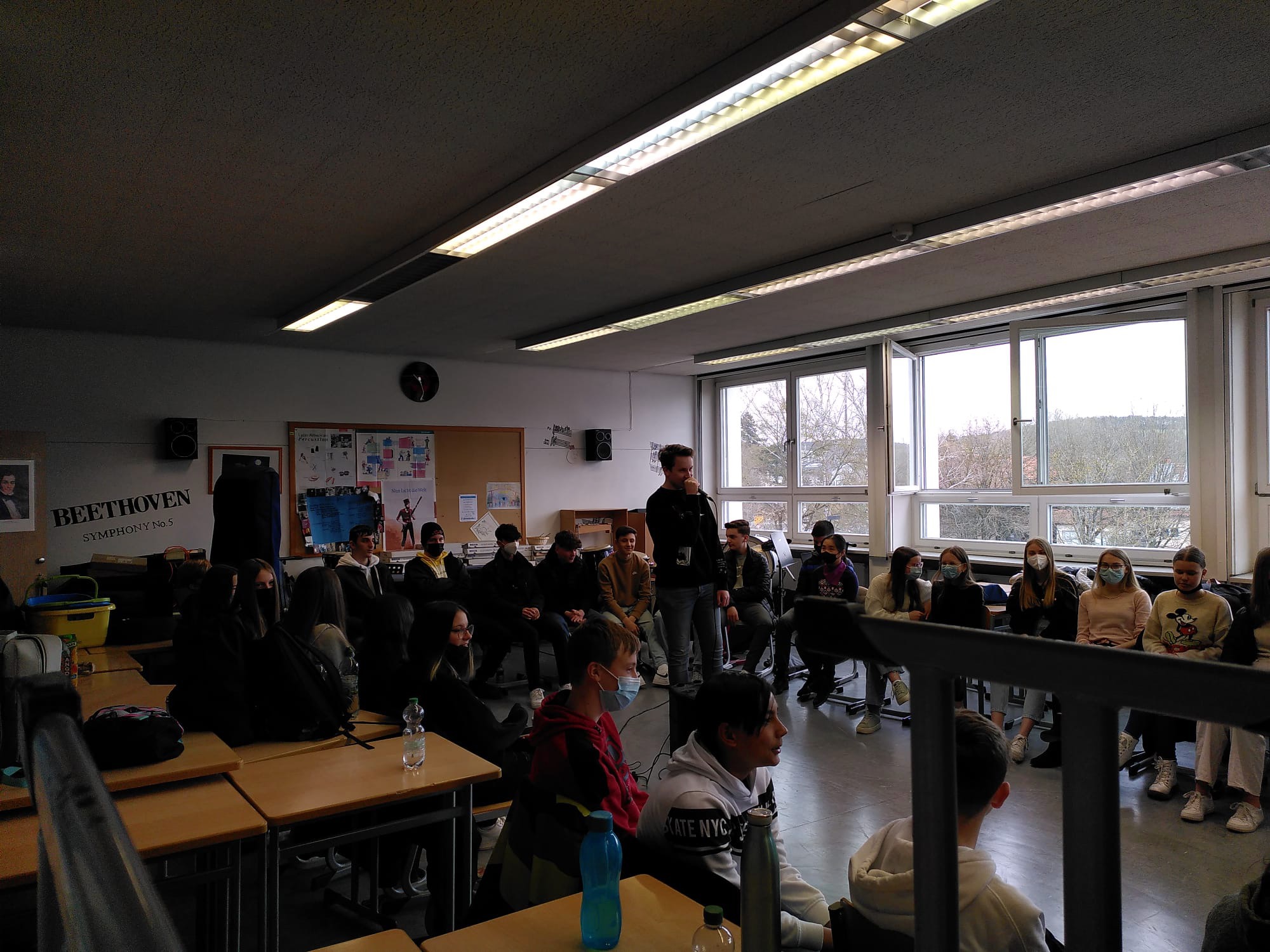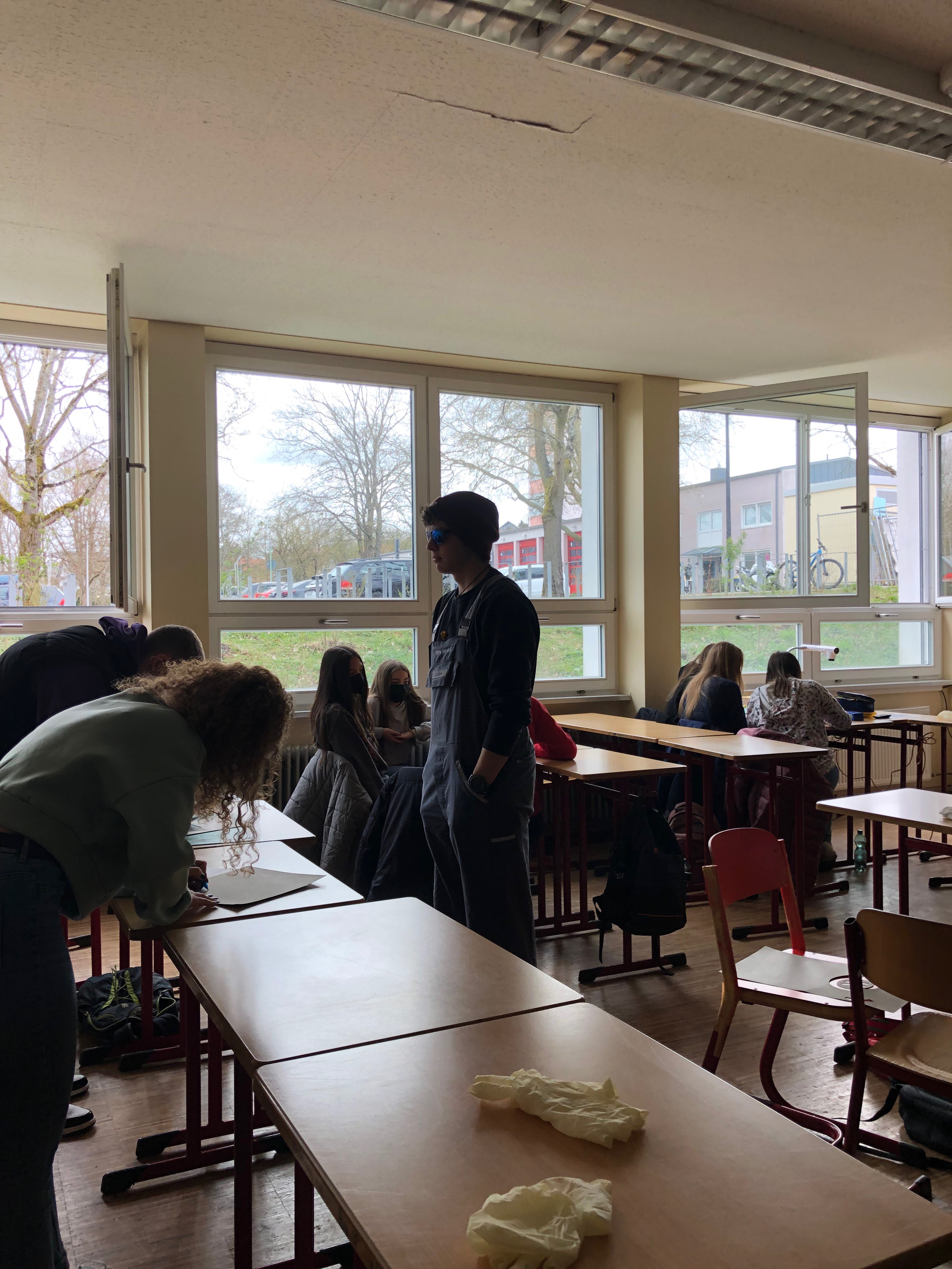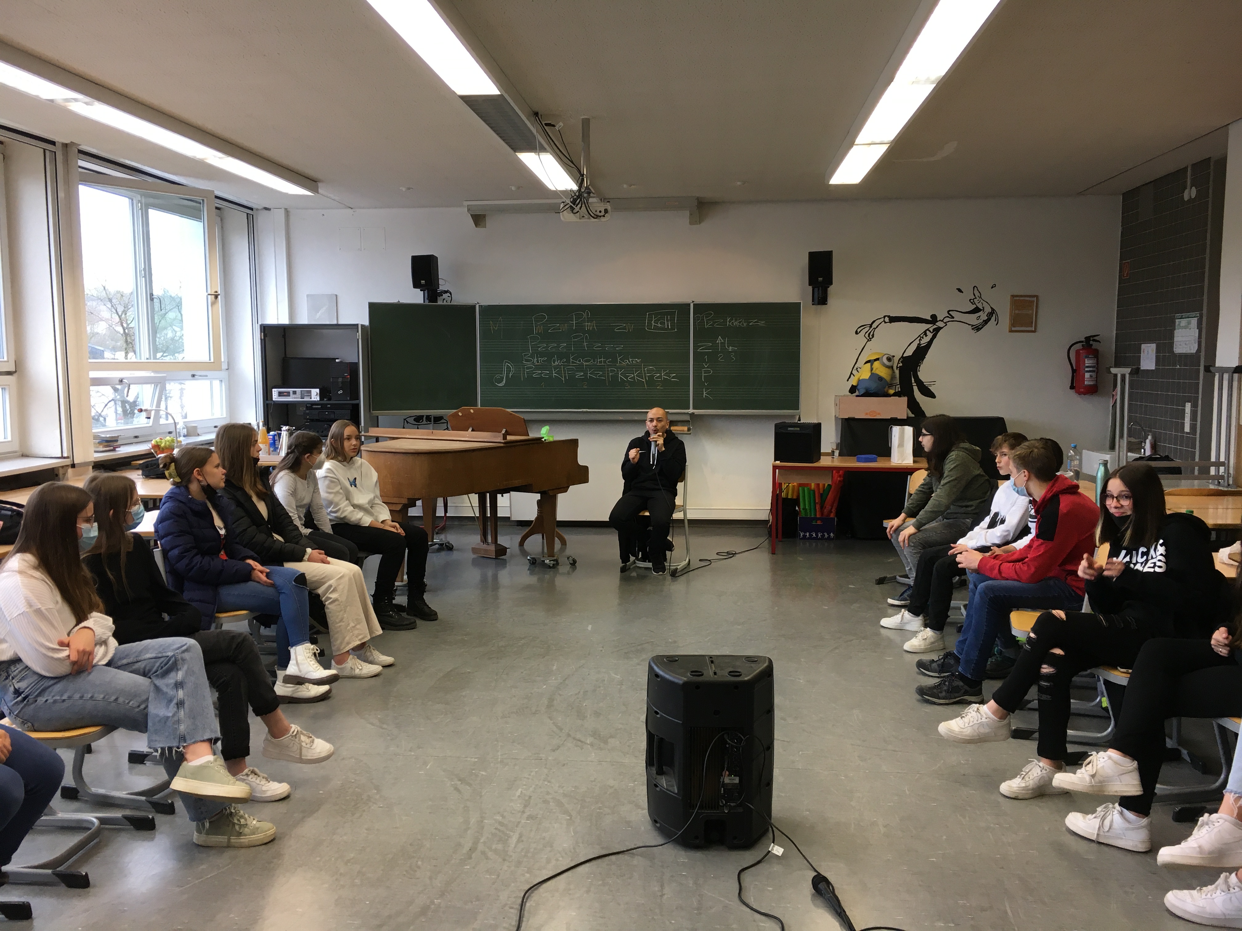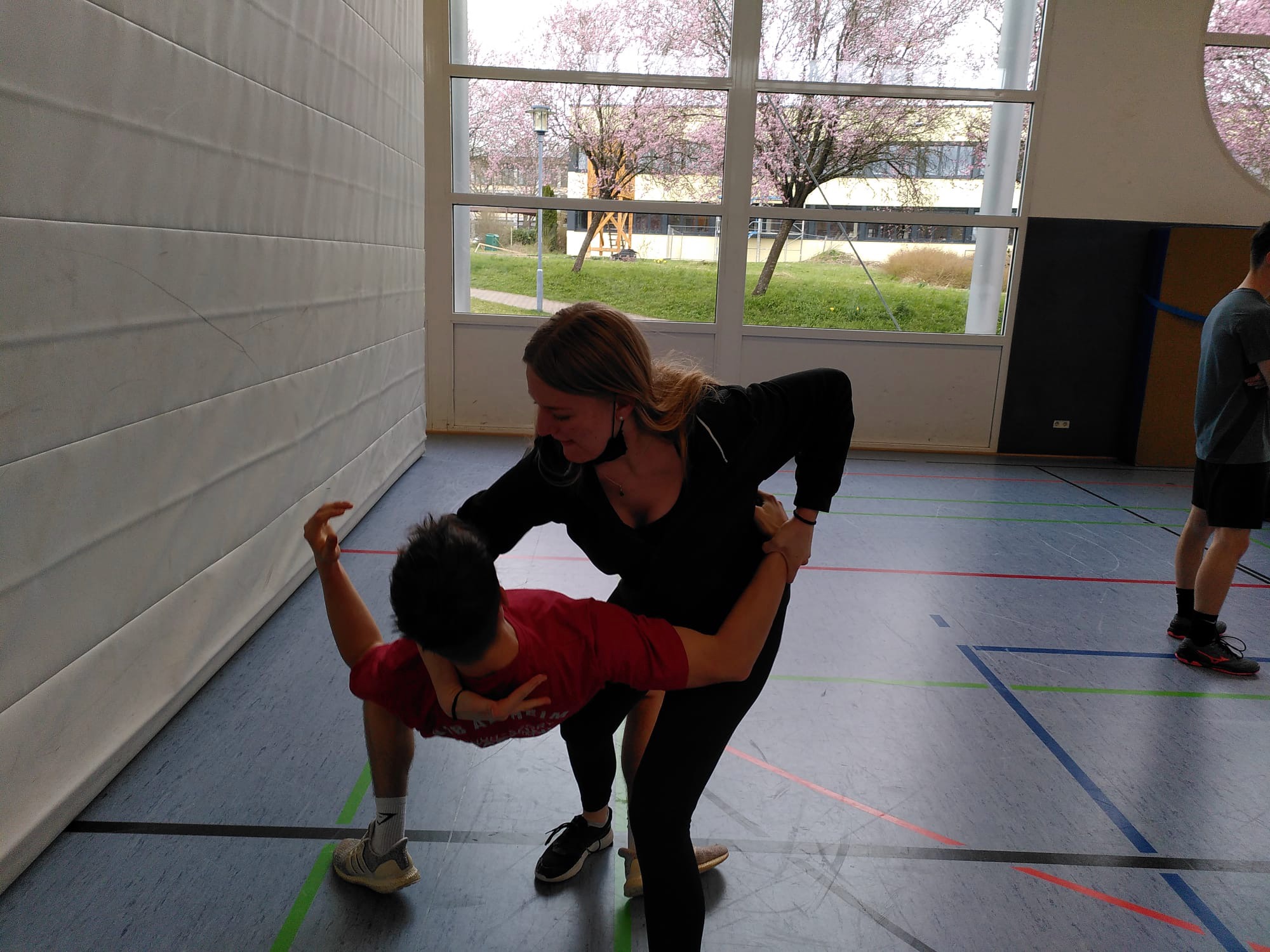 Mit dem Ziel, das Selbstvertrauen der Schüler*innen zu stärken und ihnen Techniken zur Selbstverteidigung an die Hand zu geben, bot Bernd Altenhöfer, der seit vielen Jahren als Kampfsportlehrer tätig ist, einen Workshop zu Stockkampf und Selbstverteidigung an. Anfangs gab er den Teilnehmer*innen vor allem Strategien zur friedlichen Abwehr an die Hand, während er im Verlauf des Workshops die Eskalationsstufen weiter mit ihnen besprach und ihnen Fertigkeiten zur Verteidigung für diverse Situationen an die Hand gab.