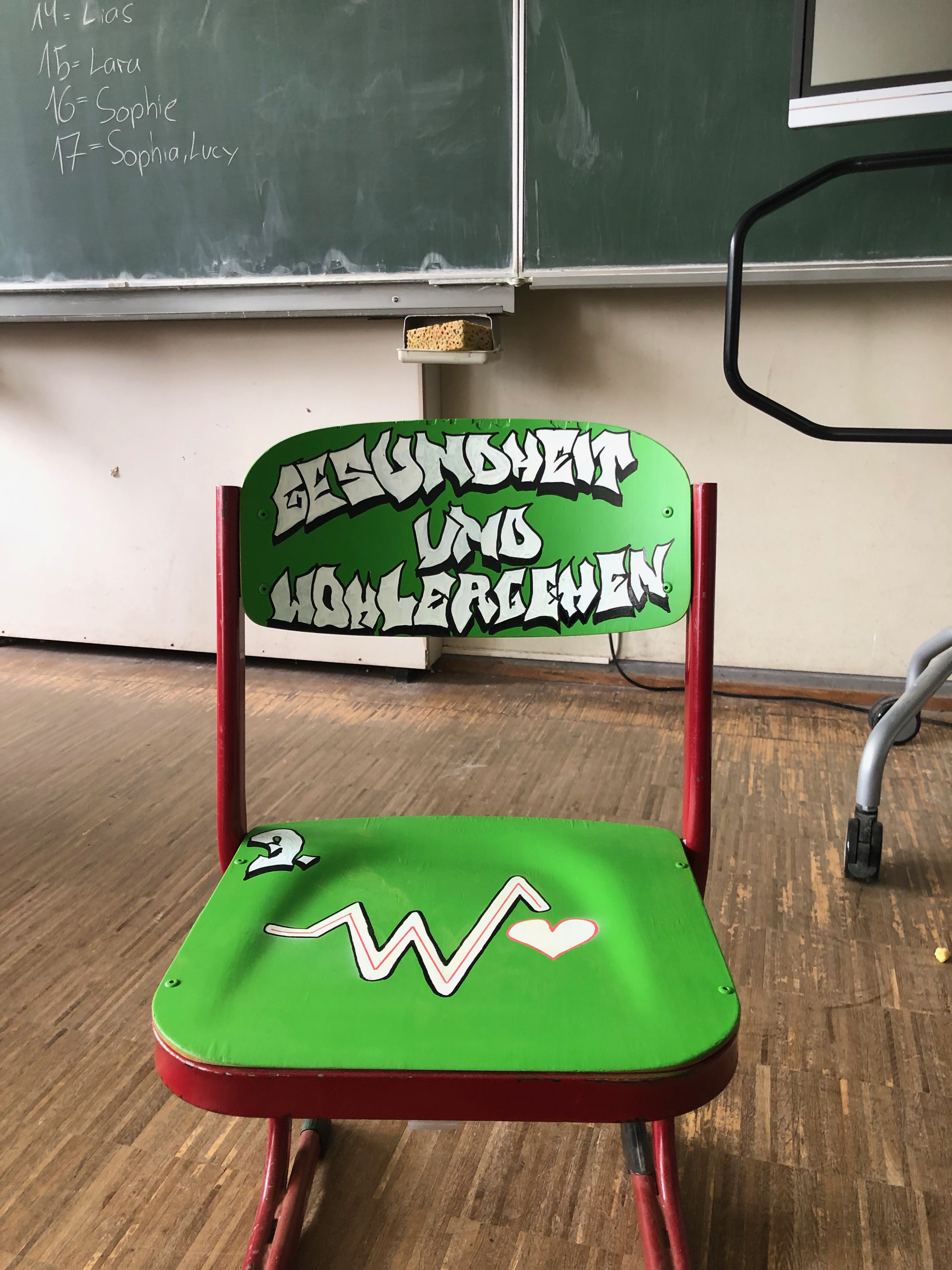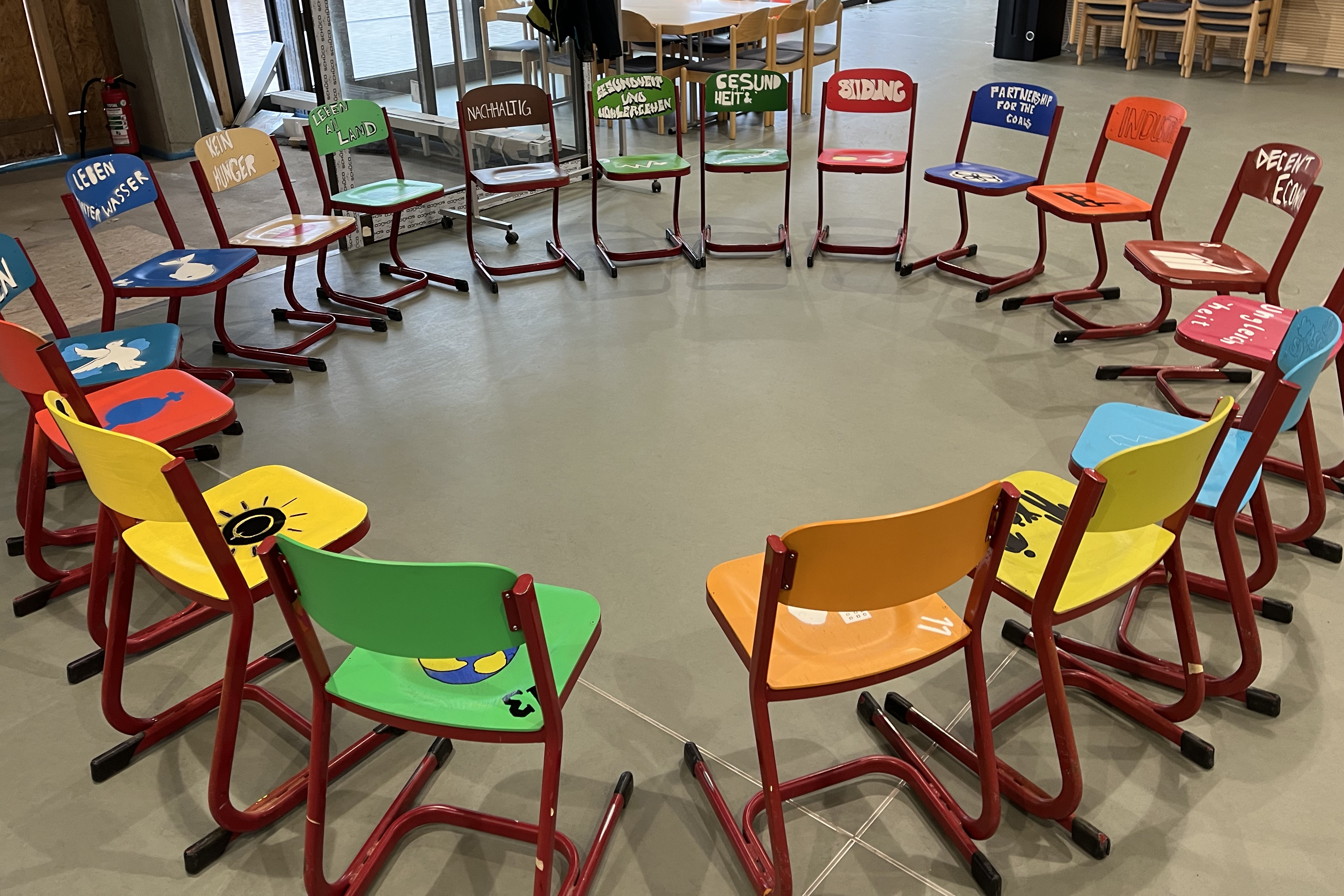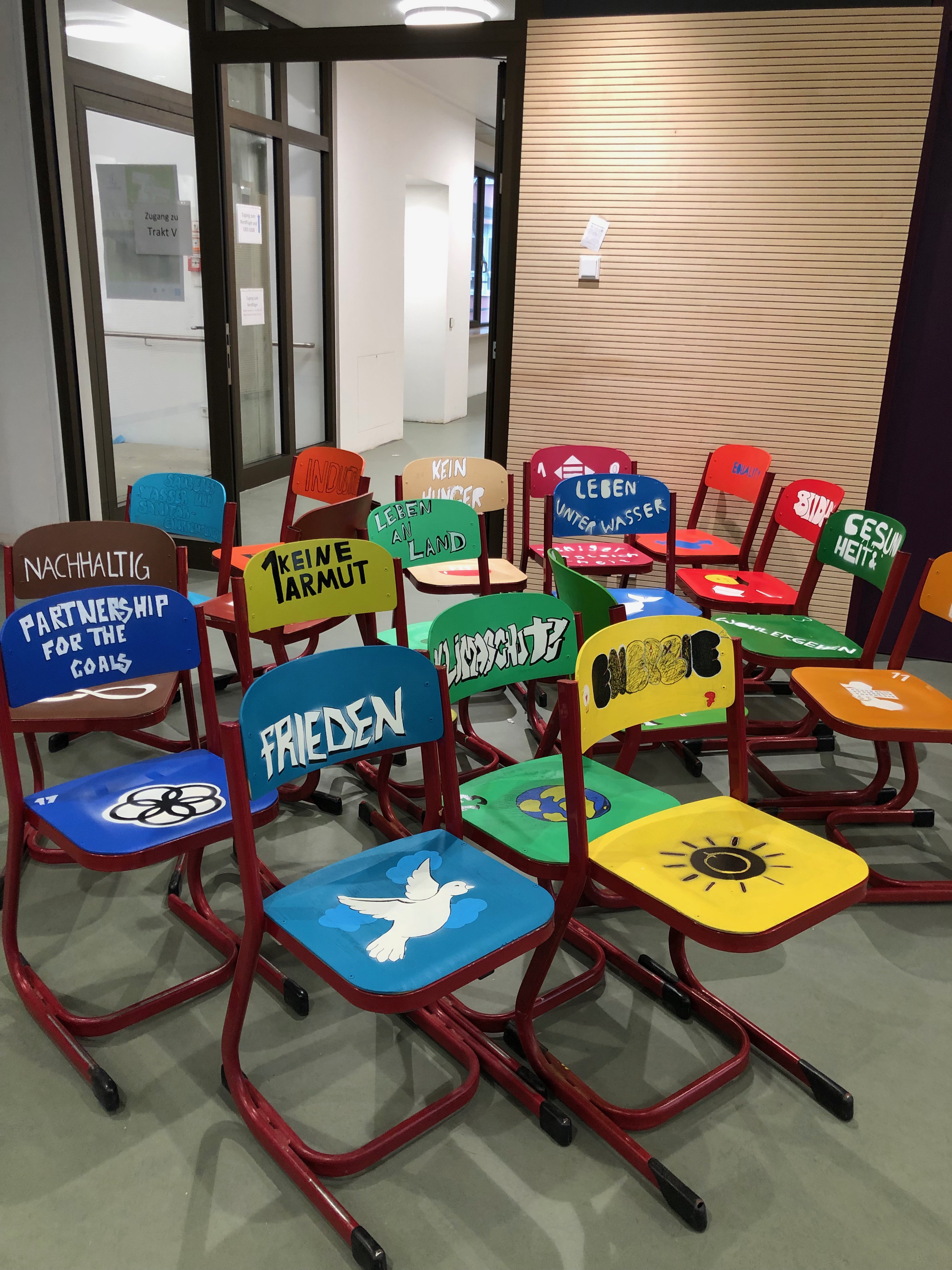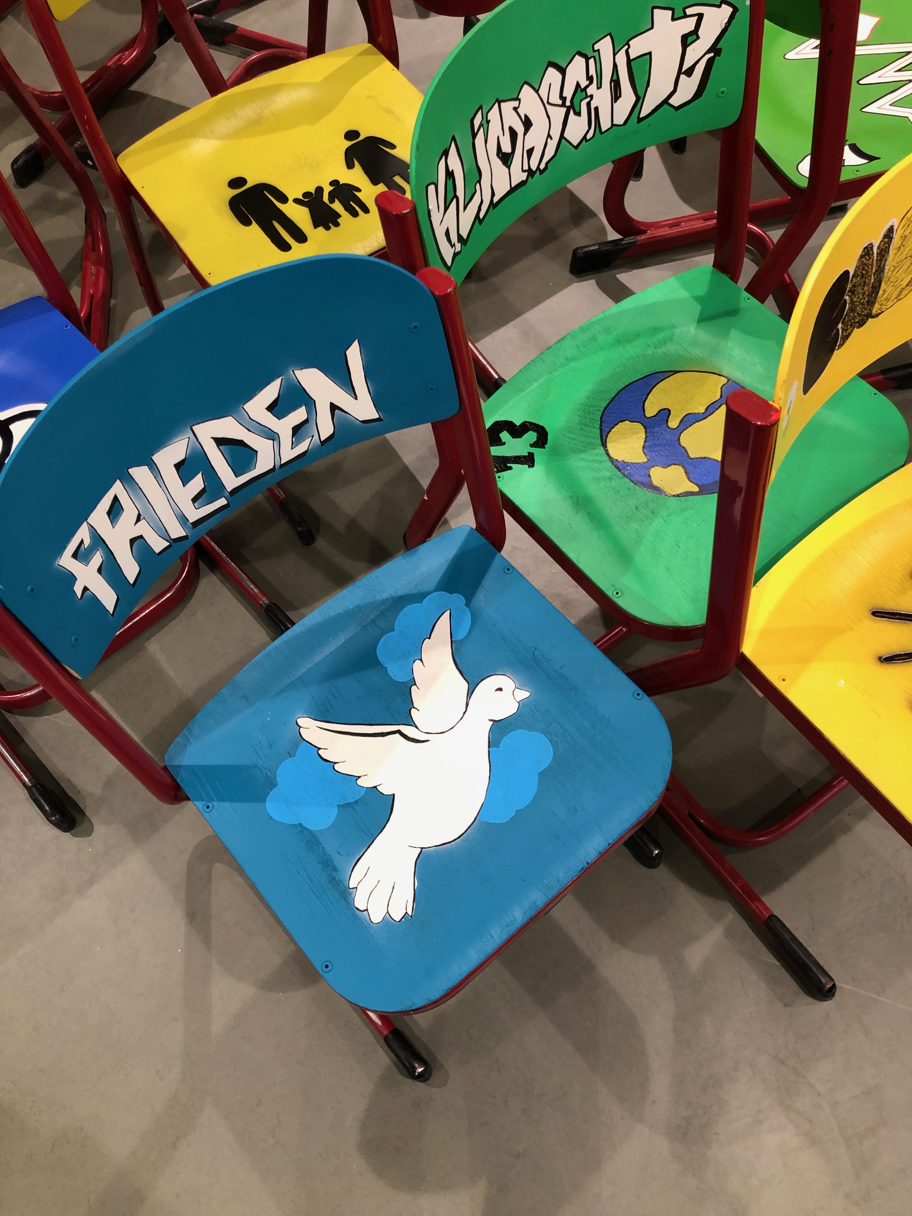 Nico Henk zeigte seinen Mitschüler*innen, wie man Graffiti erstellt. Gemeinsam besprühten die Teilnehmer*innen alte Stühle mit den 17 SDGs, also den 17 Zielen zur nachhaltigen Entwicklung der UN. Die Stühle sollen im Schuhhaus ausgestellt werden und nicht nur als Erinnerung an die Ziele, sondern auch an den Projekttag dienen.