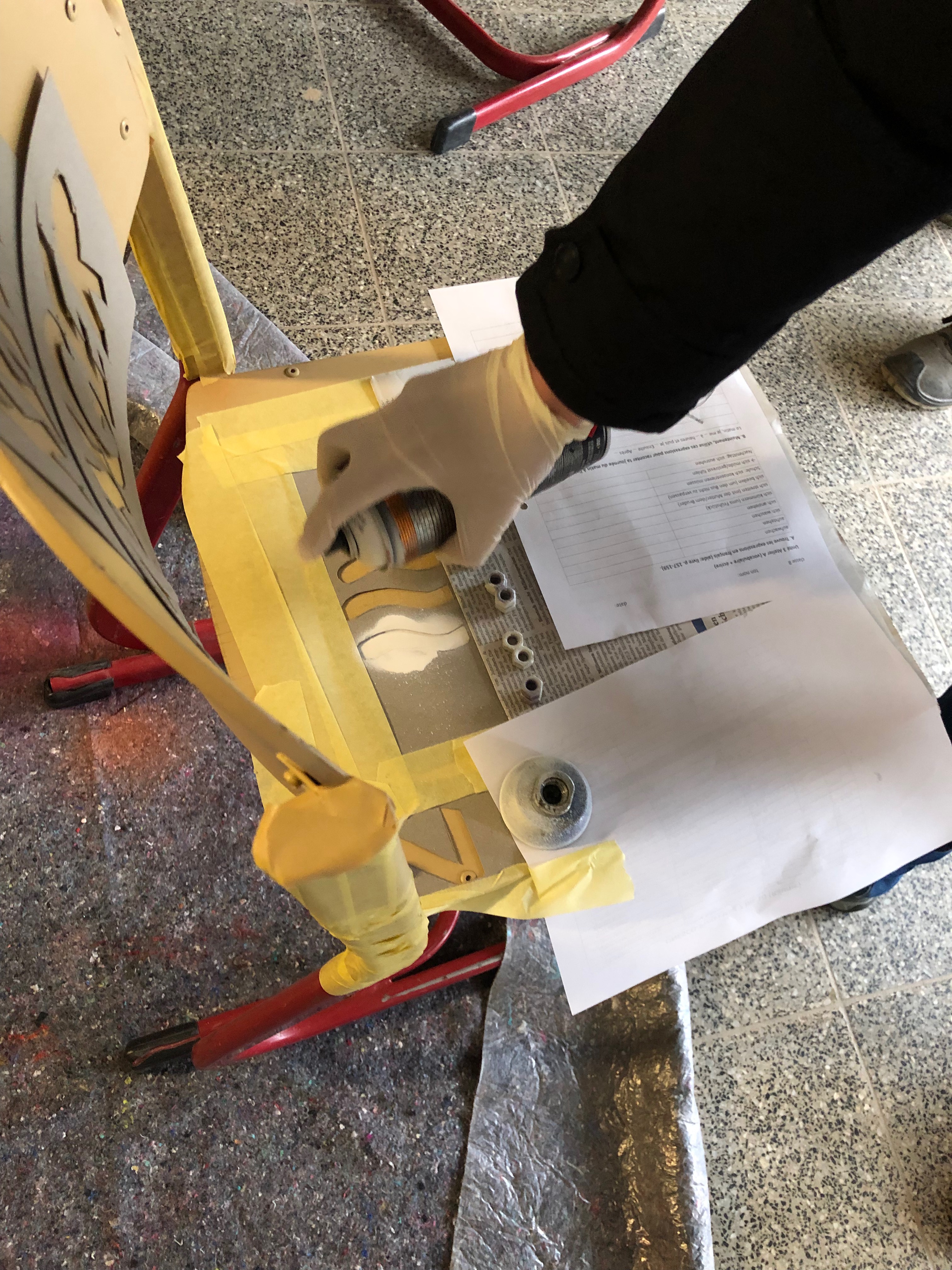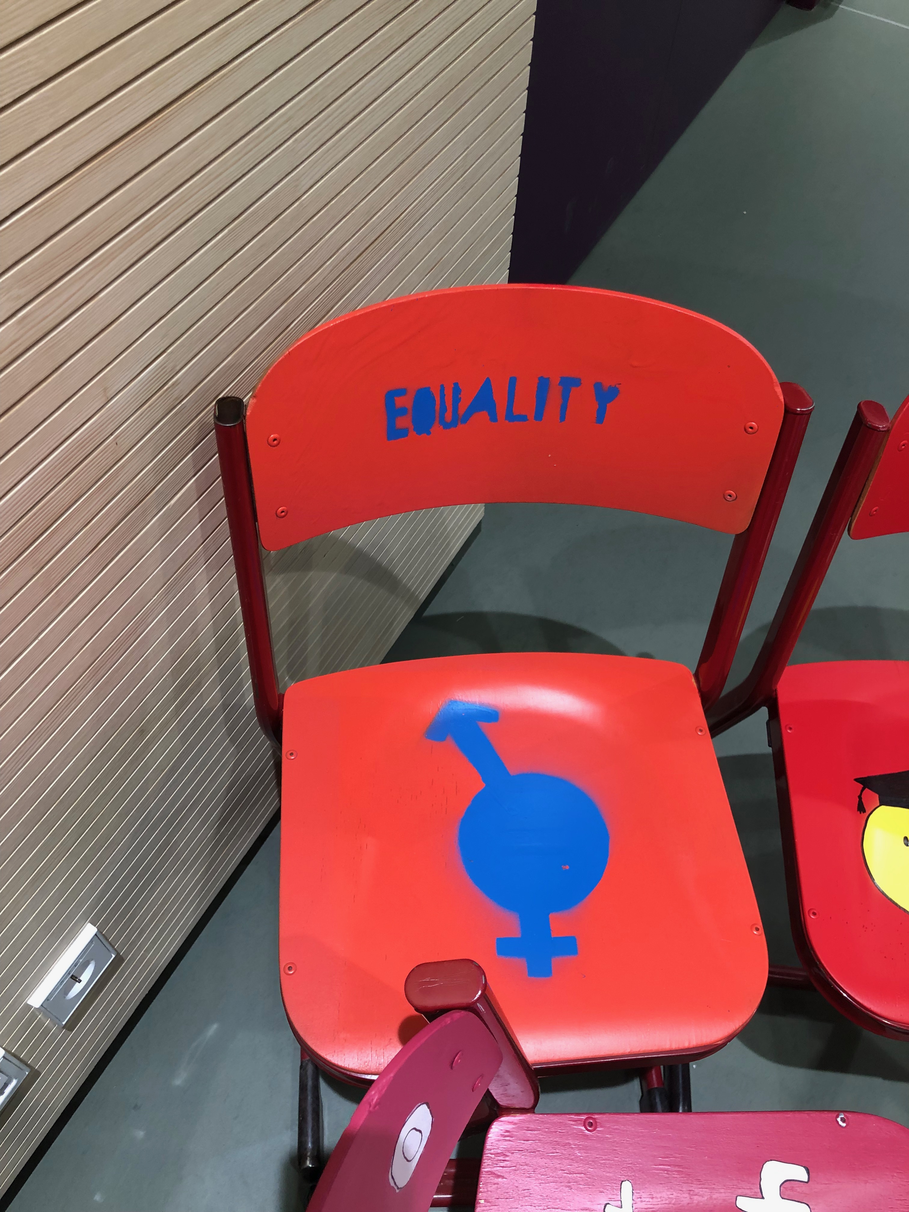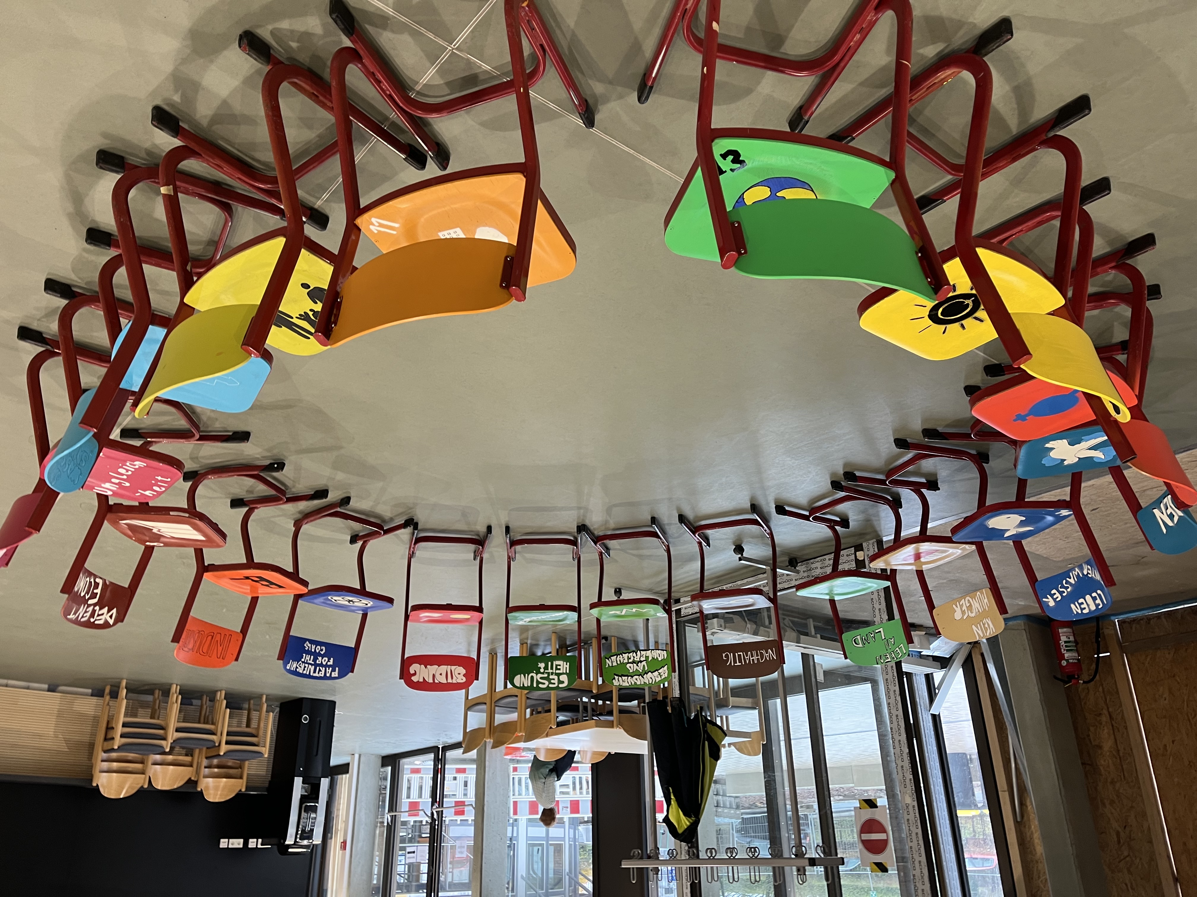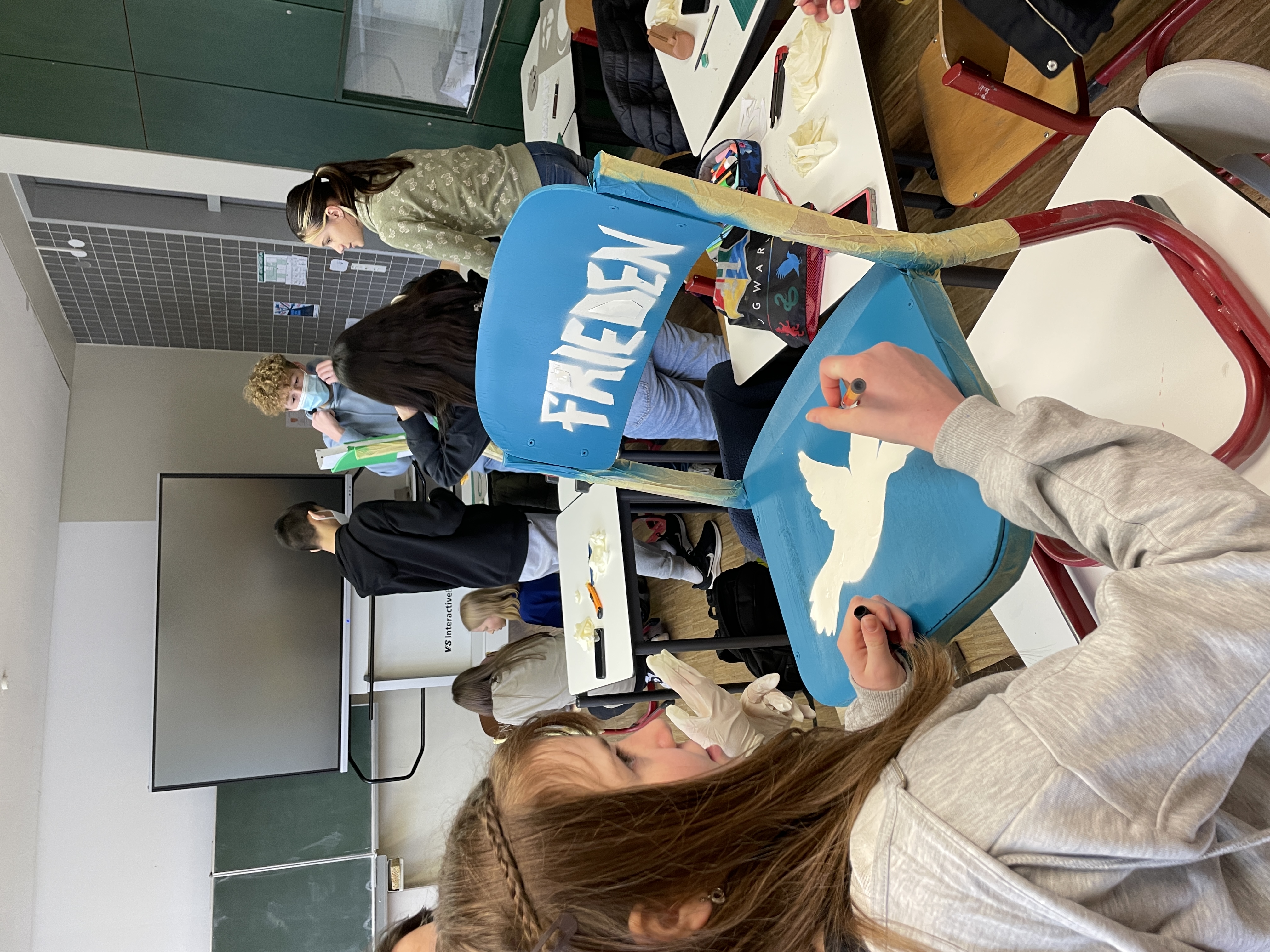 Nico Henk zeigte seinen Mitschüler*innen, wie man Graffiti erstellt. Gemeinsam besprühten die Teilnehmer*innen alte Stühle mit den 17 SDGs, also den 17 Zielen zur nachhaltigen Entwicklung der UN. Die Stühle sollen im Schuhhaus ausgestellt werden und nicht nur als Erinnerung an die Ziele, sondern auch an den Projekttag dienen.