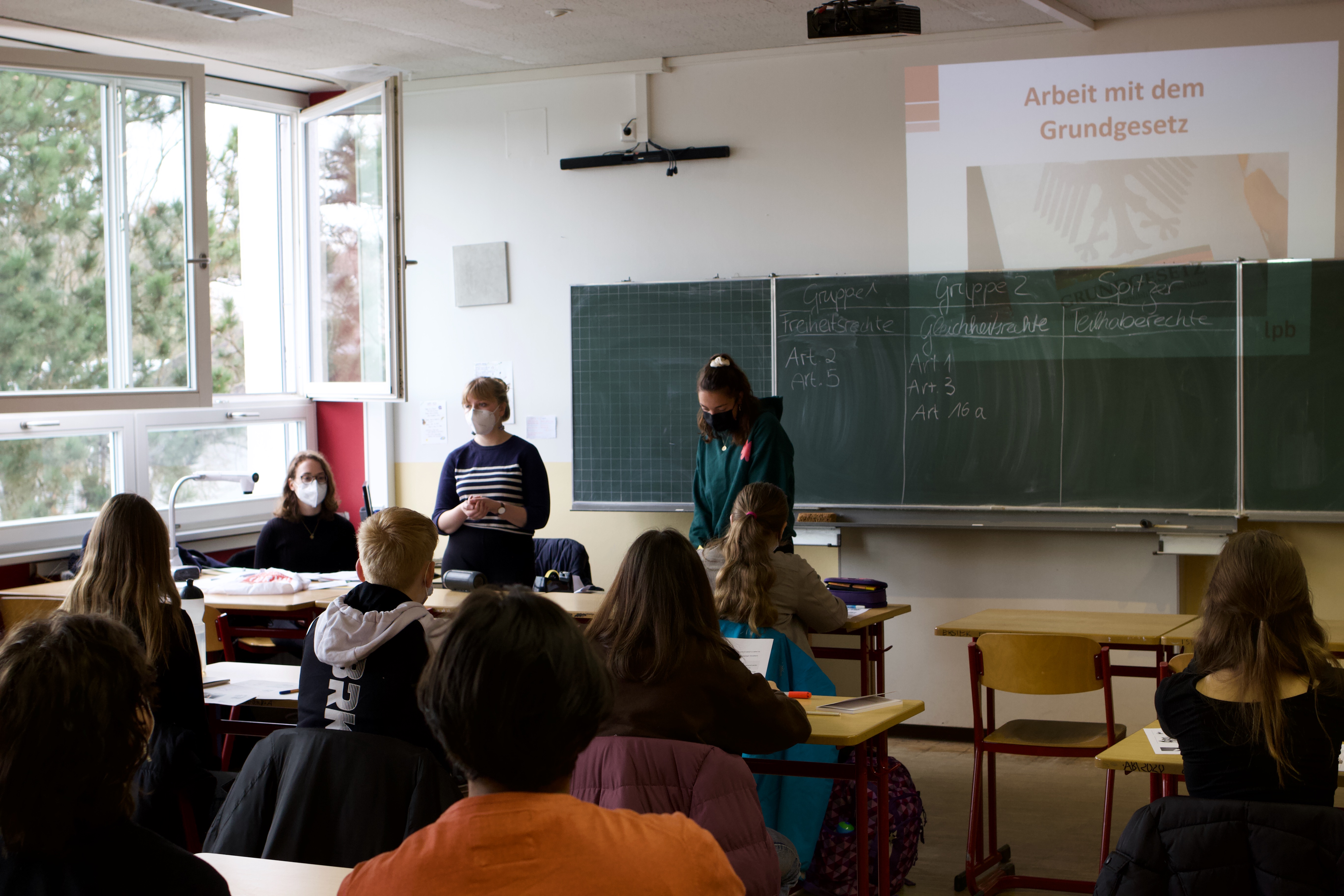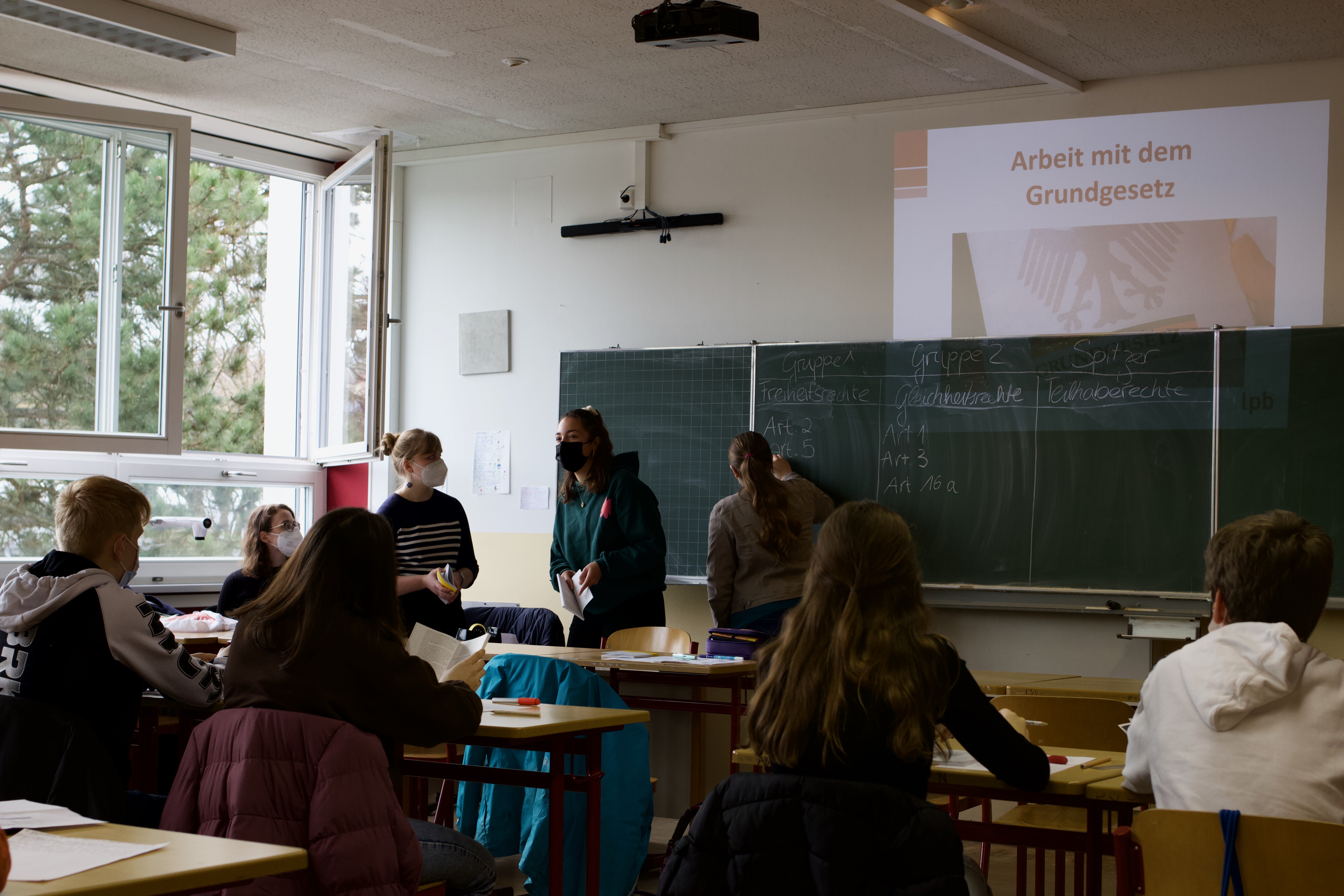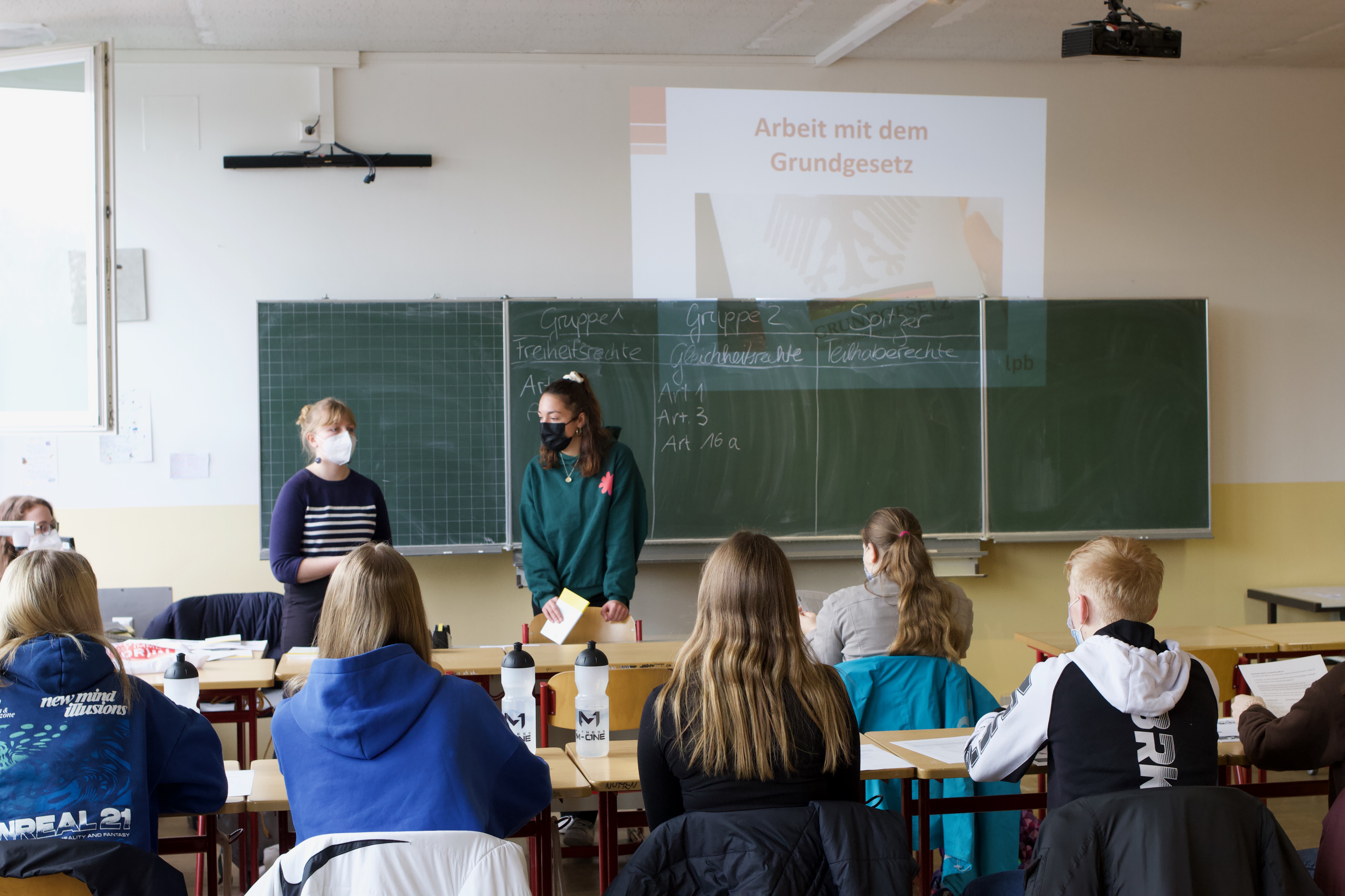 Im Workshop zu Menschenwürde und Co. der Landeszentrale für politische Bildung Baden-Württemberg fanden Schüler*innen mehr über die Grundrechte der deutschen Demokratie und darüber, warum es diese gibt, heraus. Sie arbeiteten mit dem Grundgesetz, indem sie sich einzelne Artikel heraussuchten und besprachen und verschiedene Fallbeispiele betrachteten.