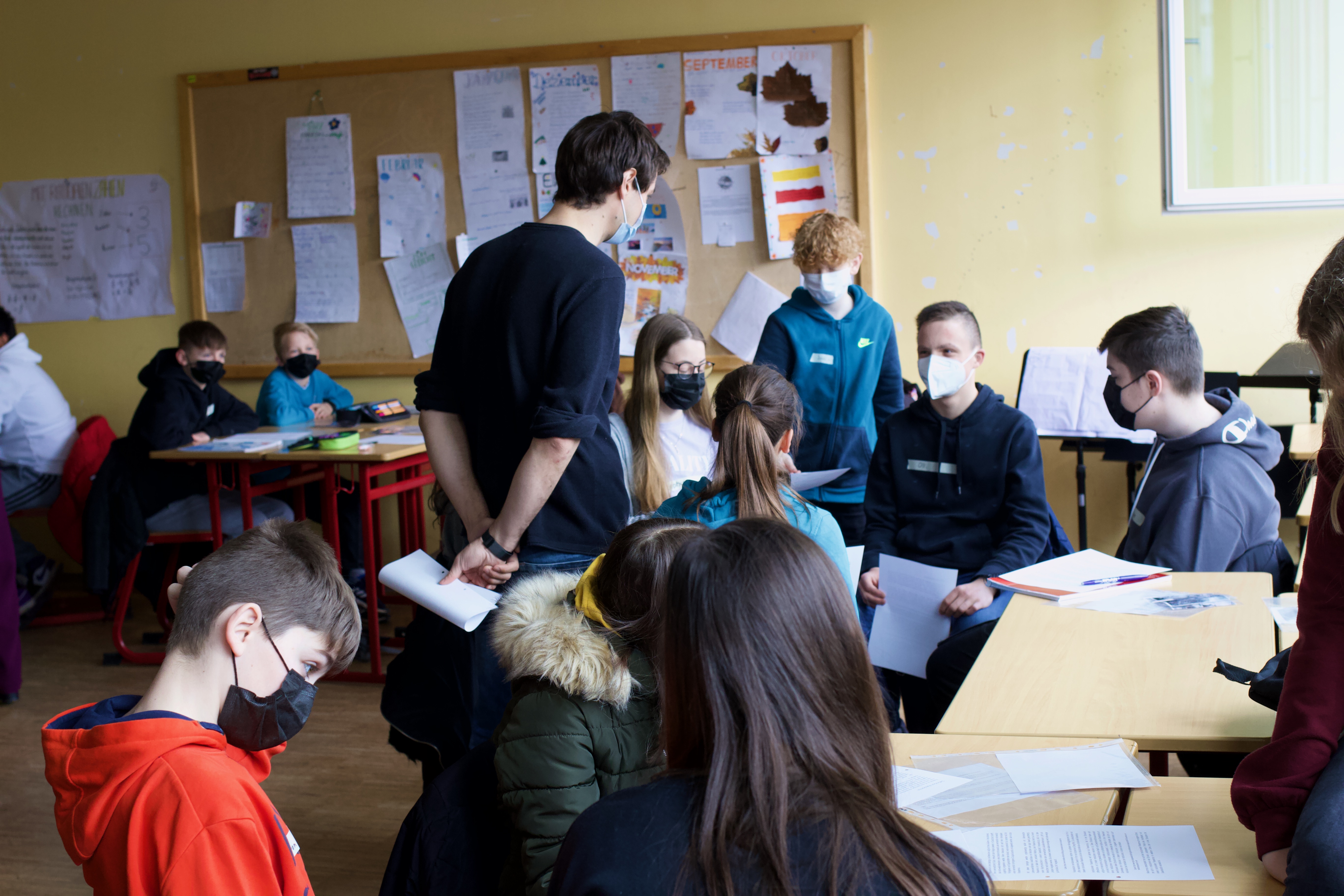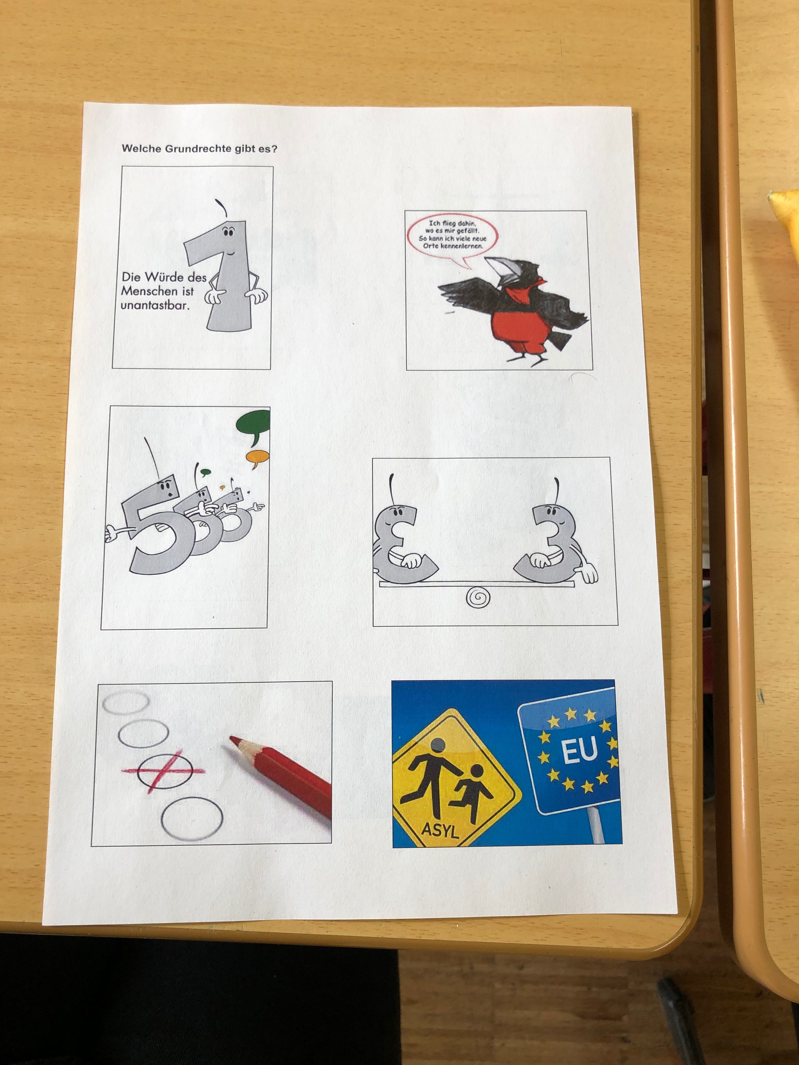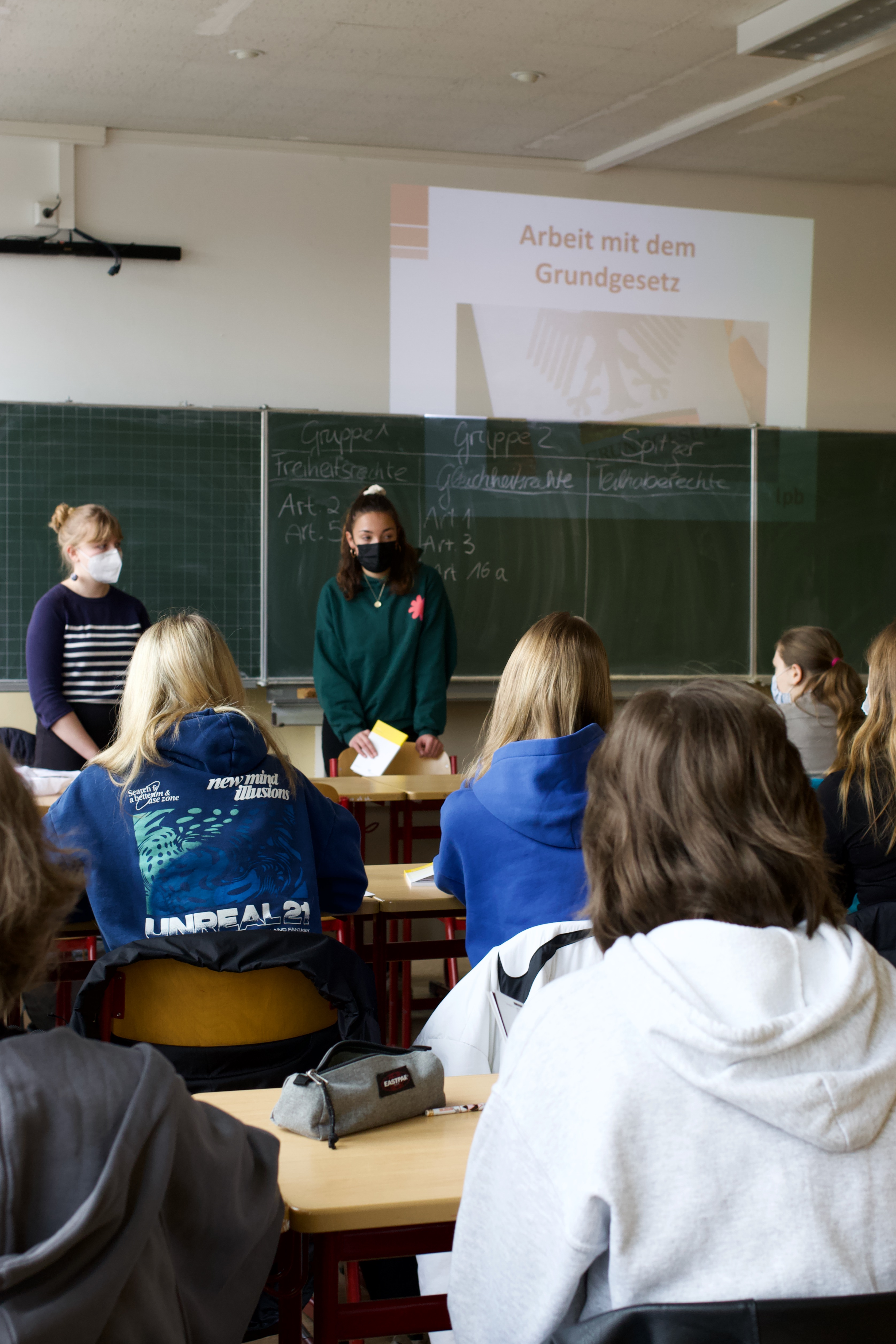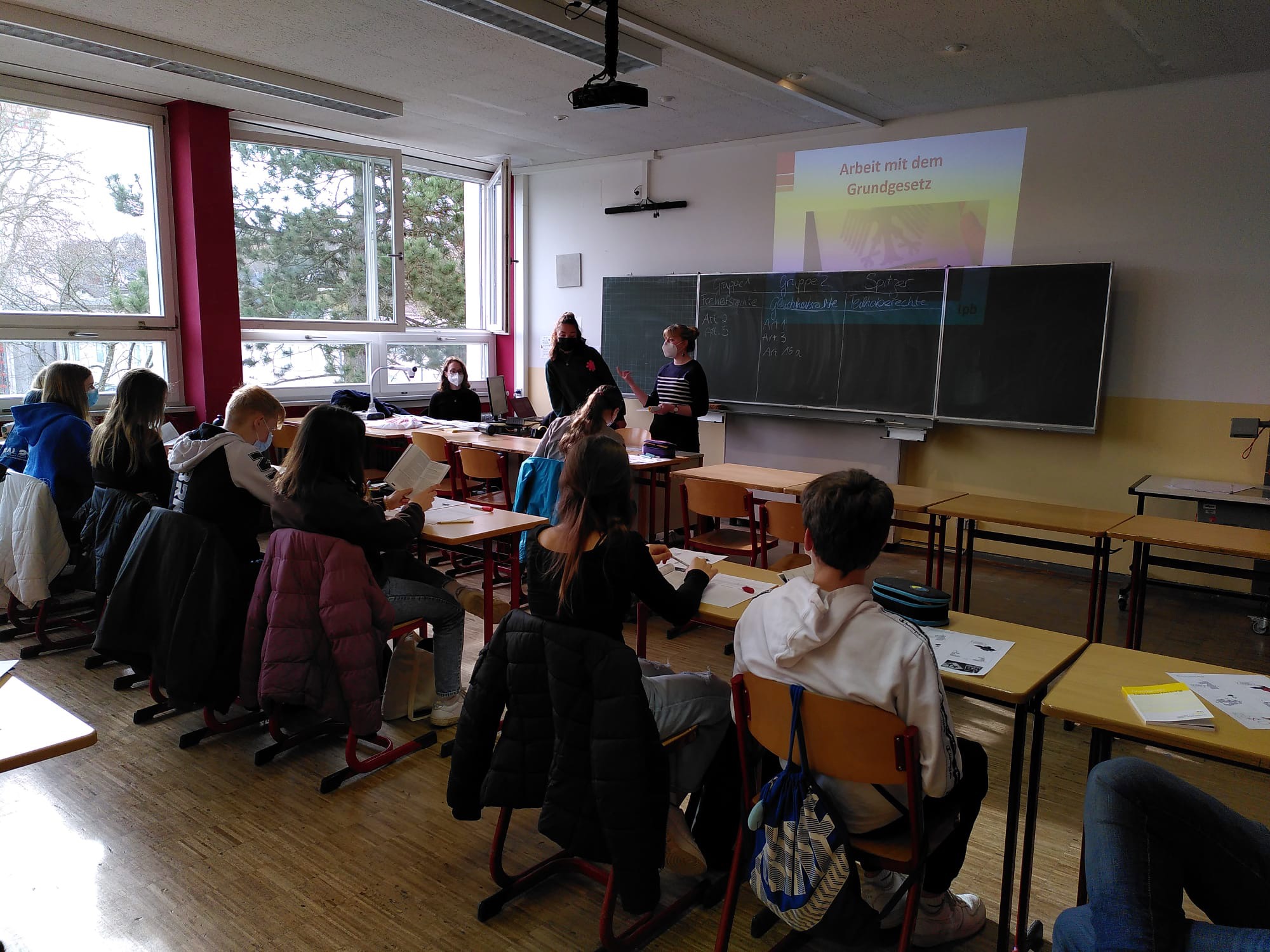 Im Workshop zu Menschenwürde und Co. der Landeszentrale für politische Bildung Baden-Württemberg fanden Schüler*innen mehr über die Grundrechte der deutschen Demokratie und darüber, warum es diese gibt, heraus. Sie arbeiteten mit dem Grundgesetz, indem sie sich einzelne Artikel heraussuchten und besprachen und verschiedene Fallbeispiele betrachteten.
