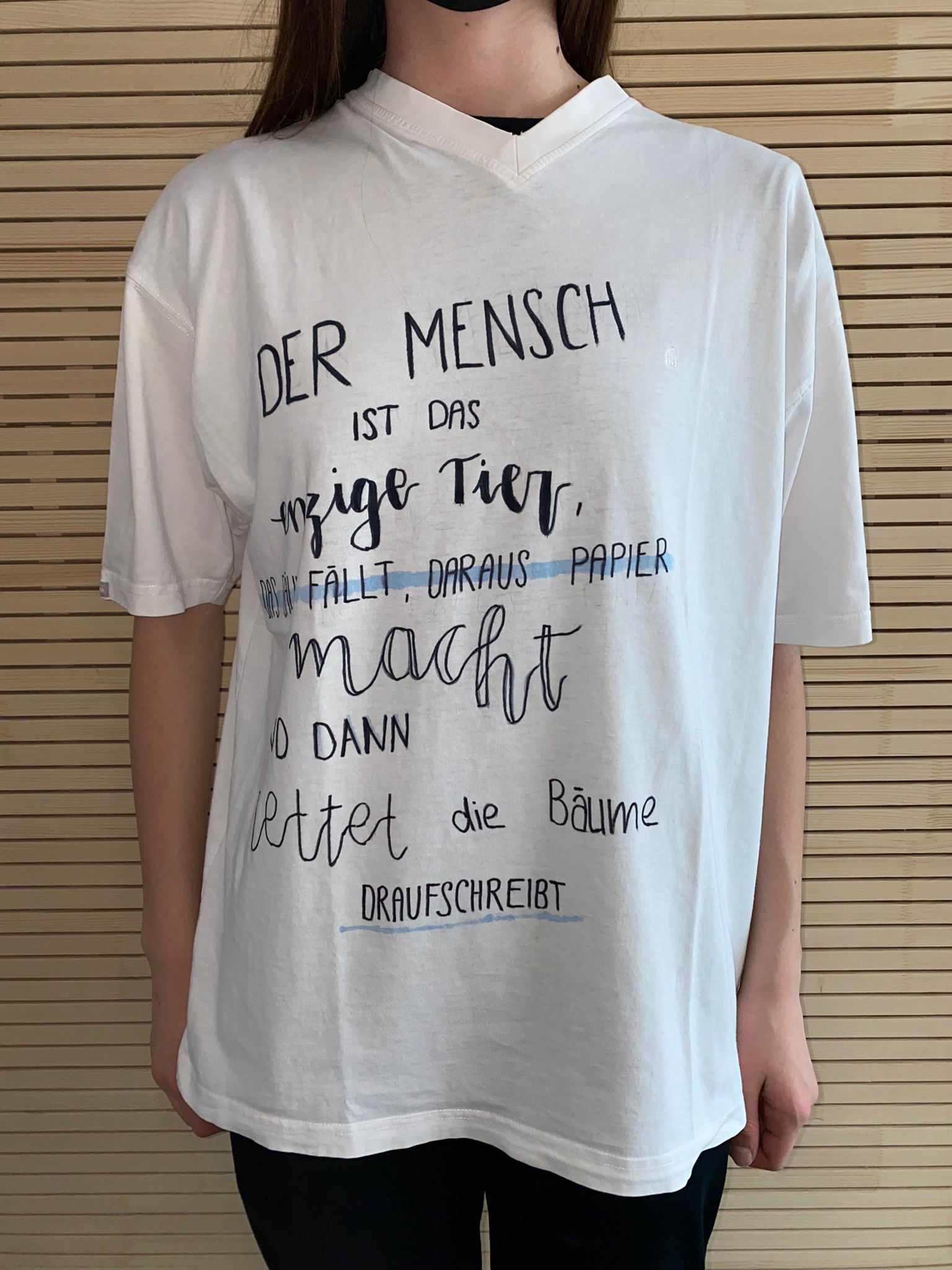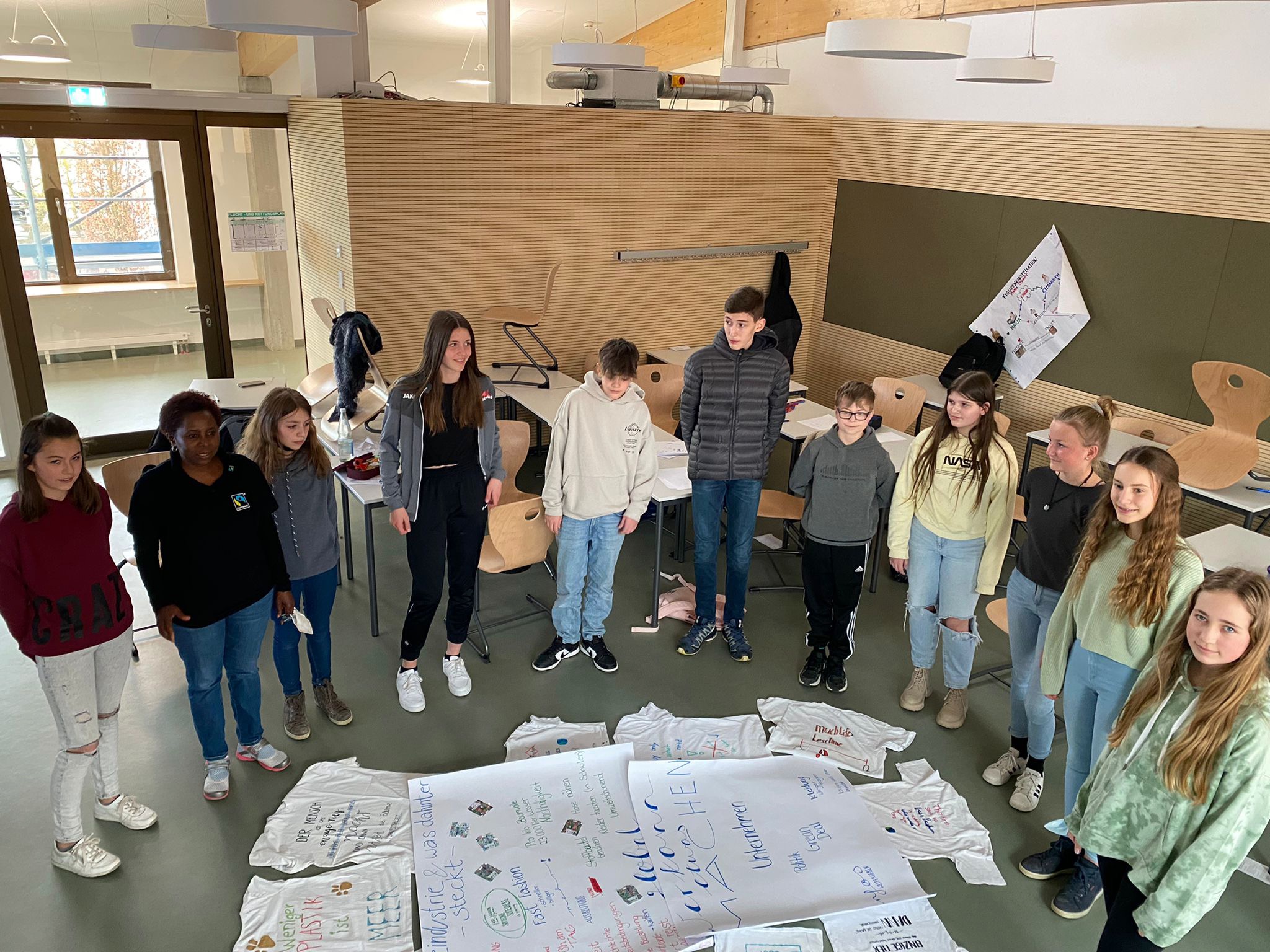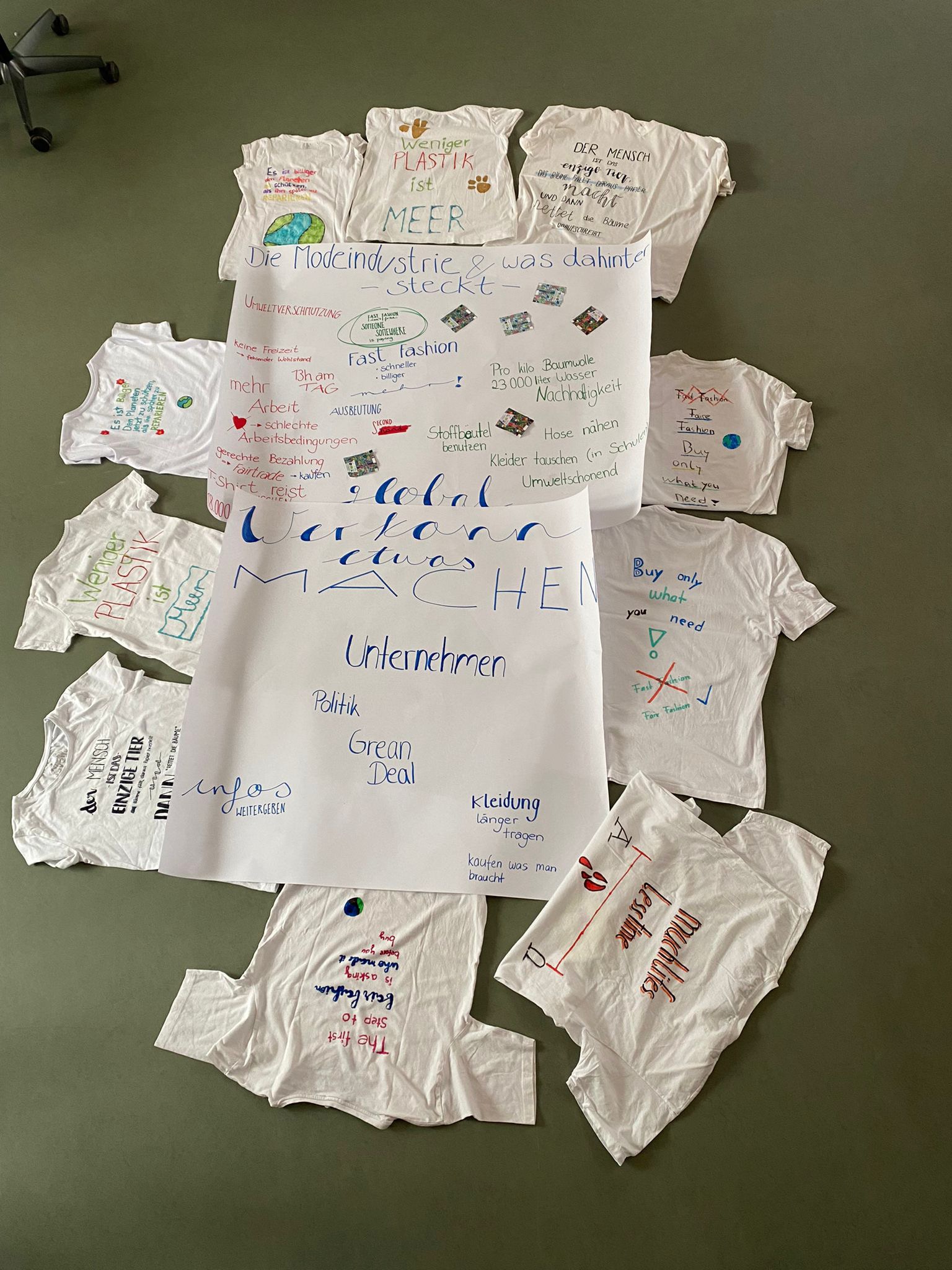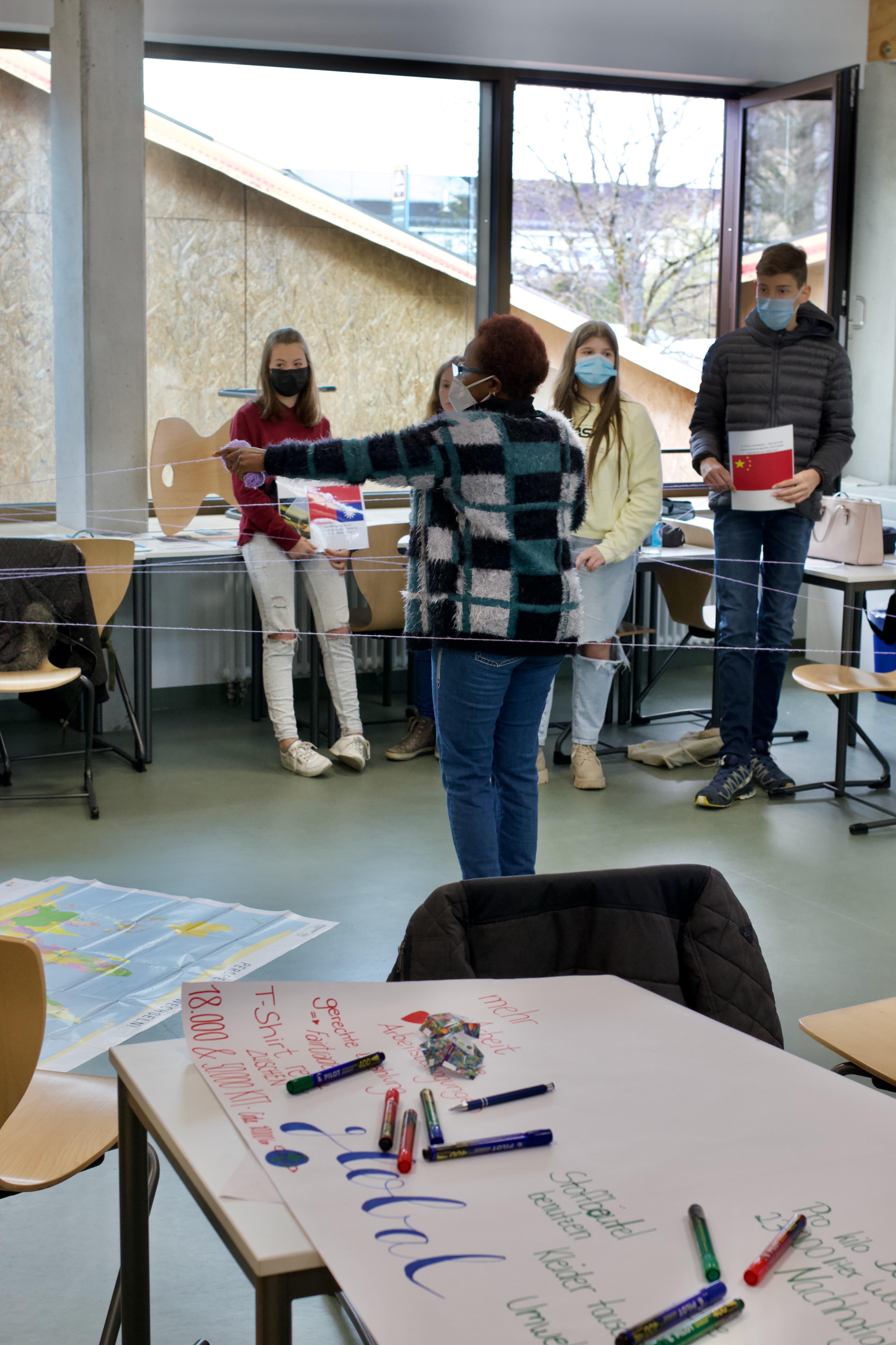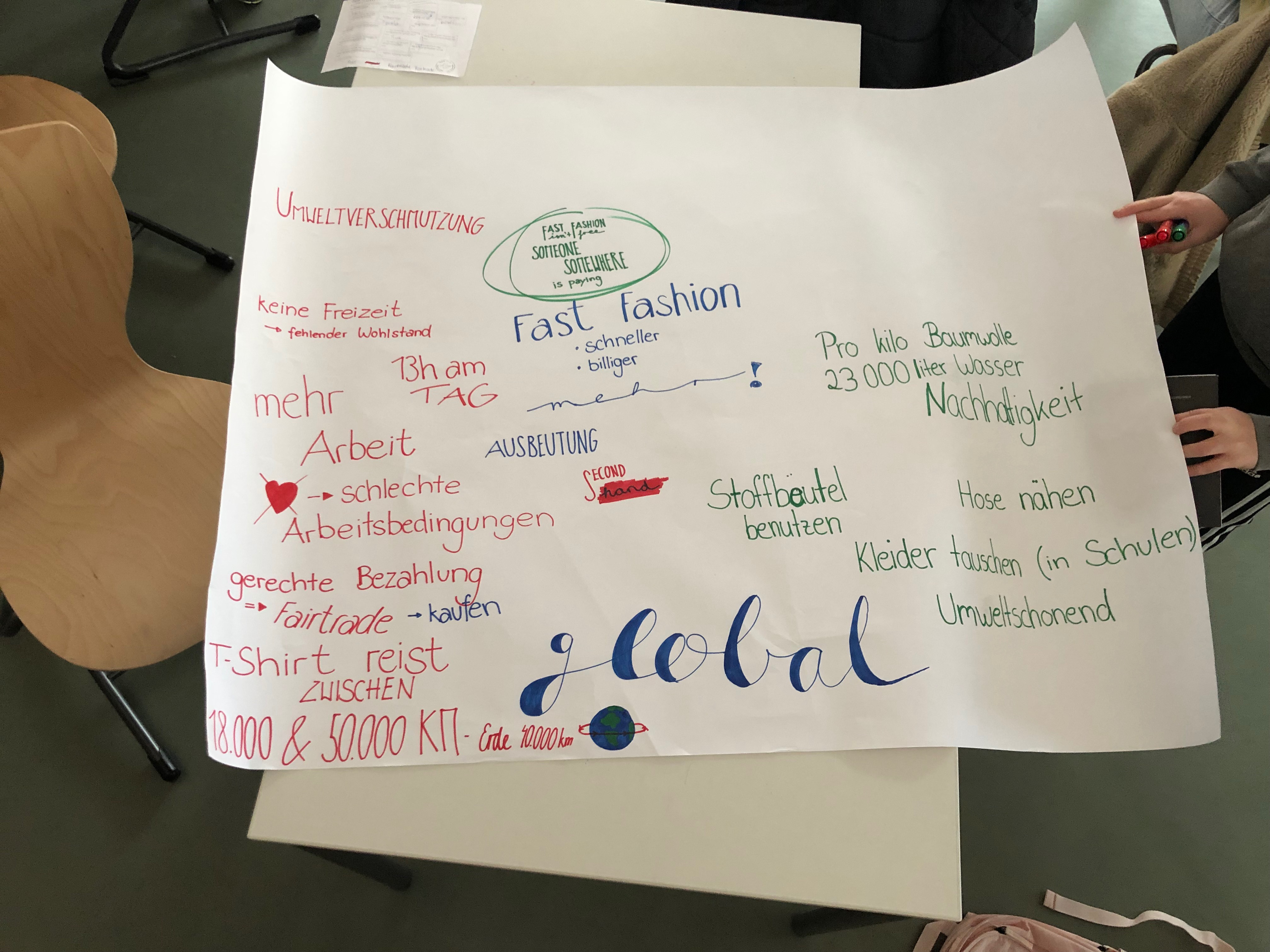 Wynnie Mbindyo von FemNet betrachtete in diesem Workshop mit den teilnehmenden Schüler*innen die Schattenseiten der Modeindustrie. Fast Fashion, also die Beschleunigung der Modeindustrie durch billige Kleidungspreise und kurzlebige Trends, verursacht große soziale und klimatische Schäden, da zum Beispiel die Arbeiter*innen in den Fabriken ausgebeutet werden oder die Waren, die im Ausland produziert werden, lange Wege zurücklegen. Gemeinsam erarbeiteten sie aber auch Vermeidungsstrategien von Fast Fashion, wie weniger und bewusster zu konsumieren und auf faire Arbeitsbedingungen zu achten.