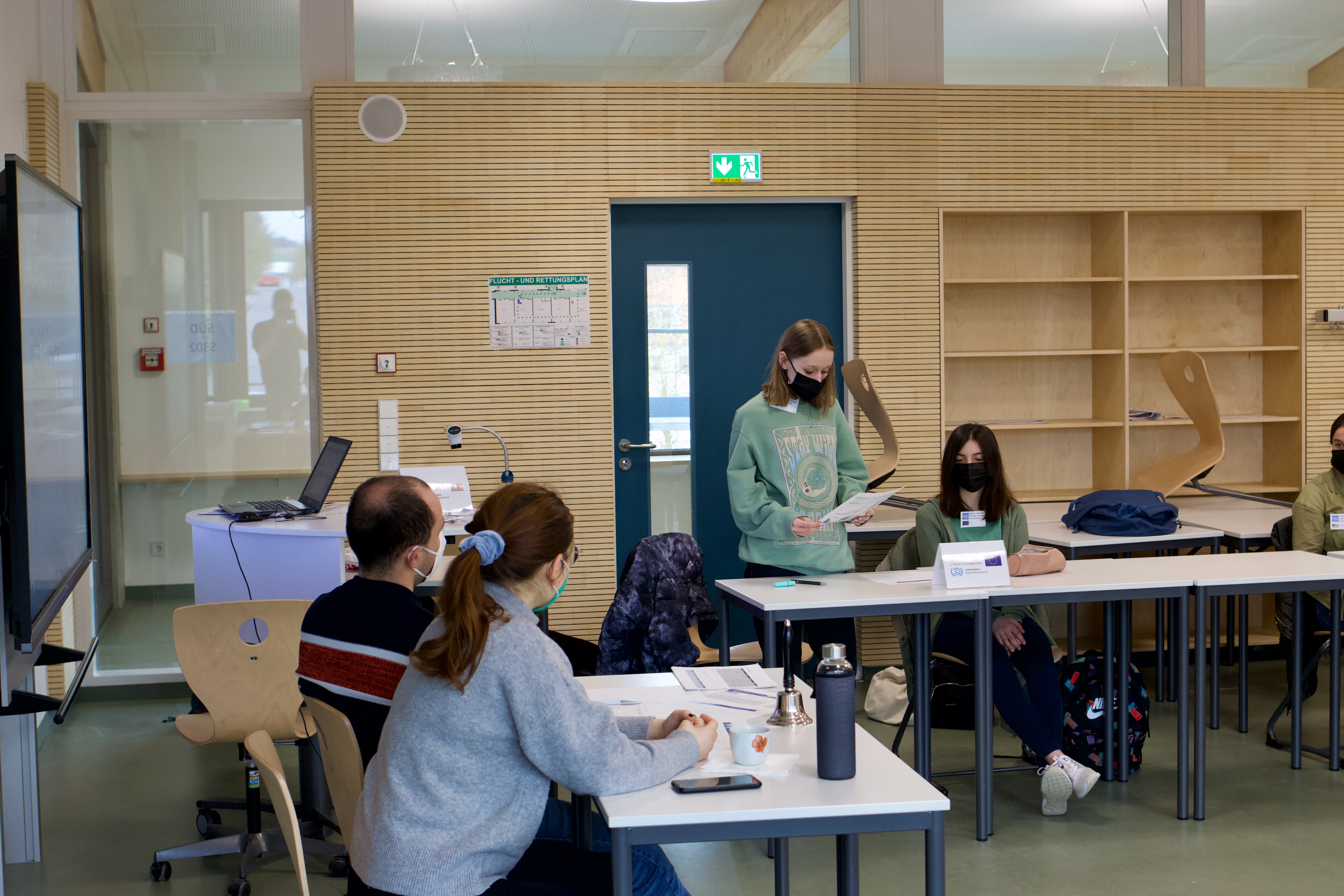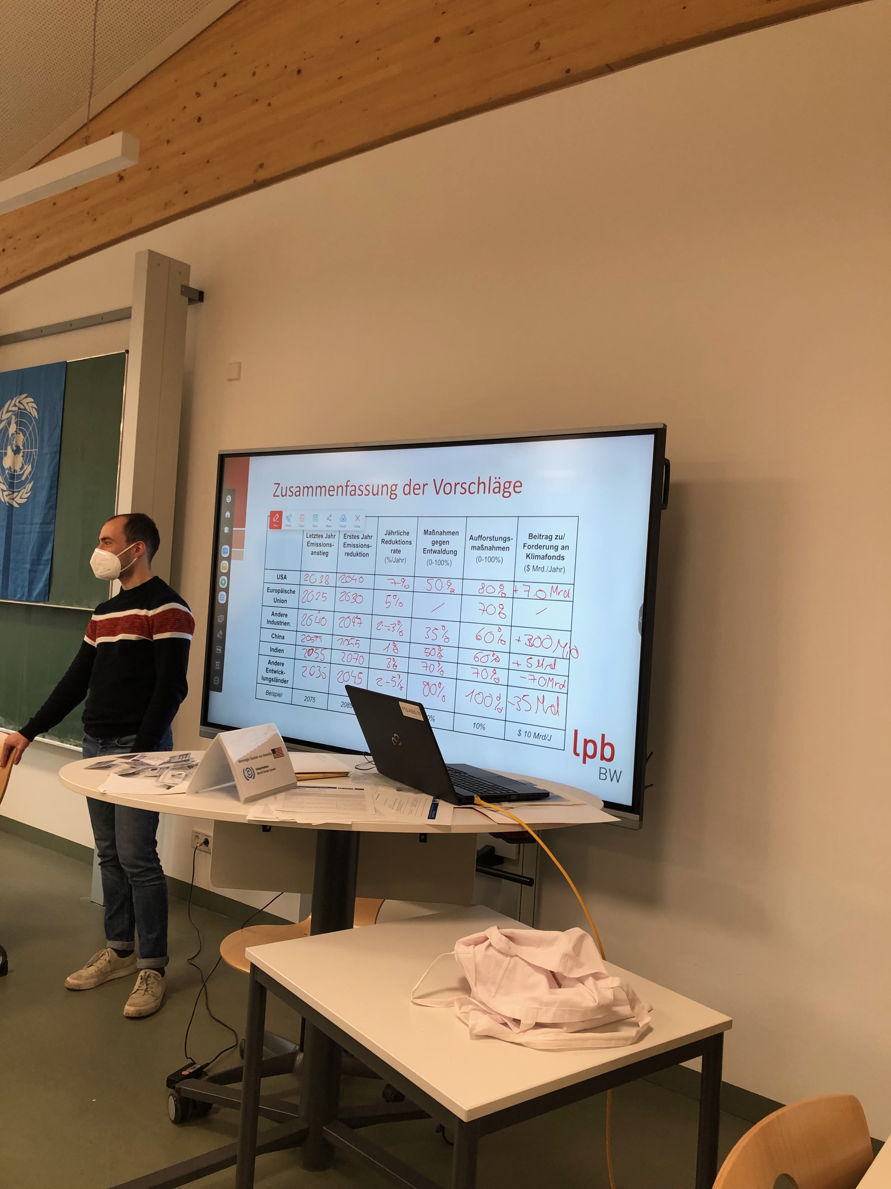 Nachdem durch eine Einführung zur UN und dem menschengemachten Klimawandel der theoretische Grundstein gelegt worden war, spielten die Teilnehmer*innen dieses Workshops ein Planspiel, in dem sie verschiedene Rollen wie China, Indien, die EU oder Nordamerika in der UN-Generalversammlung einnahmen. Gemeinsam mussten sie dann versuchen, einen Kompromiss auszuhandeln, durch den sie das 1,5°C-Ziel erreichen können.