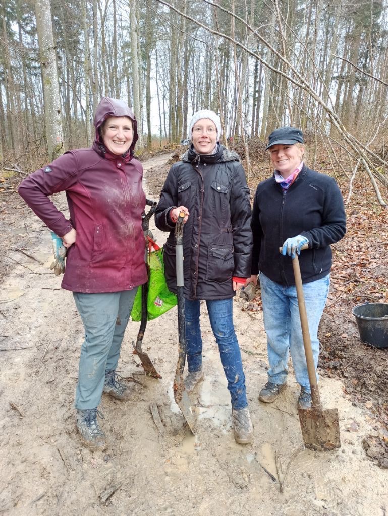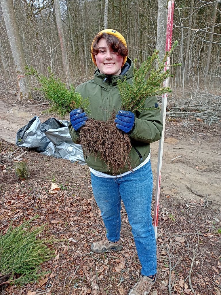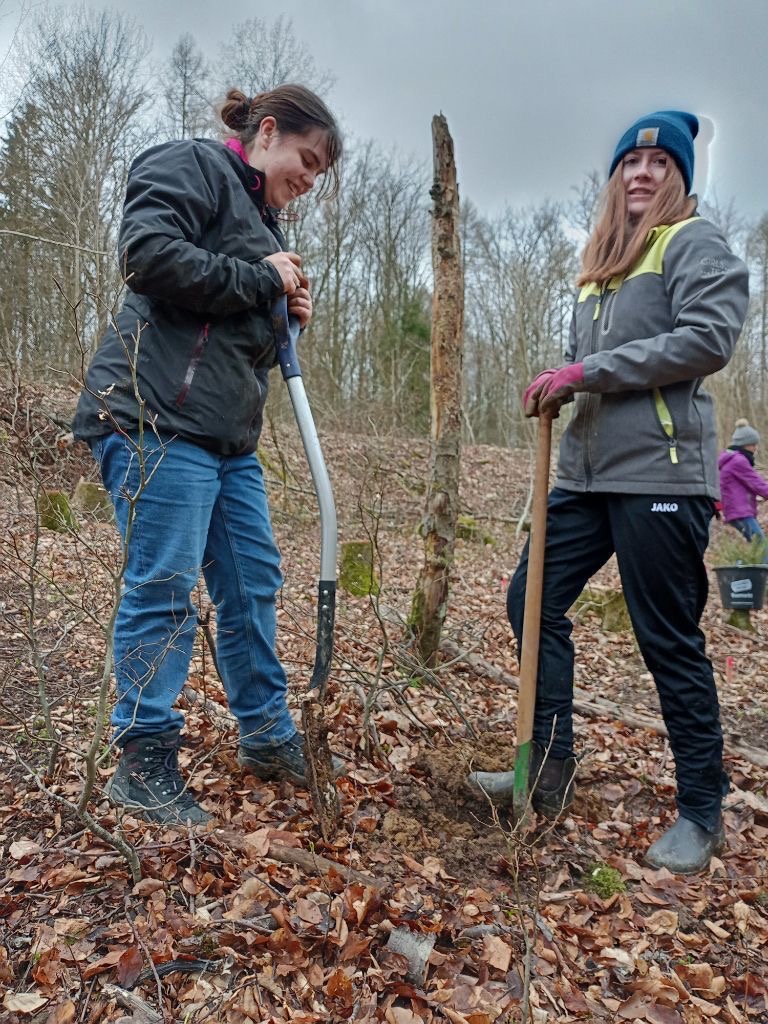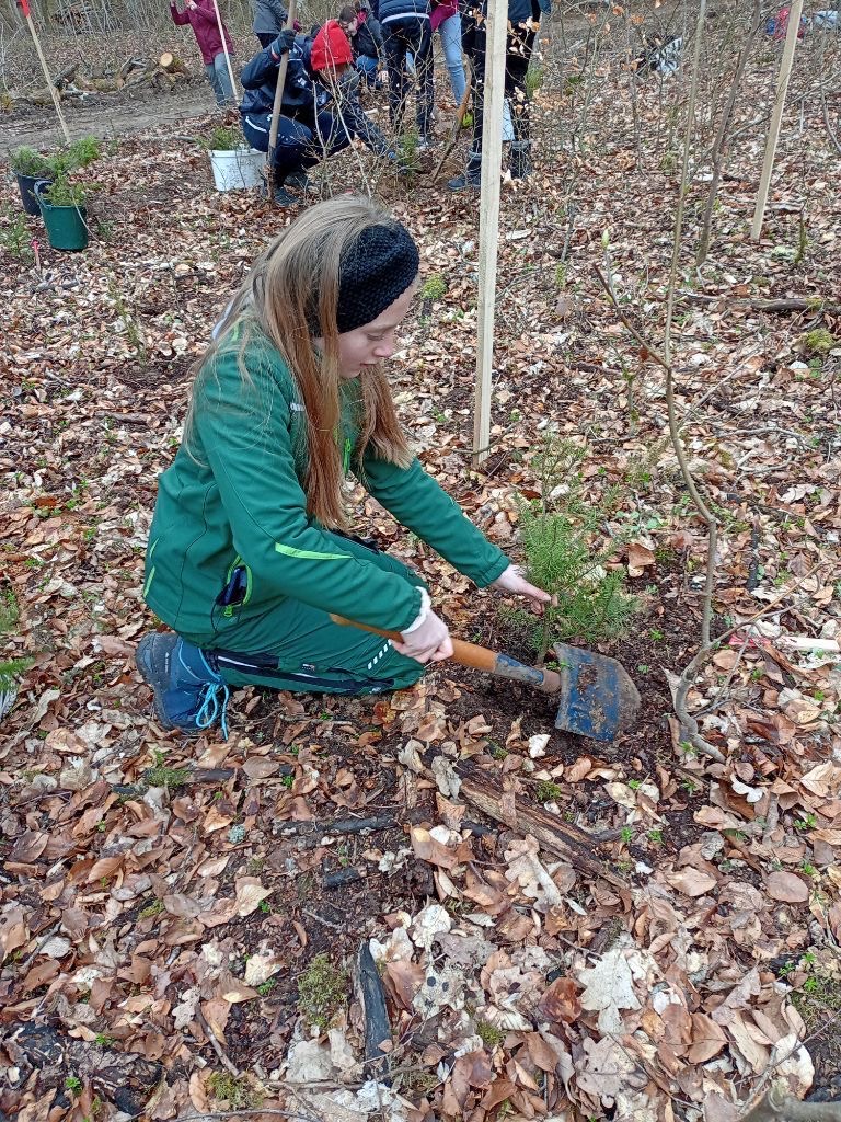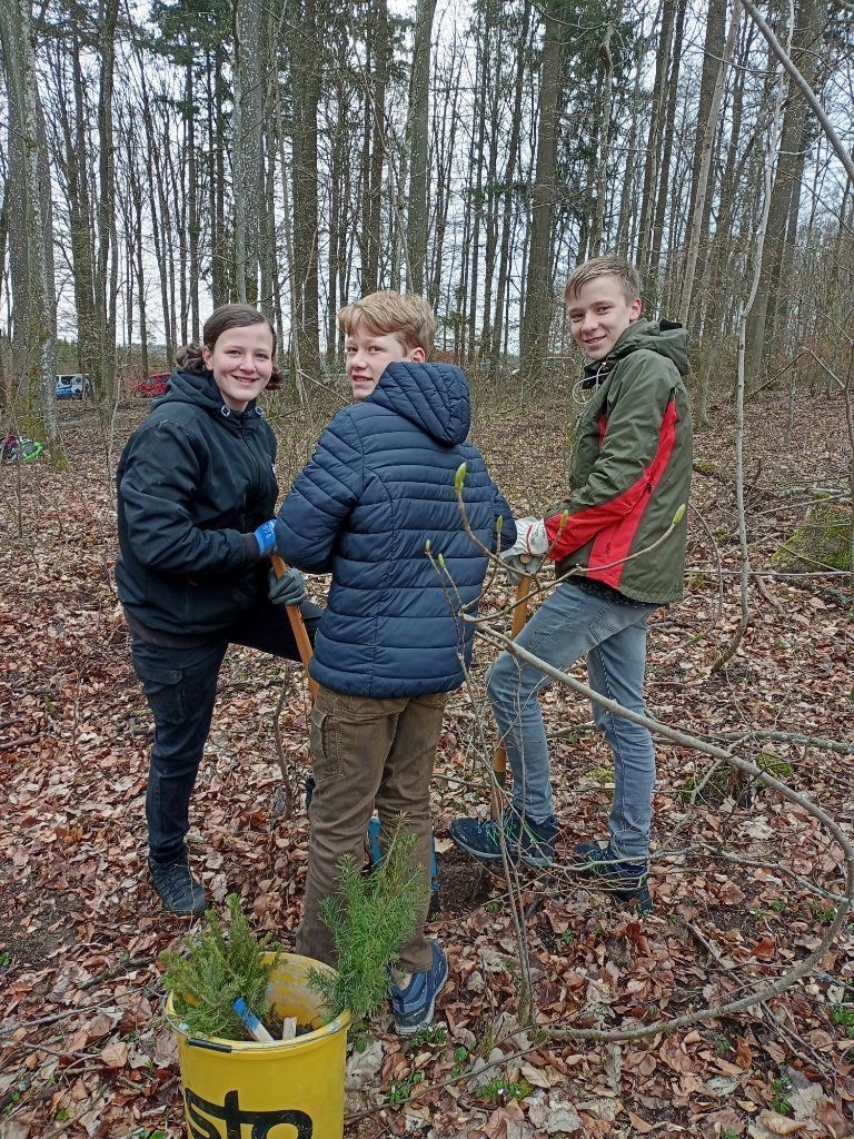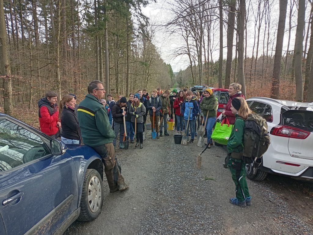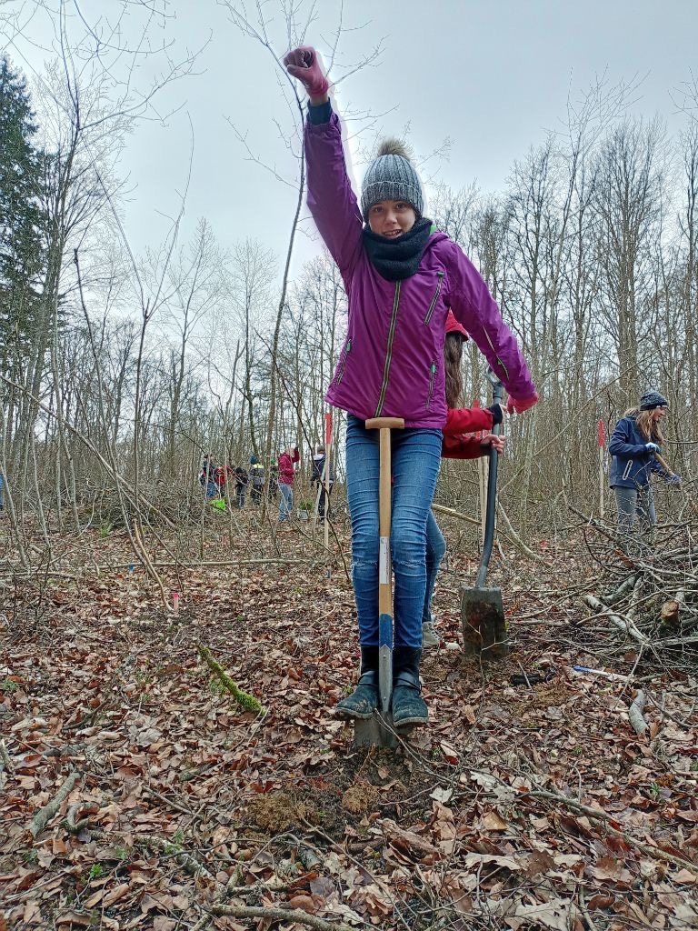 Trotz Regen und Matsch pflanzten die Schüler*innen, die diesen Workshop besuchten, gemeinsam mit dem Förster Bernhard Linsler nach einer ersten Schätzung ca. 500 Bäume in Hettingen. Dabei lernten sie unter anderem den Unterschied zwischen einer Fichte und einer Douglasie kennen.
