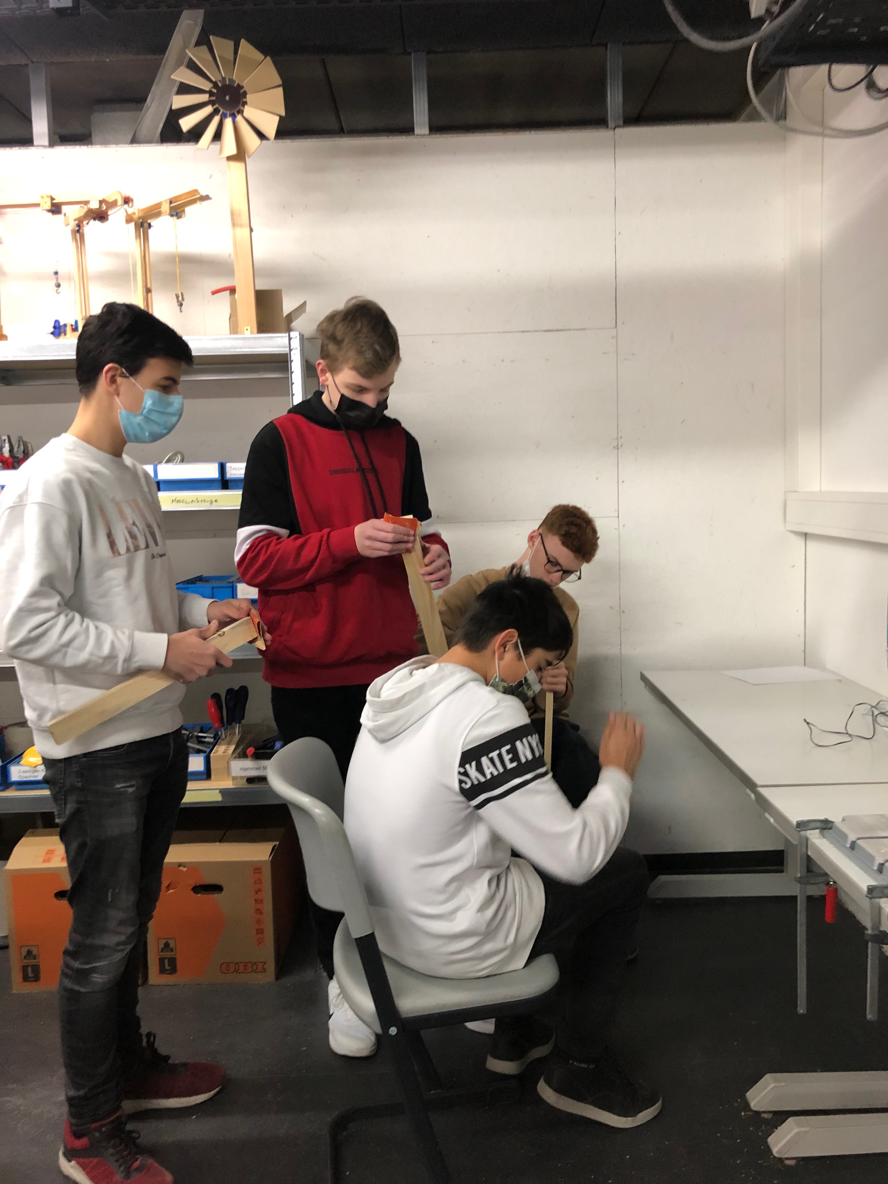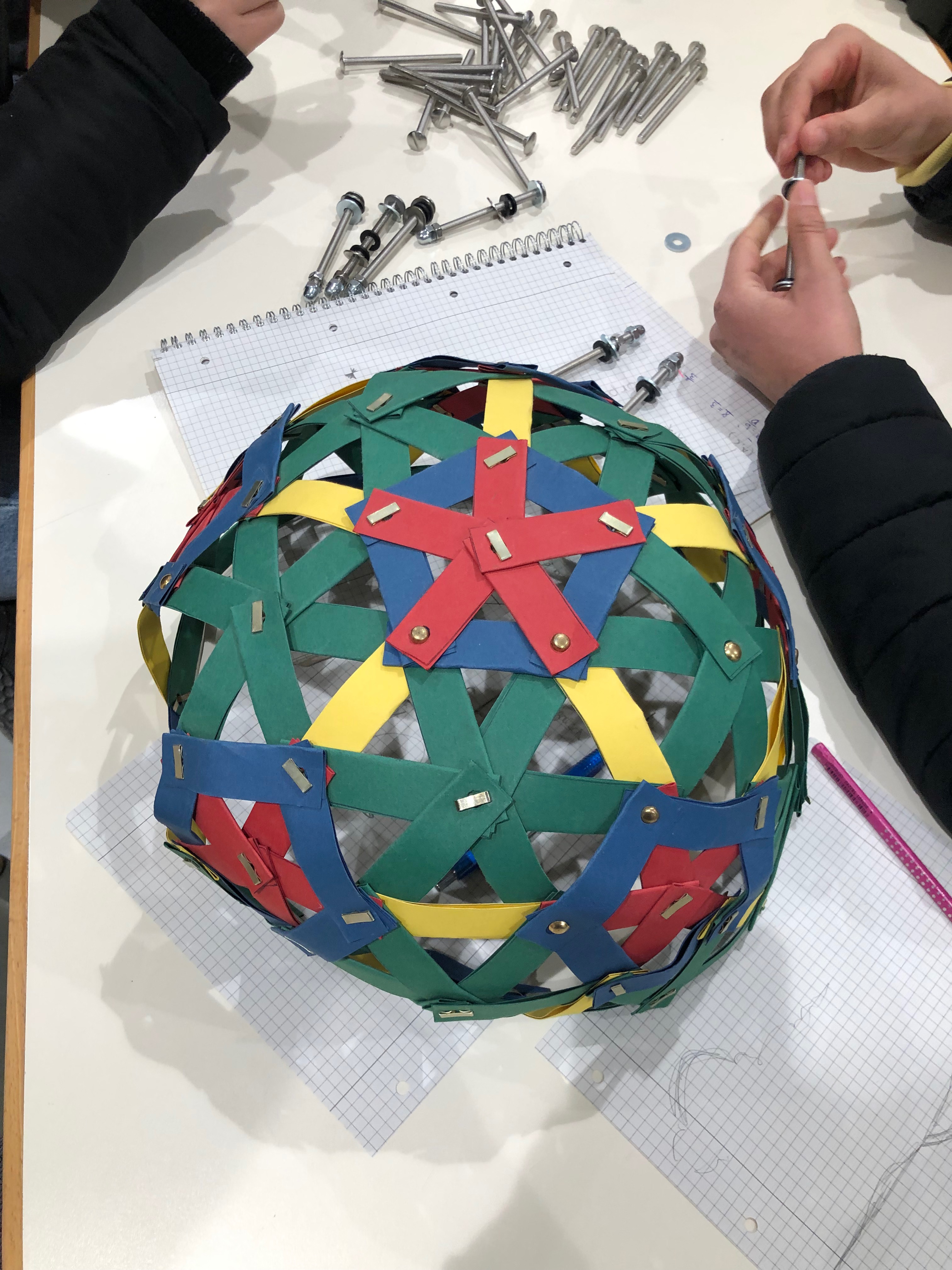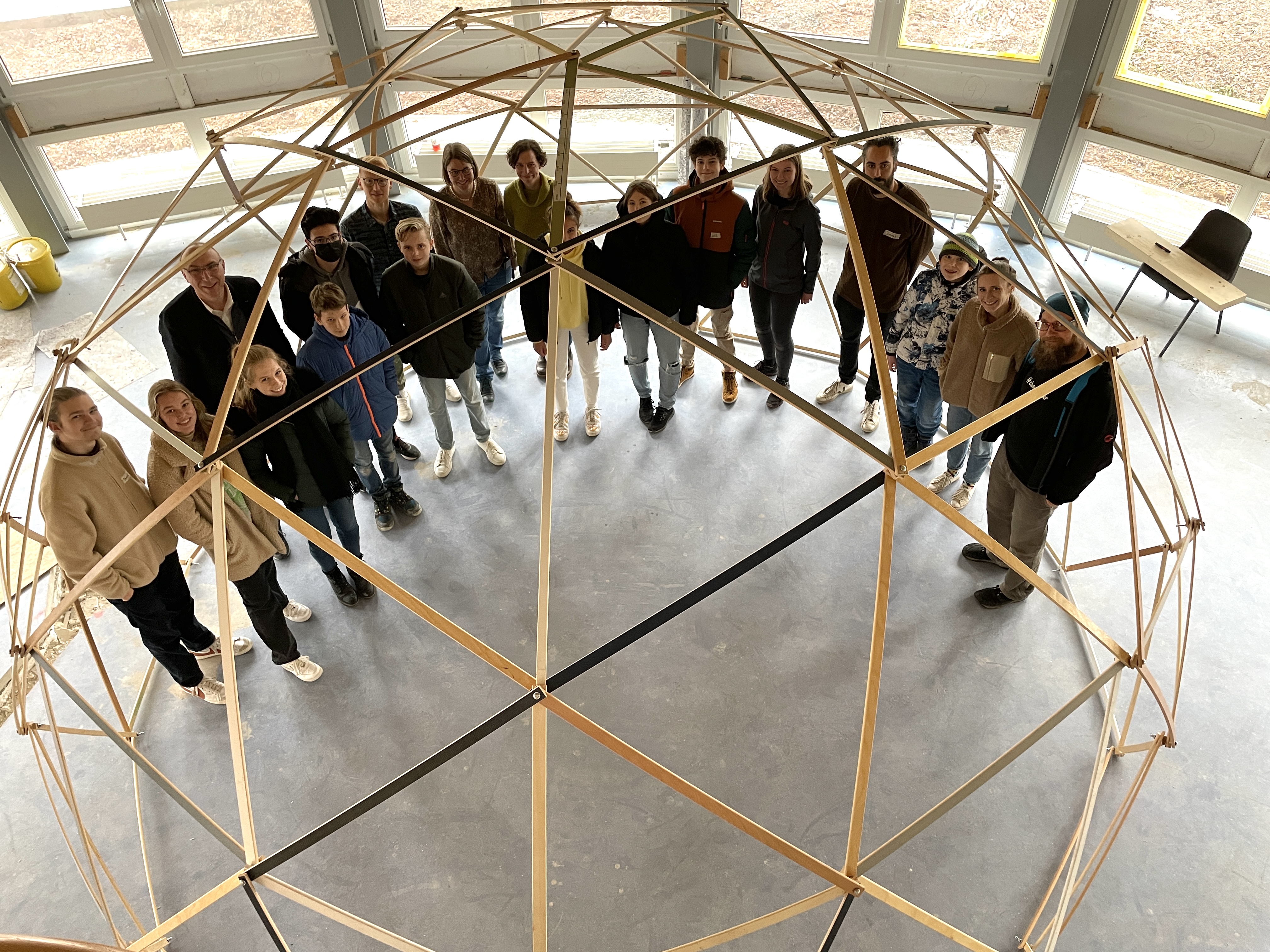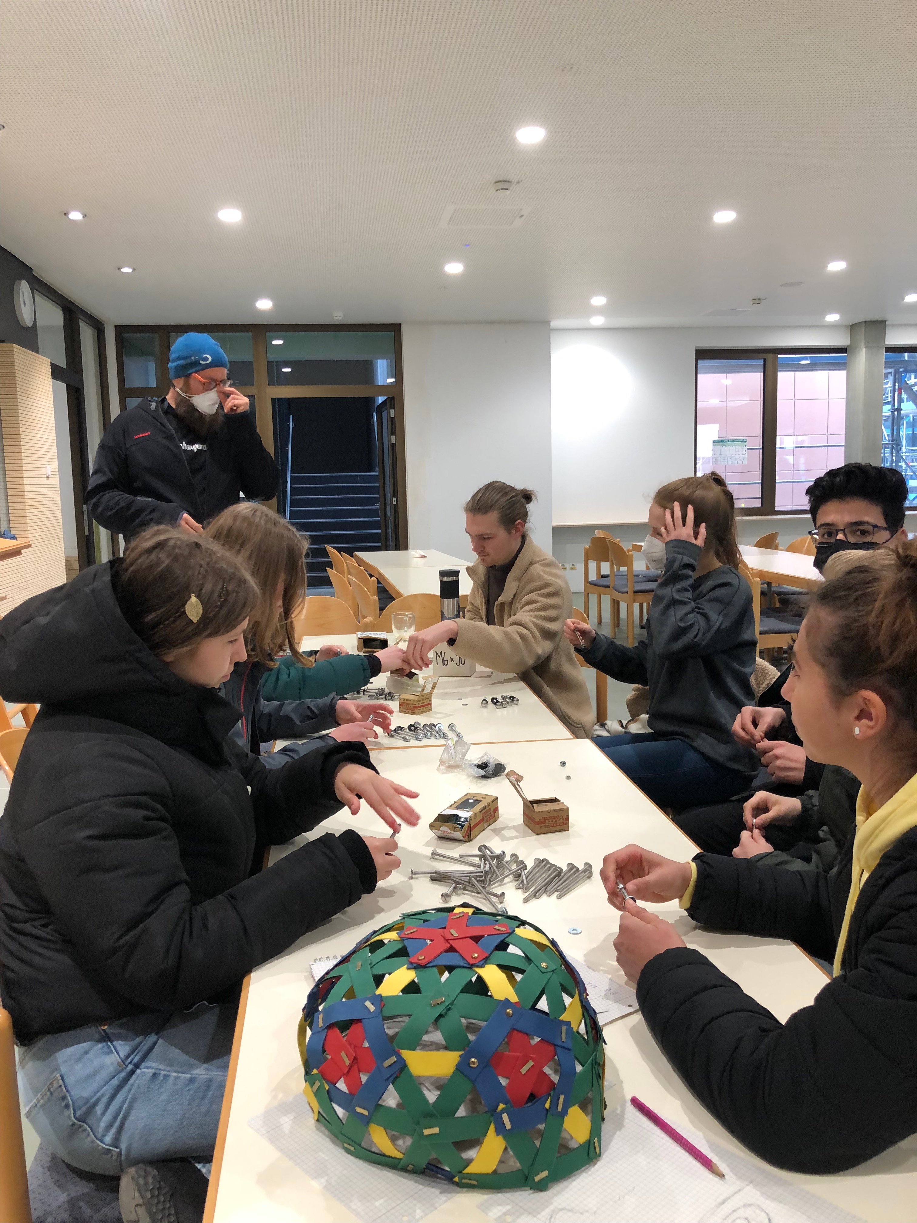 Im Workshop zu nachhaltiger Architektur wurde von den Teilnehmer*innen nach Anfertigung eines Modells eine geodätische Kuppel gebaut, die zurzeit in der Schule zwischengelagert wird, um im Sommer aufgestellt zu werden, sodass sie als Aufenthaltsmöglichkeit auf dem Schulgelände dient. Auch erfuhren sie etwas über den Unterschied zwischen Up- und Recycling sowie die benötigten Ressourcen für den Bau diverser Möbelstücke.