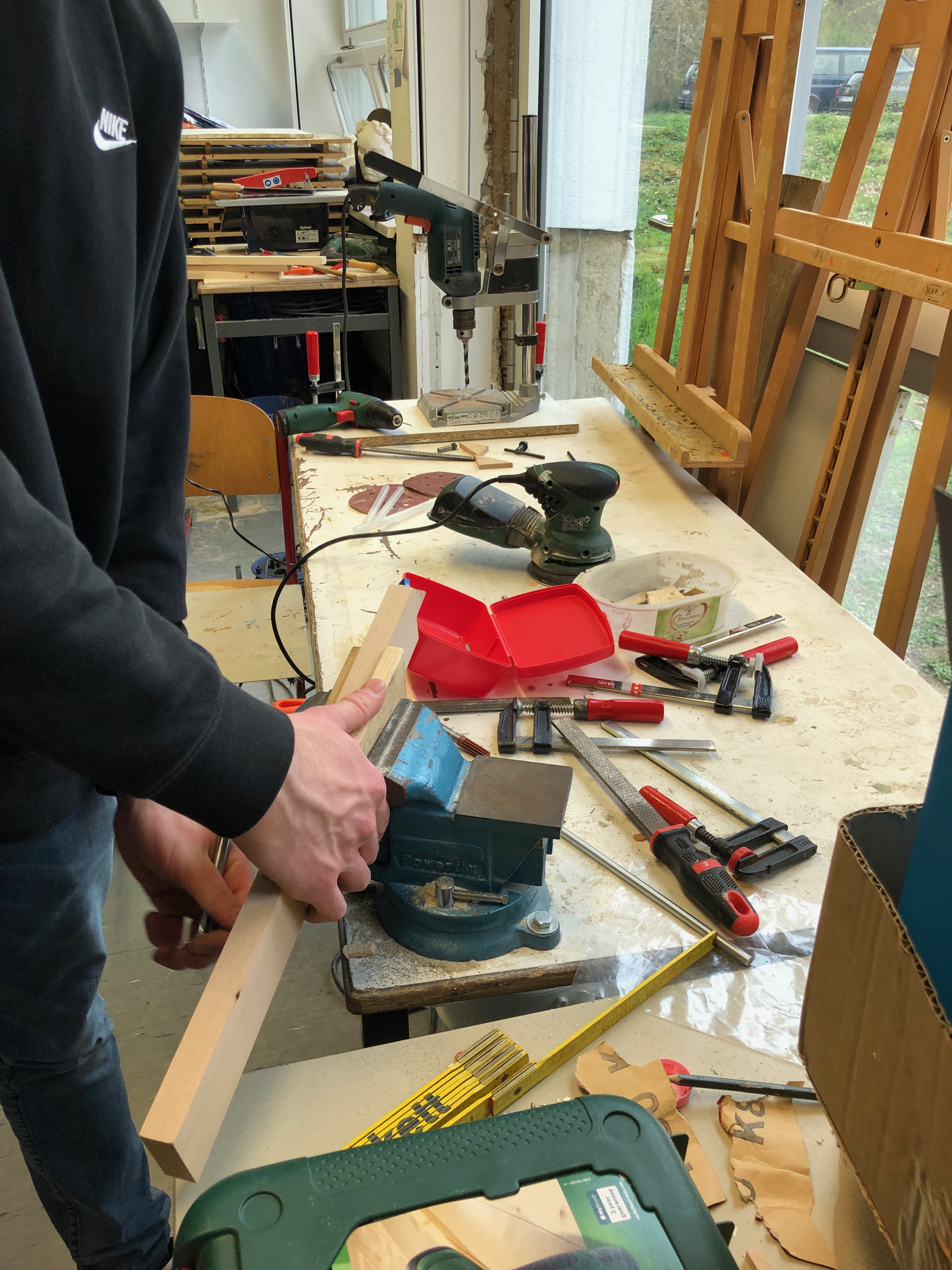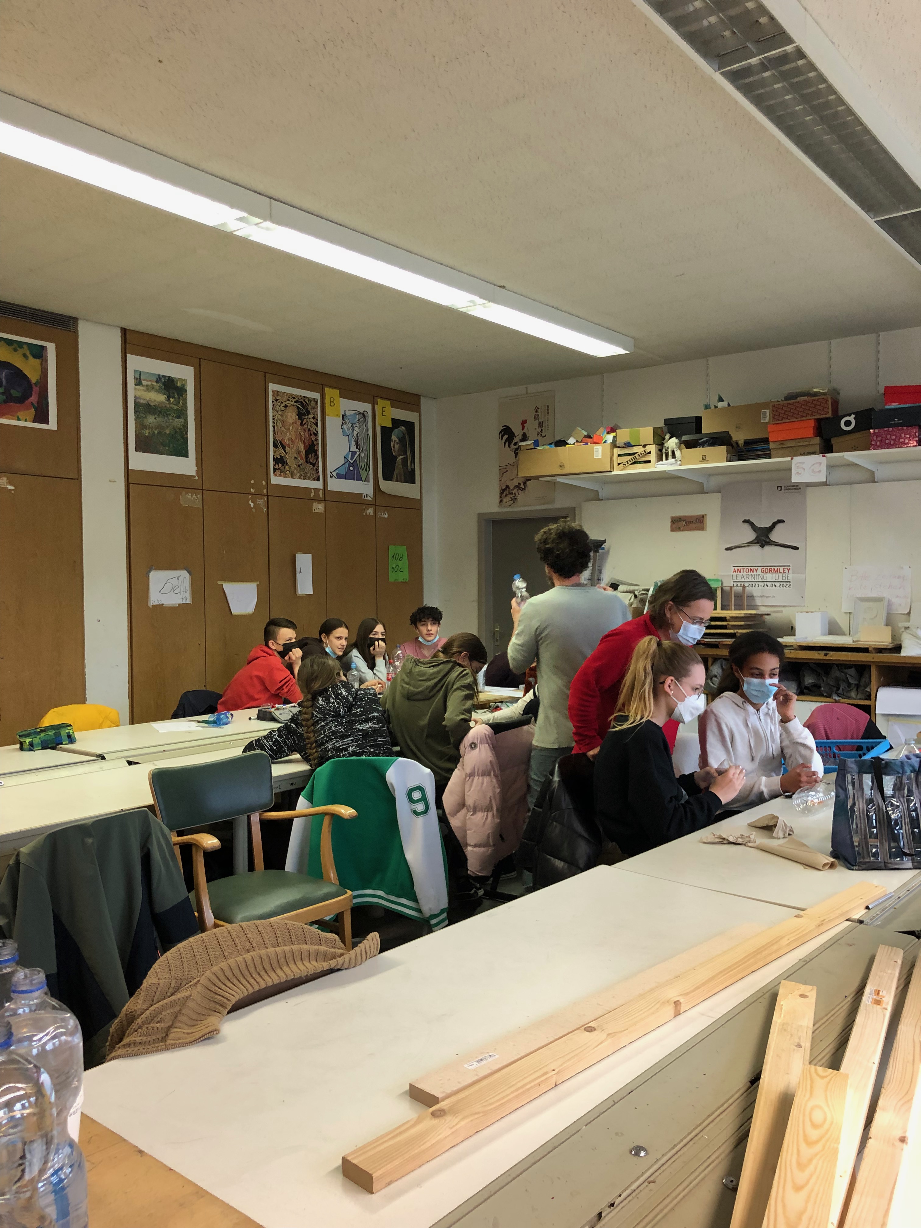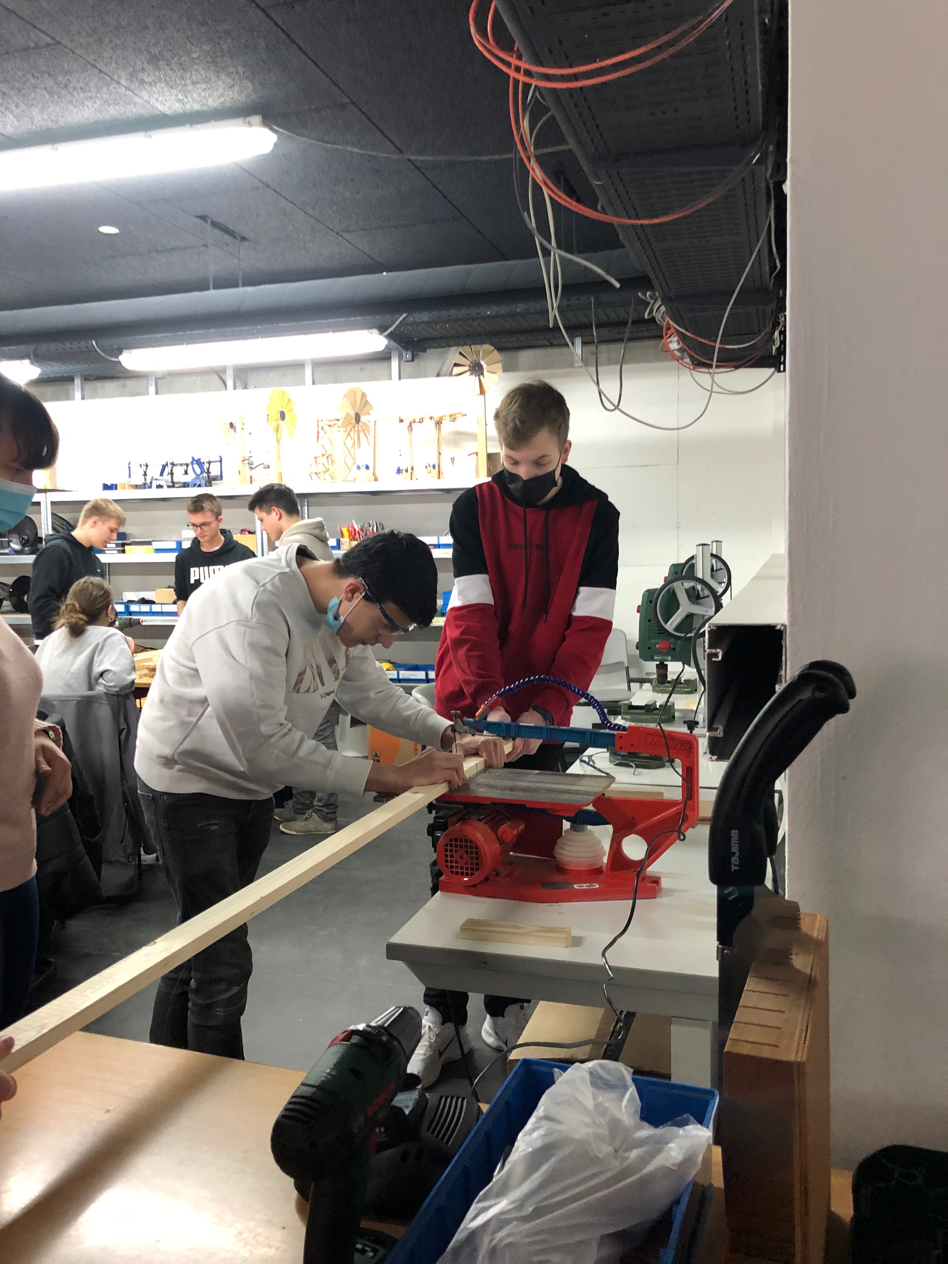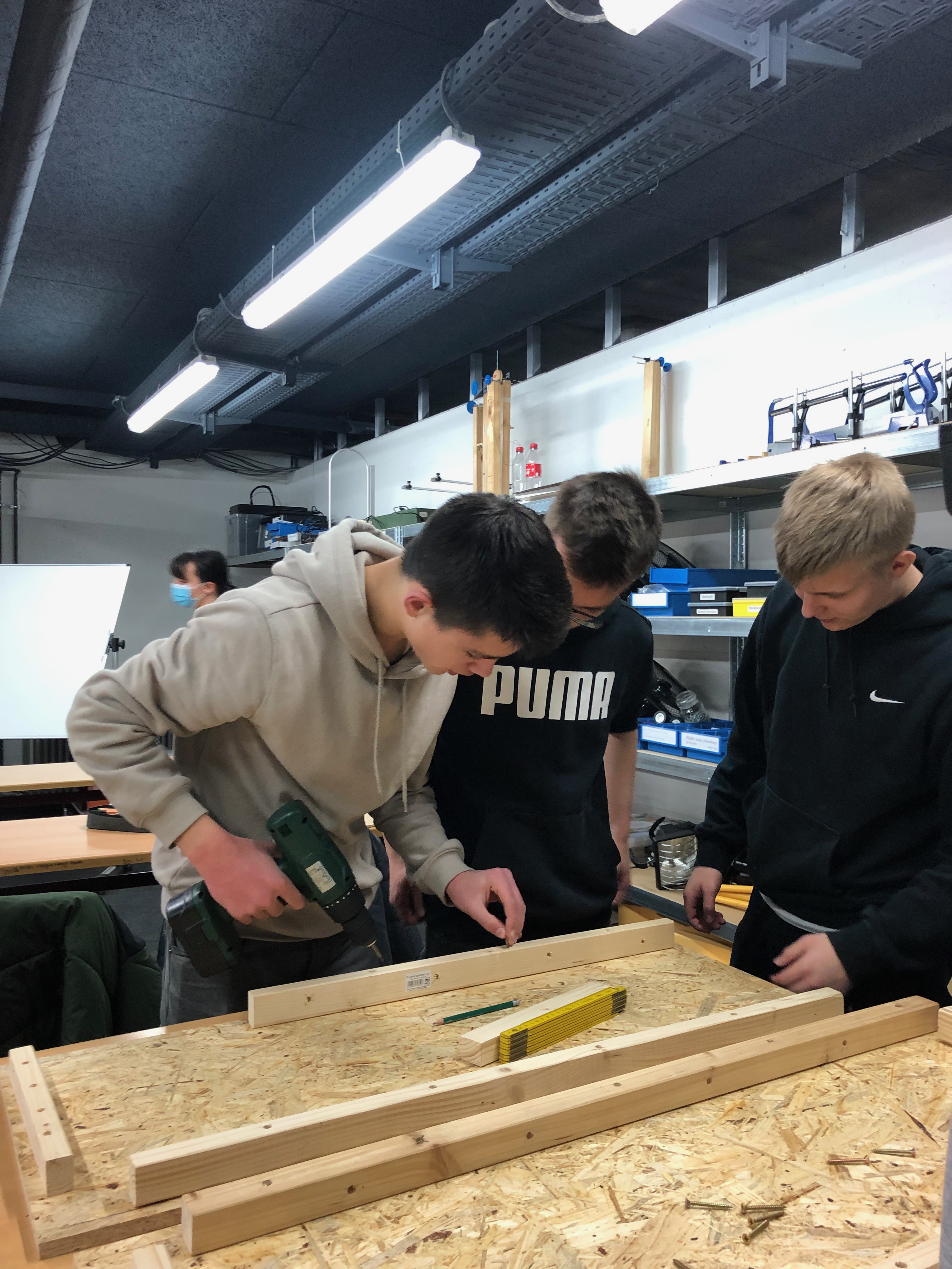 Im Workshop zu nachhaltiger Architektur wurde von den Teilnehmer*innen nach Anfertigung eines Modells eine geodätische Kuppel gebaut, die zurzeit in der Schule zwischengelagert wird, um im Sommer aufgestellt zu werden, sodass sie als Aufenthaltsmöglichkeit auf dem Schulgelände dient. Auch erfuhren sie etwas über den Unterschied zwischen Up- und Recycling sowie die benötigten Ressourcen für den Bau diverser Möbelstücke.