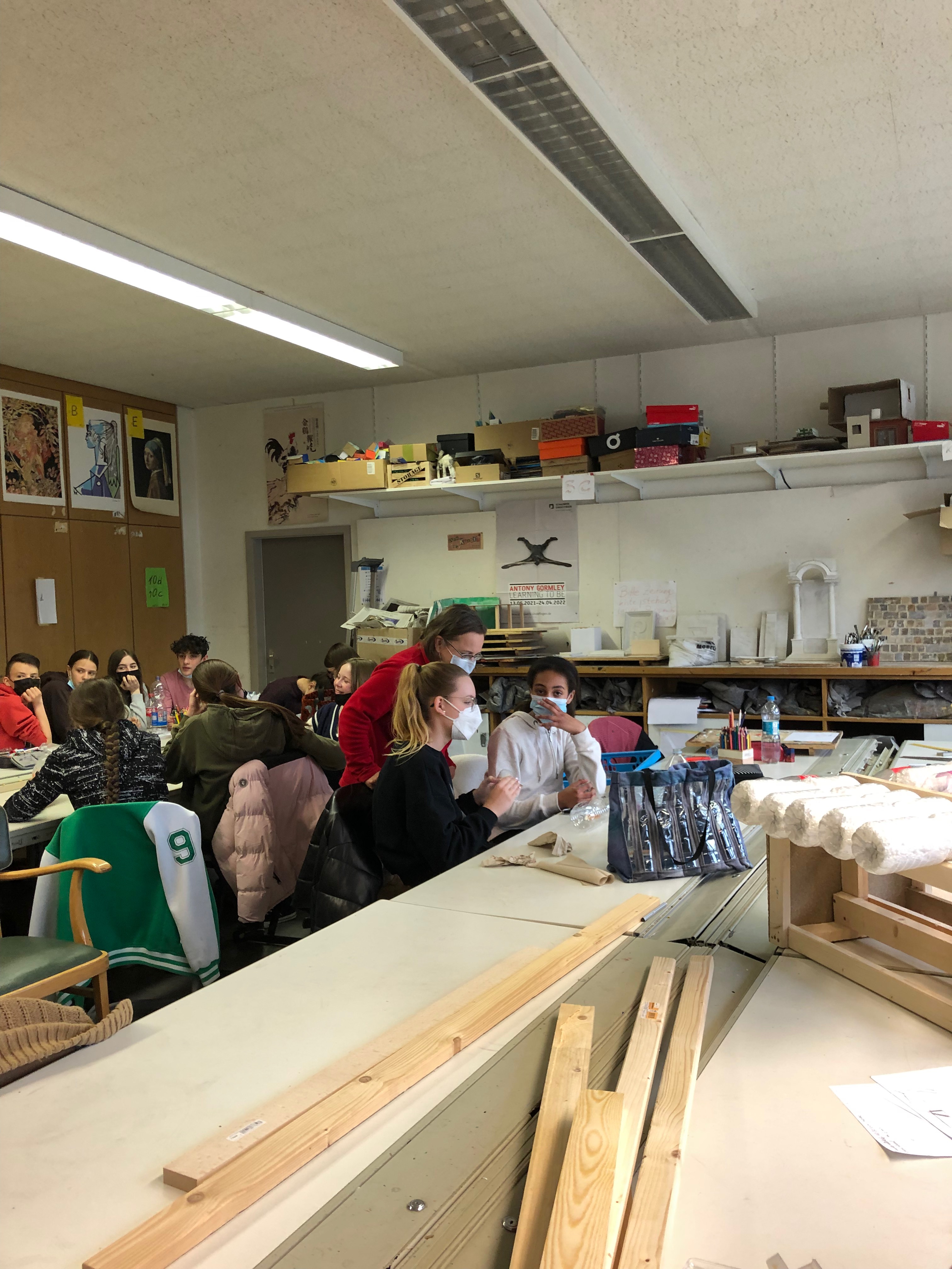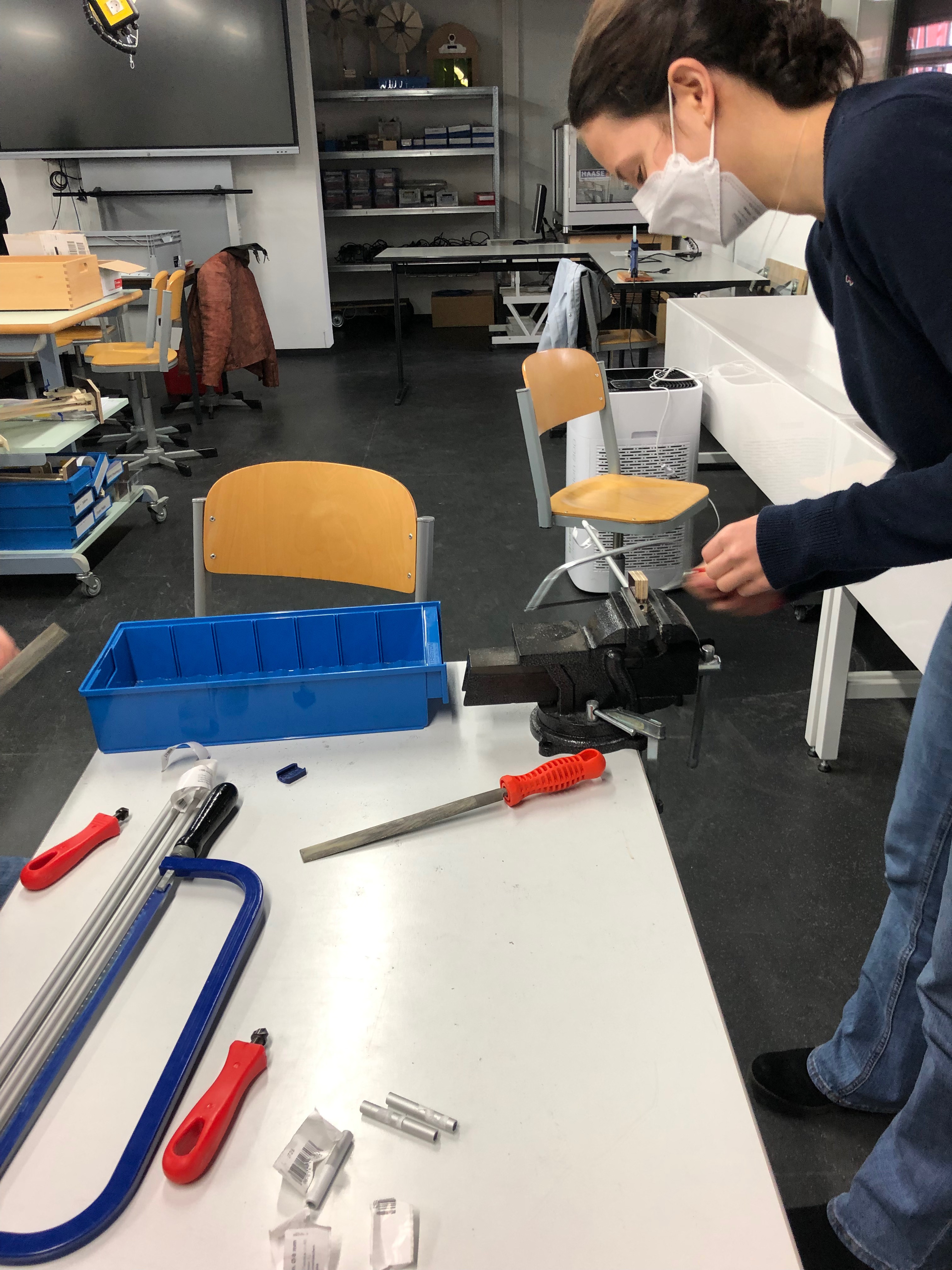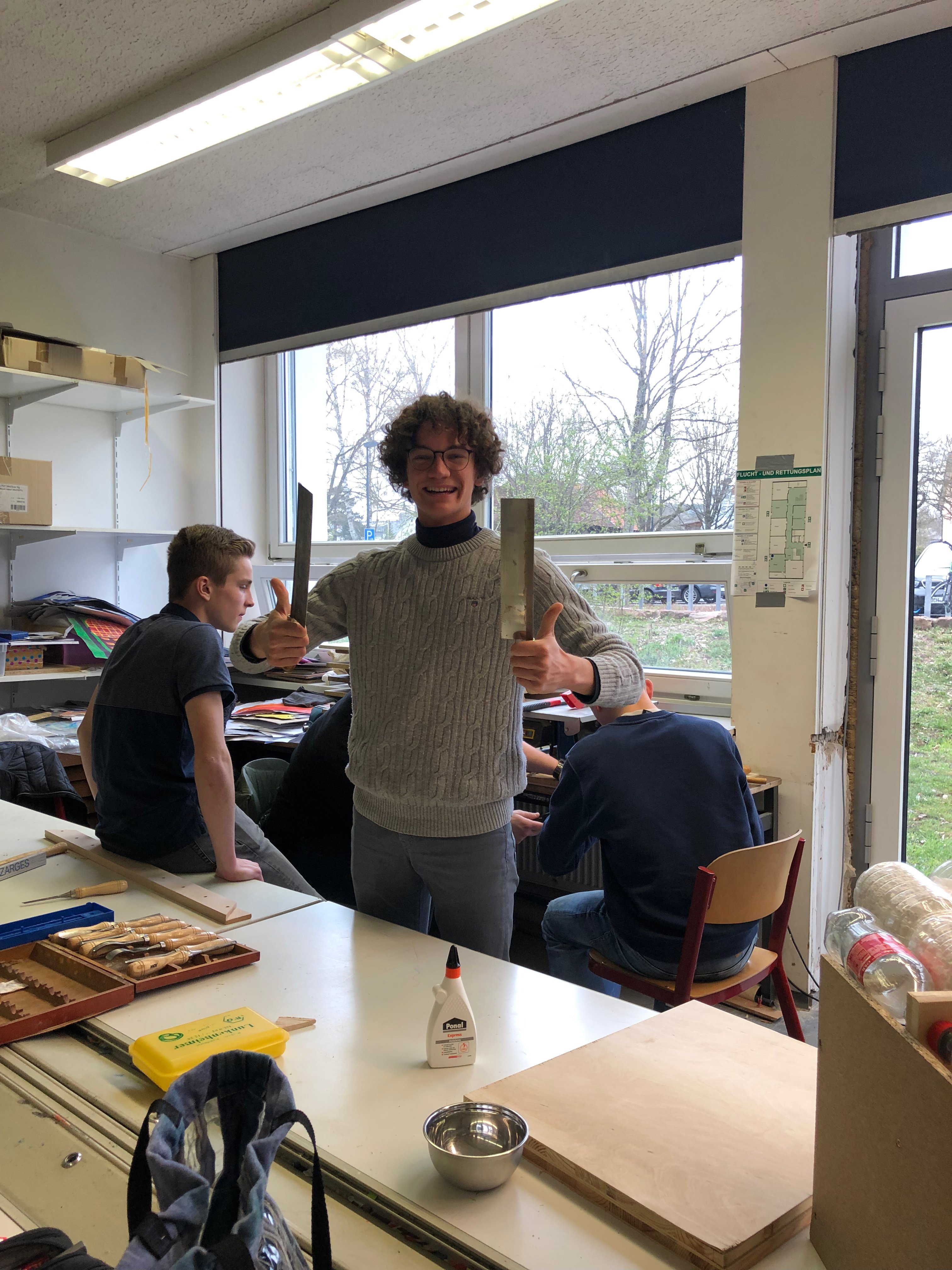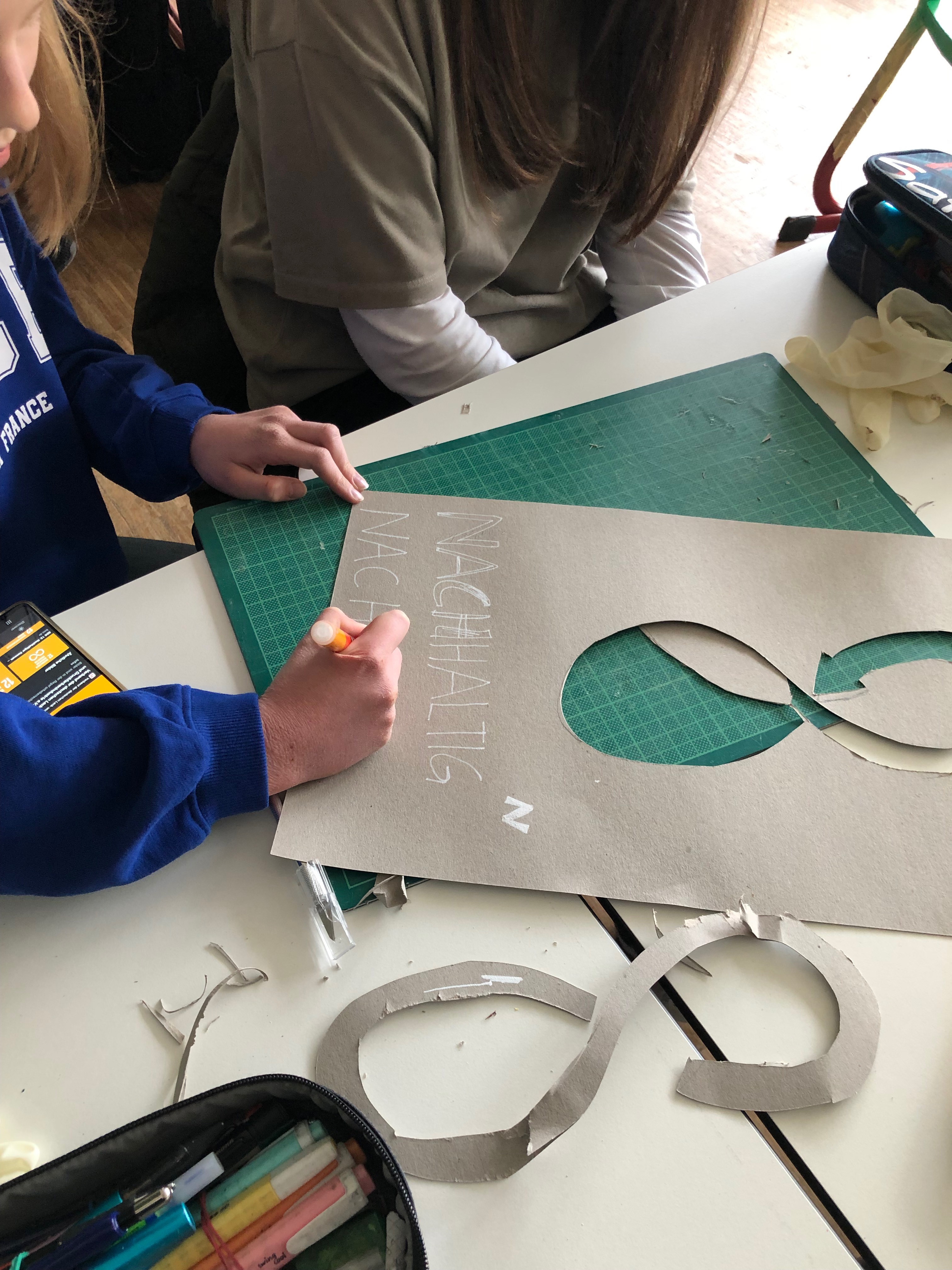Im Workshop zu nachhaltiger Architektur wurde von den Teilnehmer*innen nach Anfertigung eines Modells eine geodätische Kuppel gebaut, die zurzeit in der Schule zwischengelagert wird, um im Sommer aufgestellt zu werden, sodass sie als Aufenthaltsmöglichkeit auf dem Schulgelände dient. Auch erfuhren sie etwas über den Unterschied zwischen Up- und Recycling sowie die benötigten Ressourcen für den Bau diverser Möbelstücke.