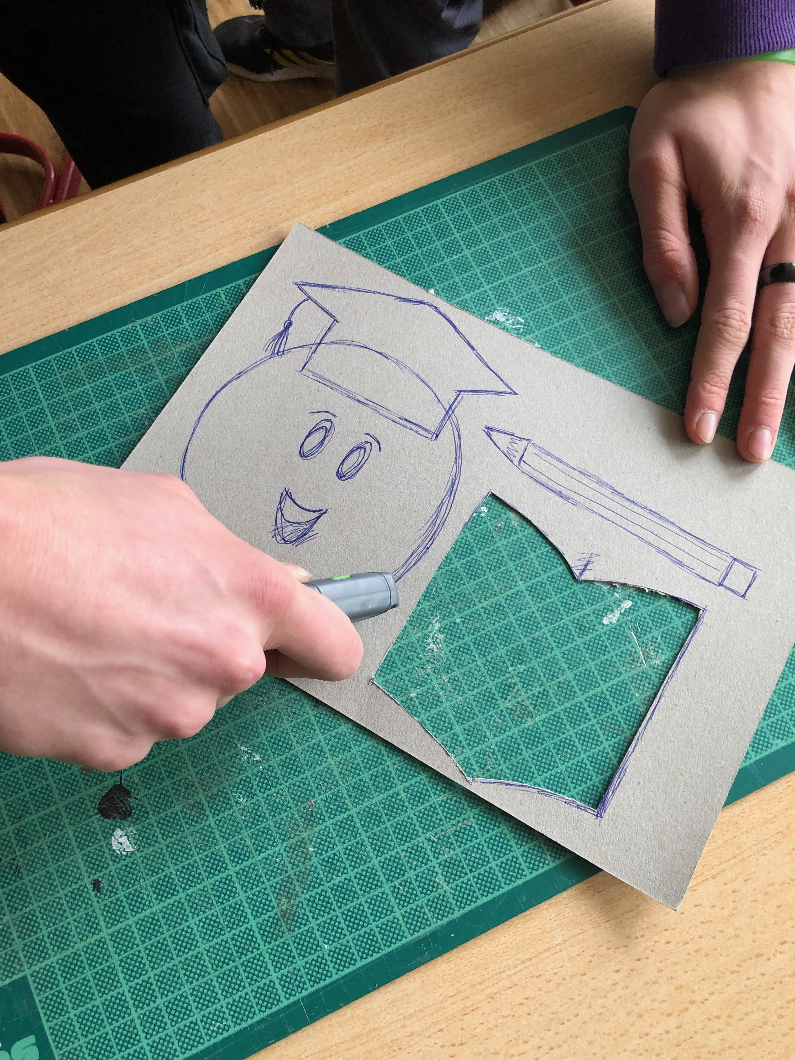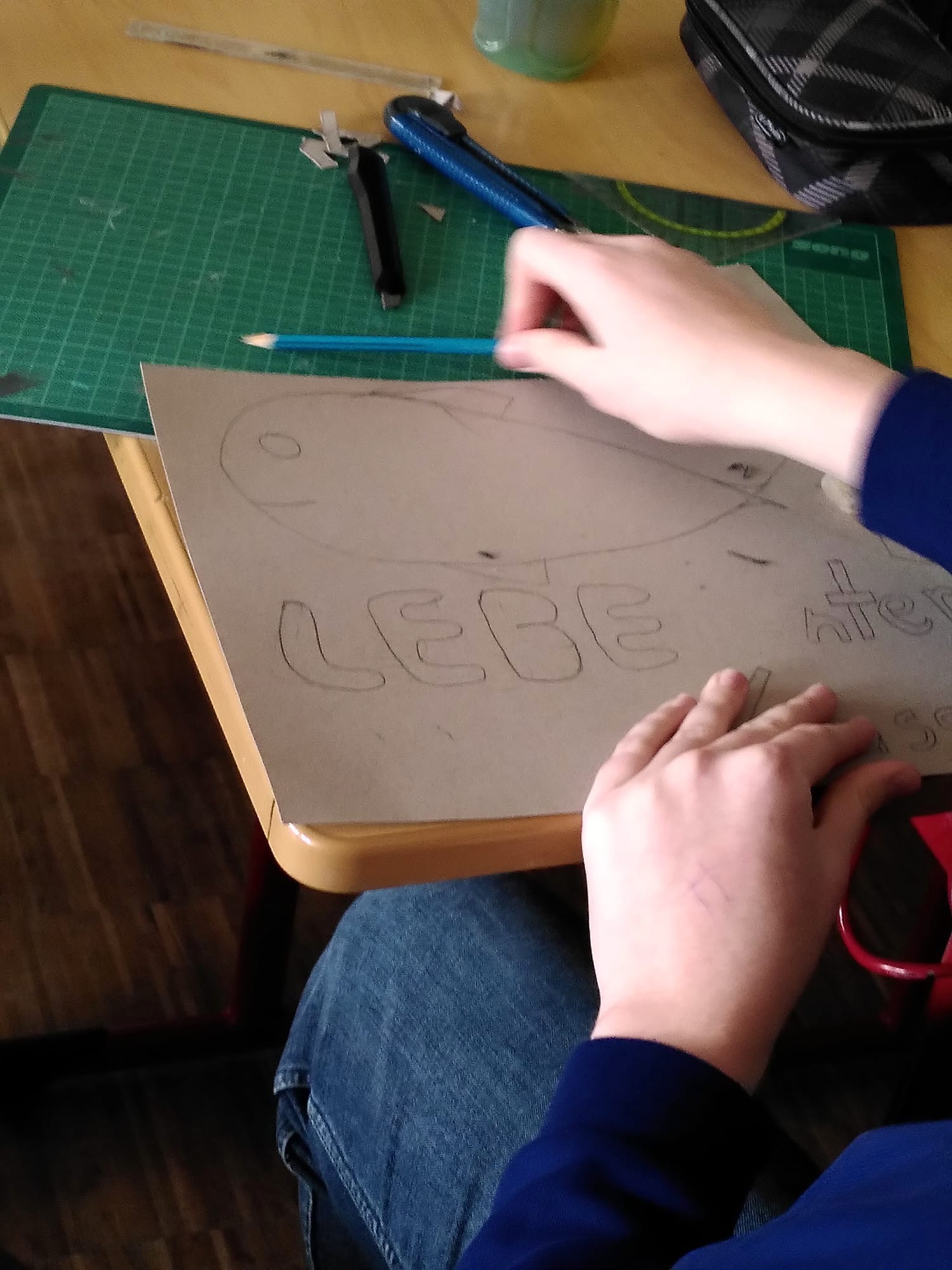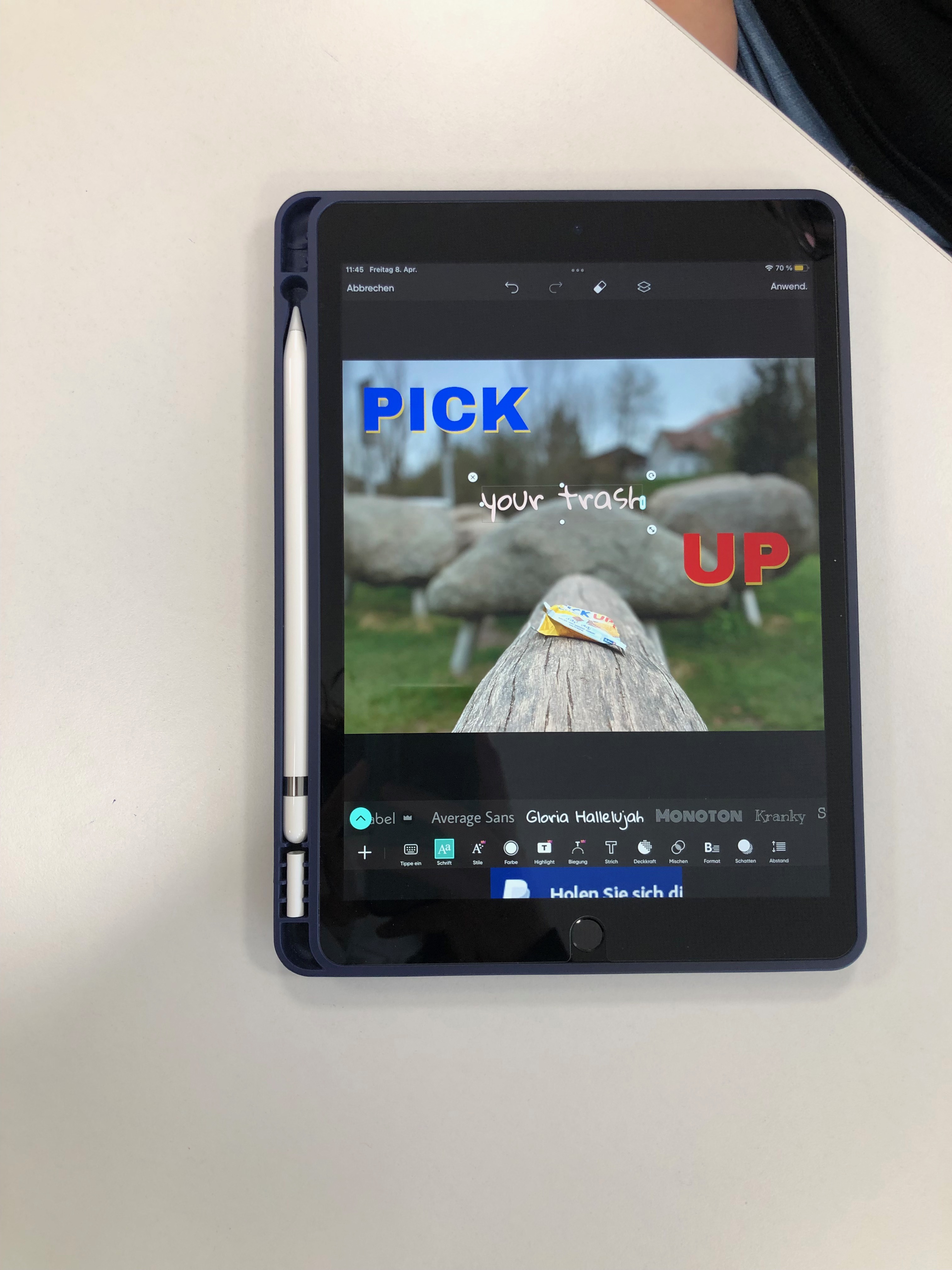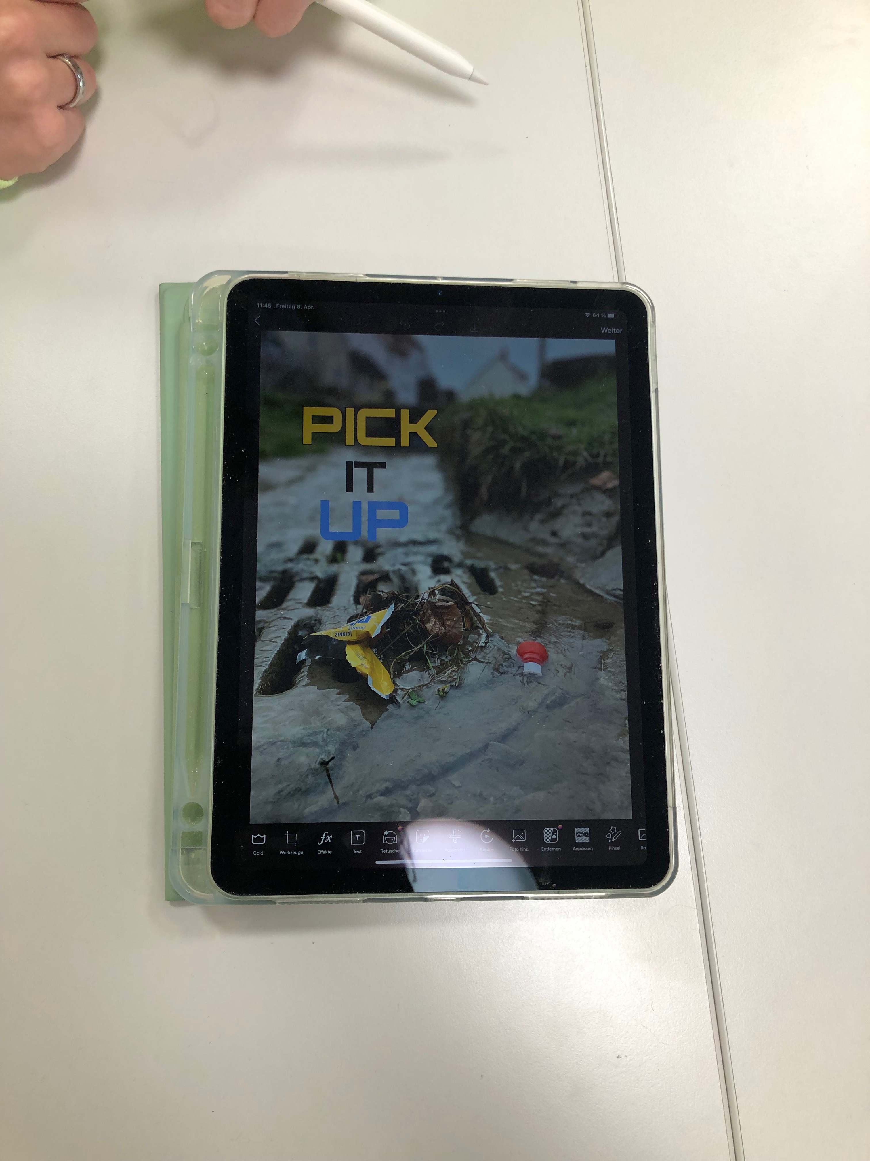 Nach einer theoretischen Einführung in die Problematik des Plastikmülls in der Umwelt, wurden erst einmal Kameratechniken und Möglichkeiten der Plakatgestaltung besprochen, bevor die Schüler*innen ihr neu erlangtes Wissen draußen anwenden durften. Sie fotografierten verschiedenen Müll, wie zerdrückte Getränkedosen oder die Verpackungen von Süßigkeiten. Diese Bilder nutzten sie, um mit eigenen Slogans Plakate gegen die Umweltverschmutzung durch Müll bzw. die illegale Müllentsorgung zu erstellen, die im Schulhaus und möglicherweise auch im Stadtgebiet aufgehängt werden sollen.
