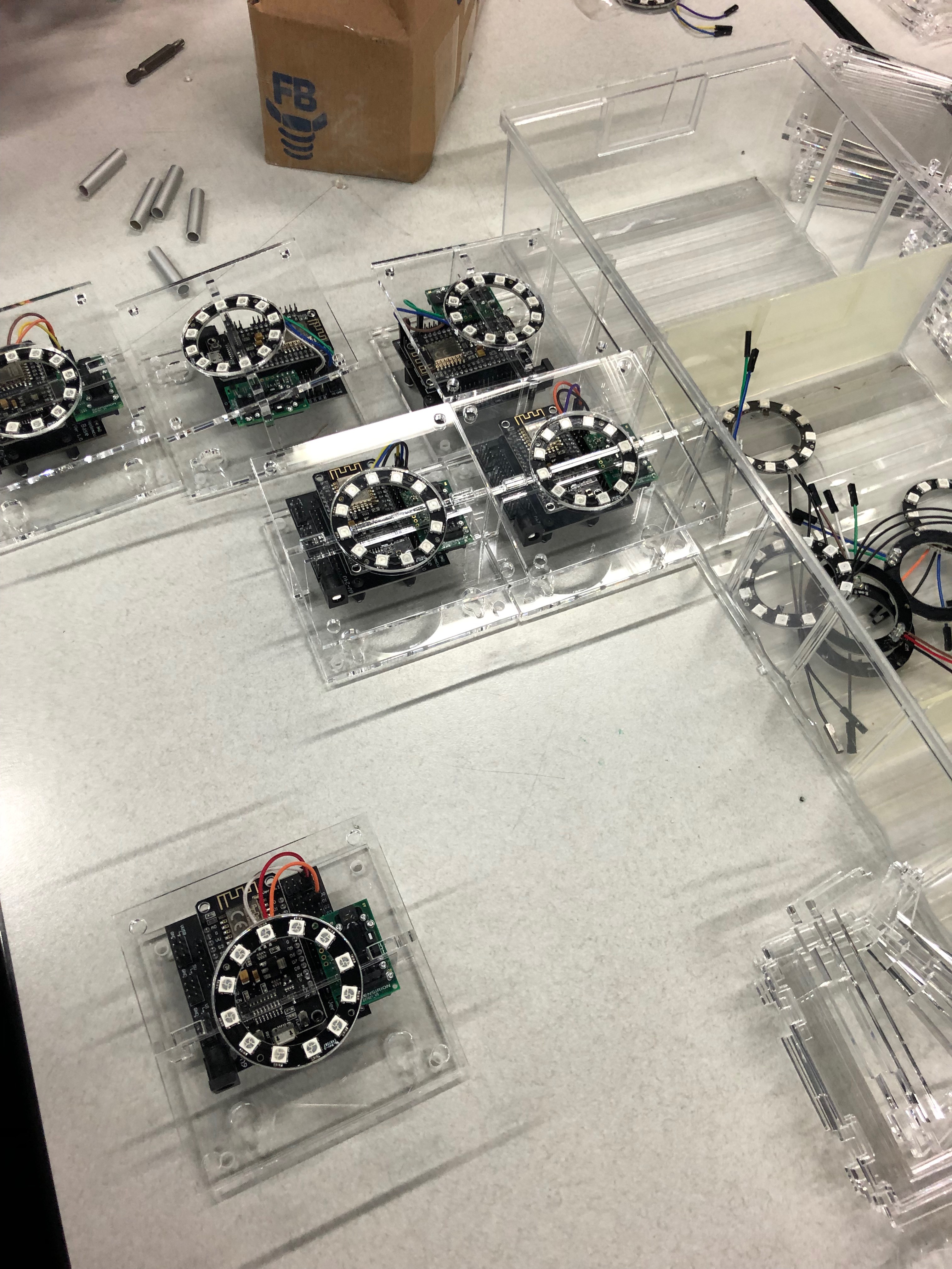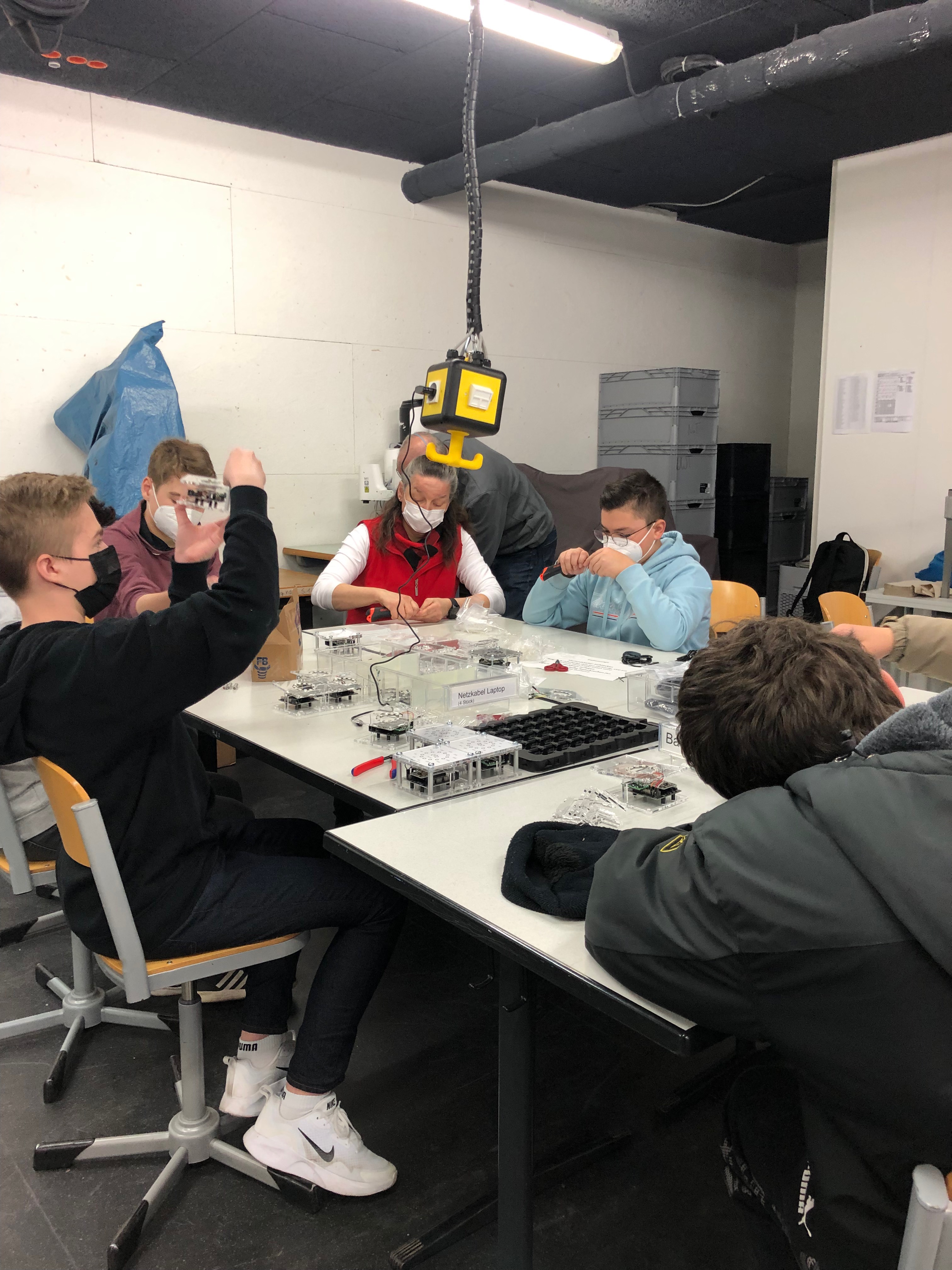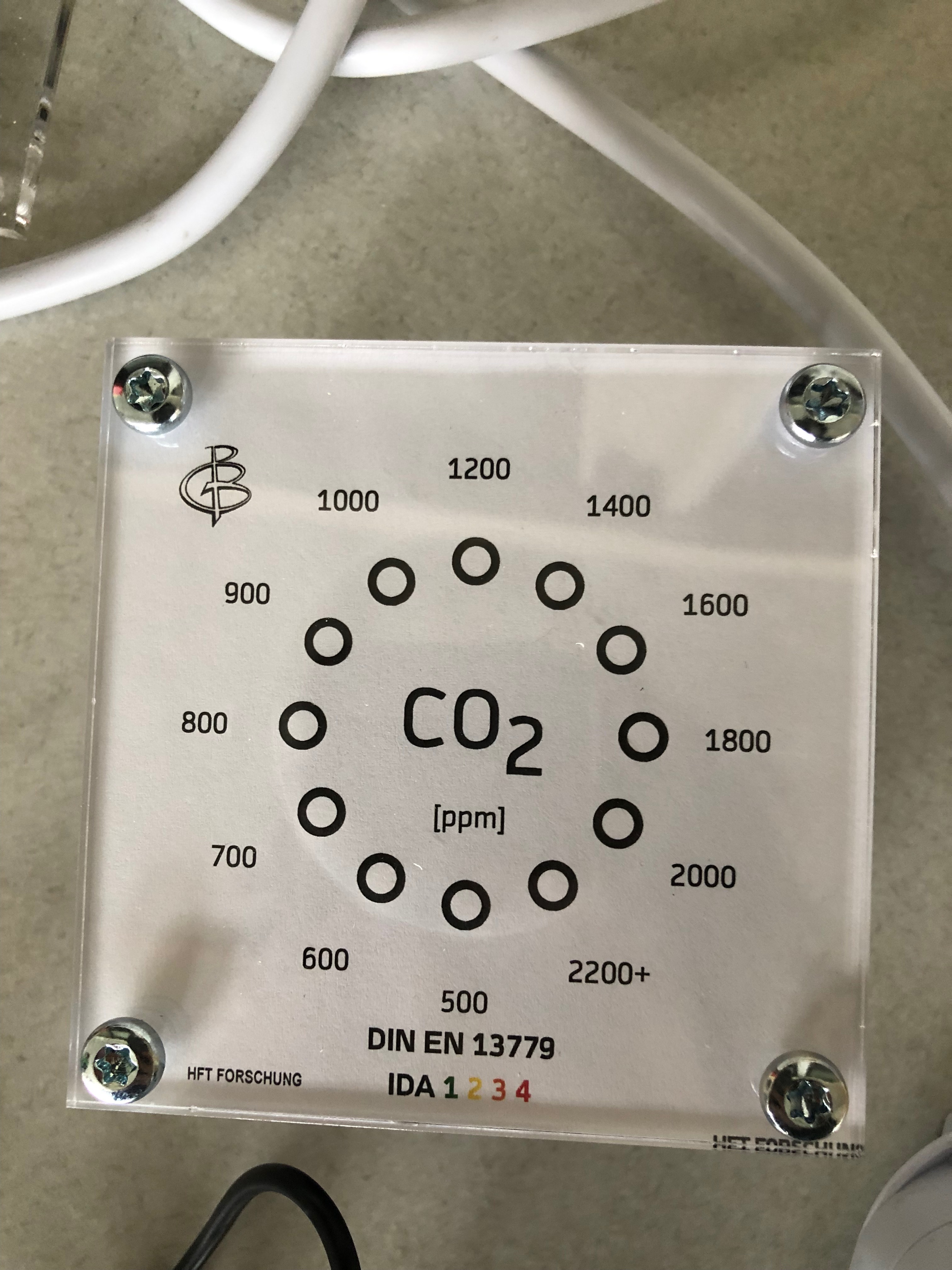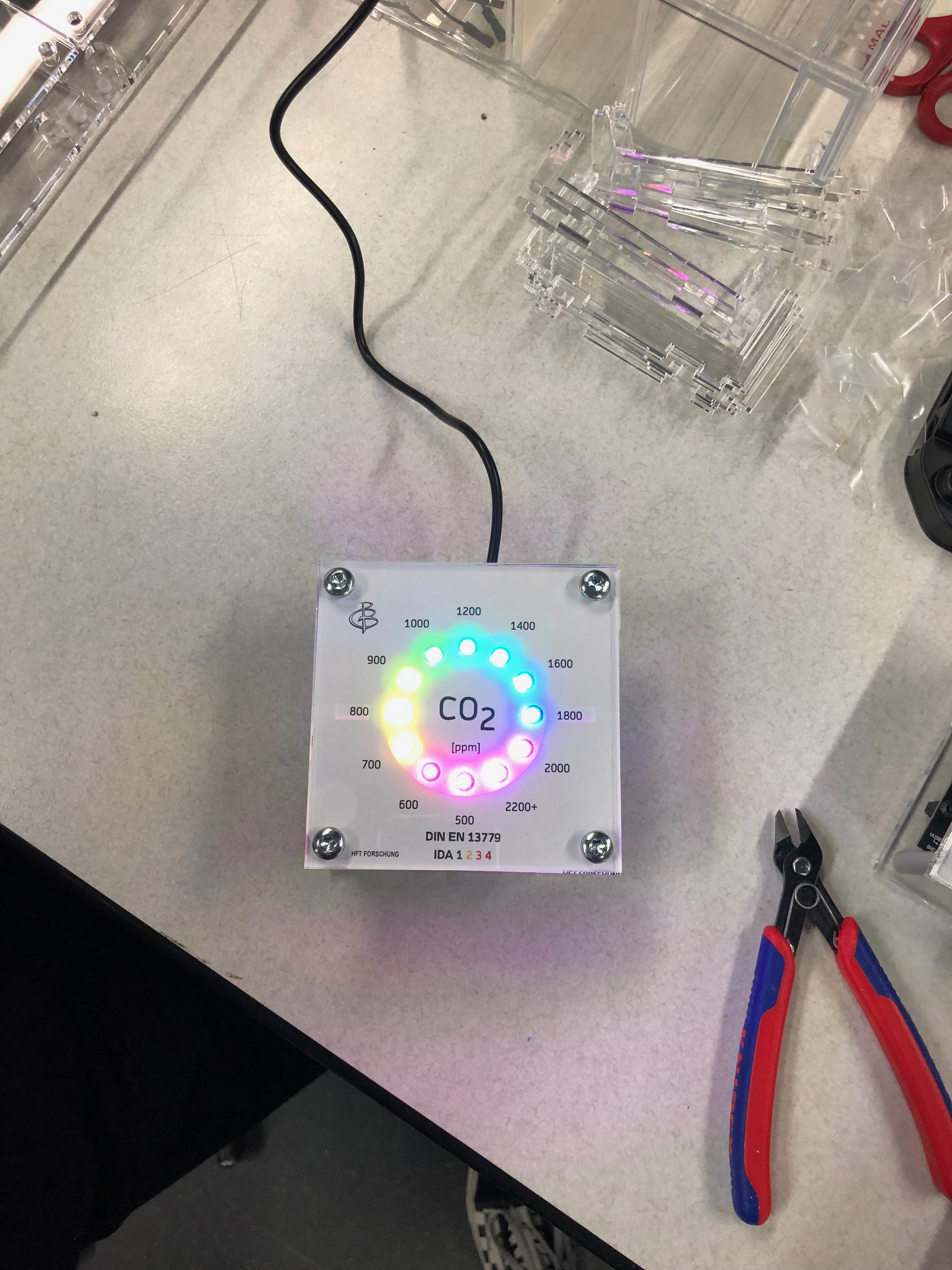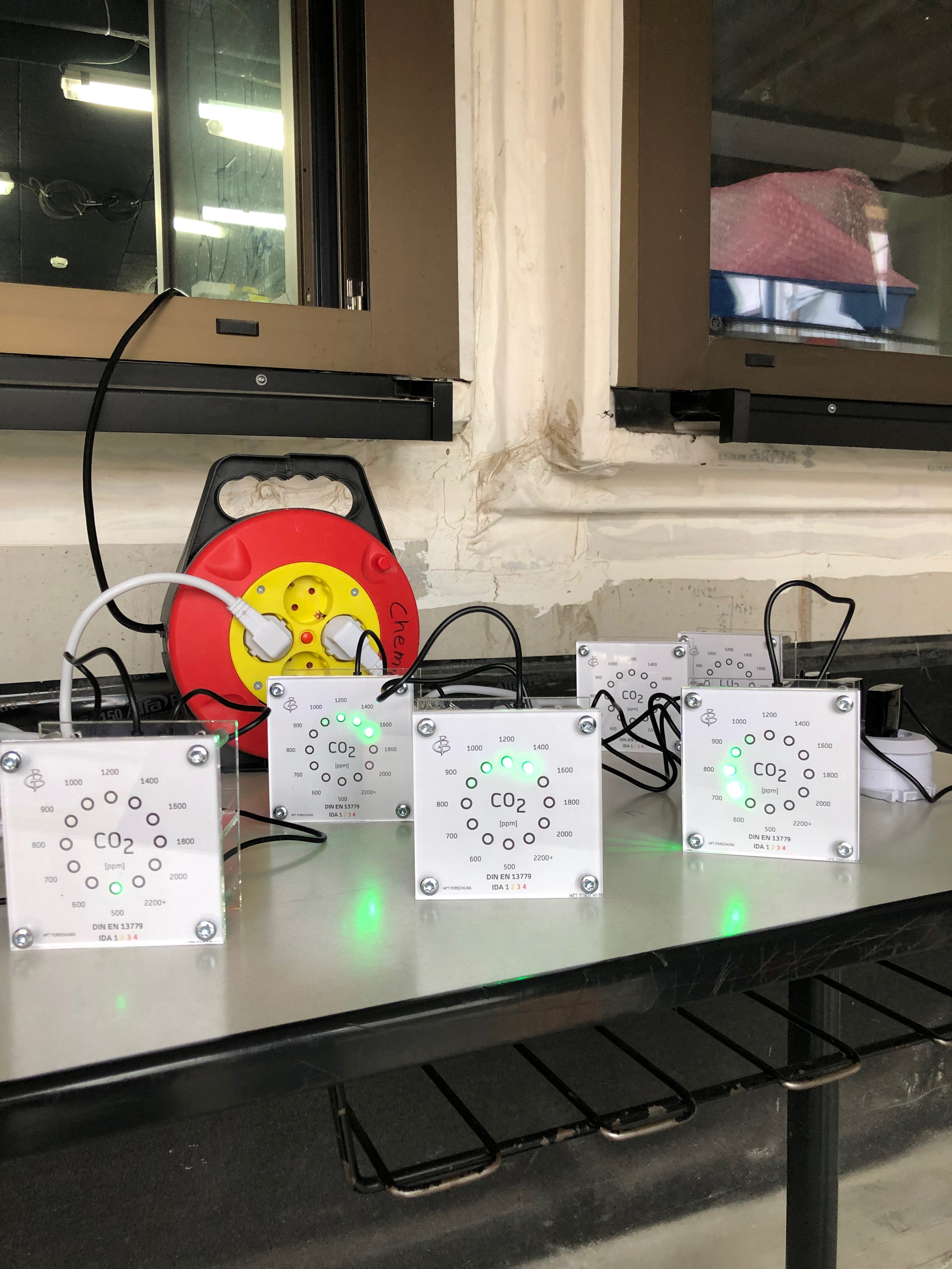 An sieben Stationen bauten Schüler*innen arbeitsteilig 65 CO2-Ampeln, eine für jeden Raum des BGB. Die Ampeln zeigen den CO2-Gehalt in ppm (parts per million/ Millionstel) an und dienen dadurch als Hinweisgeber, wann gelüftet werden muss.