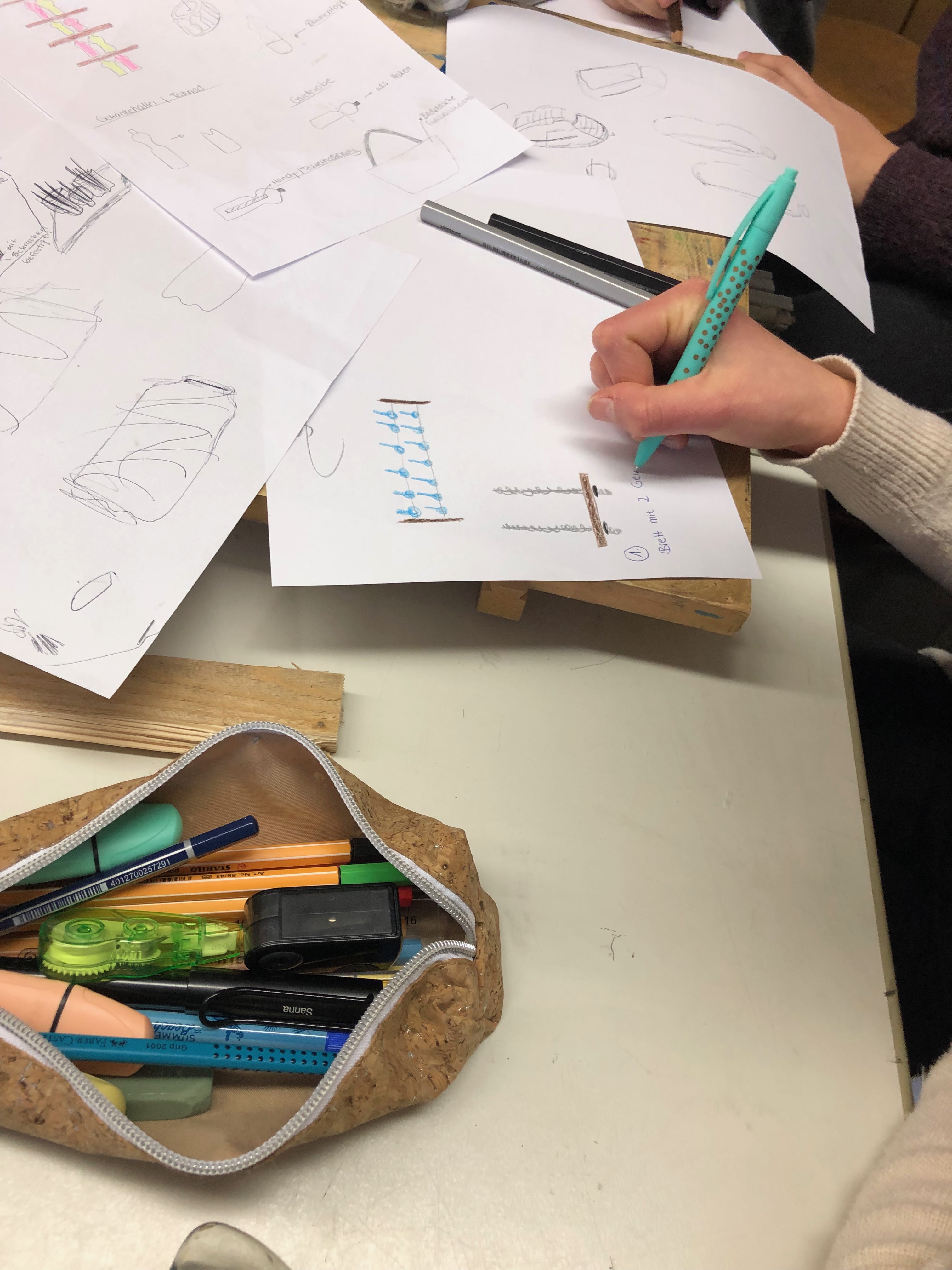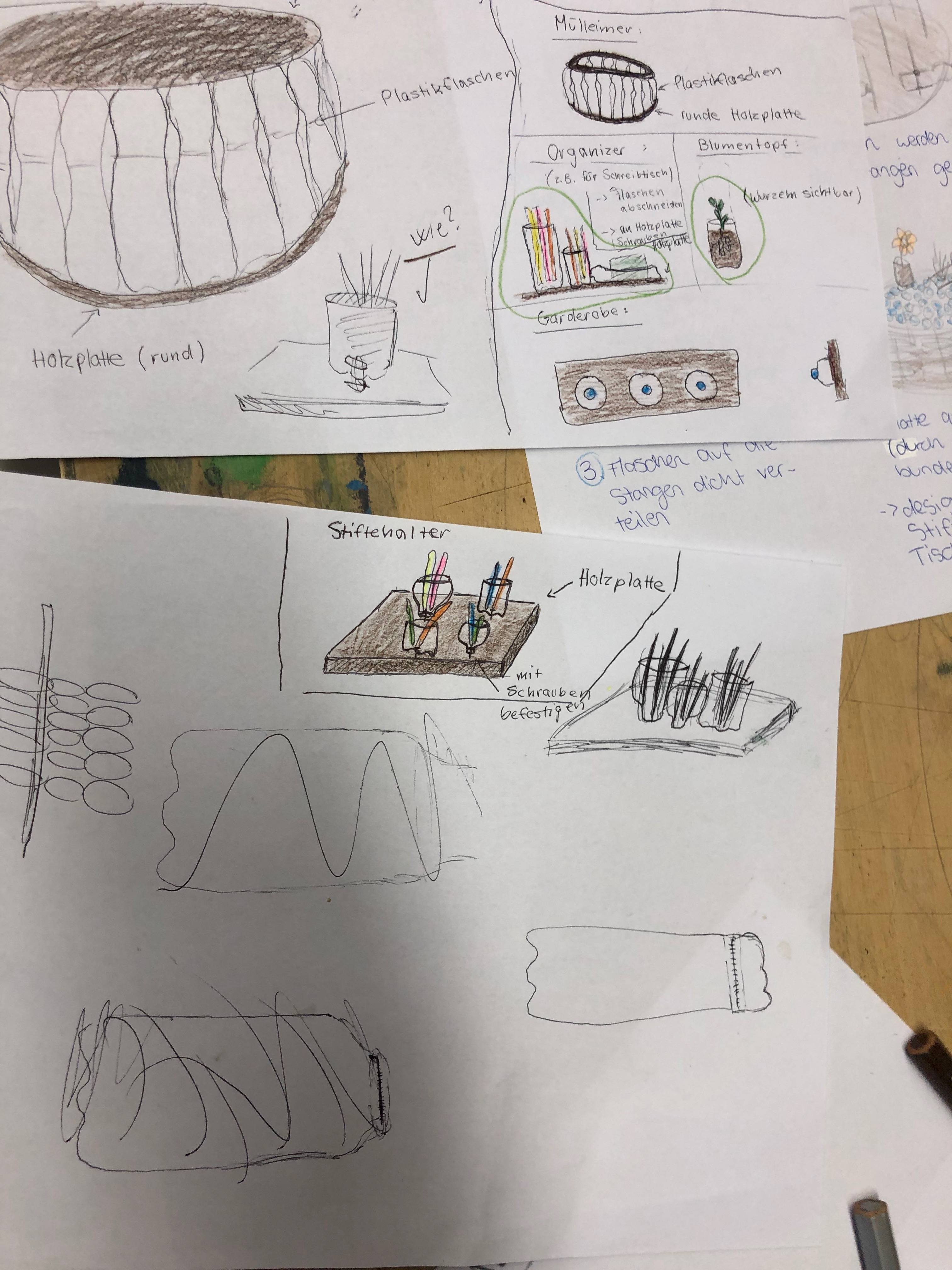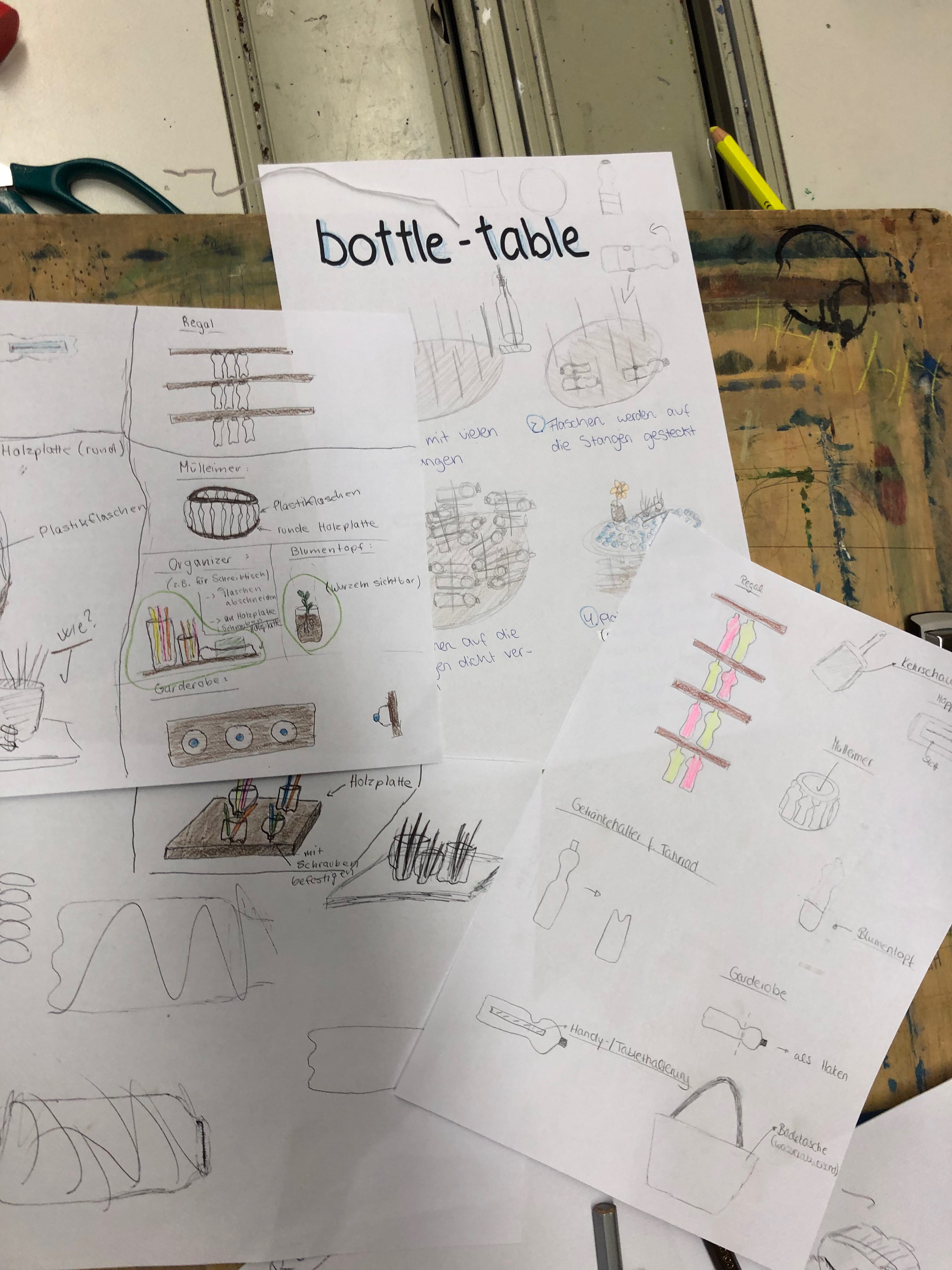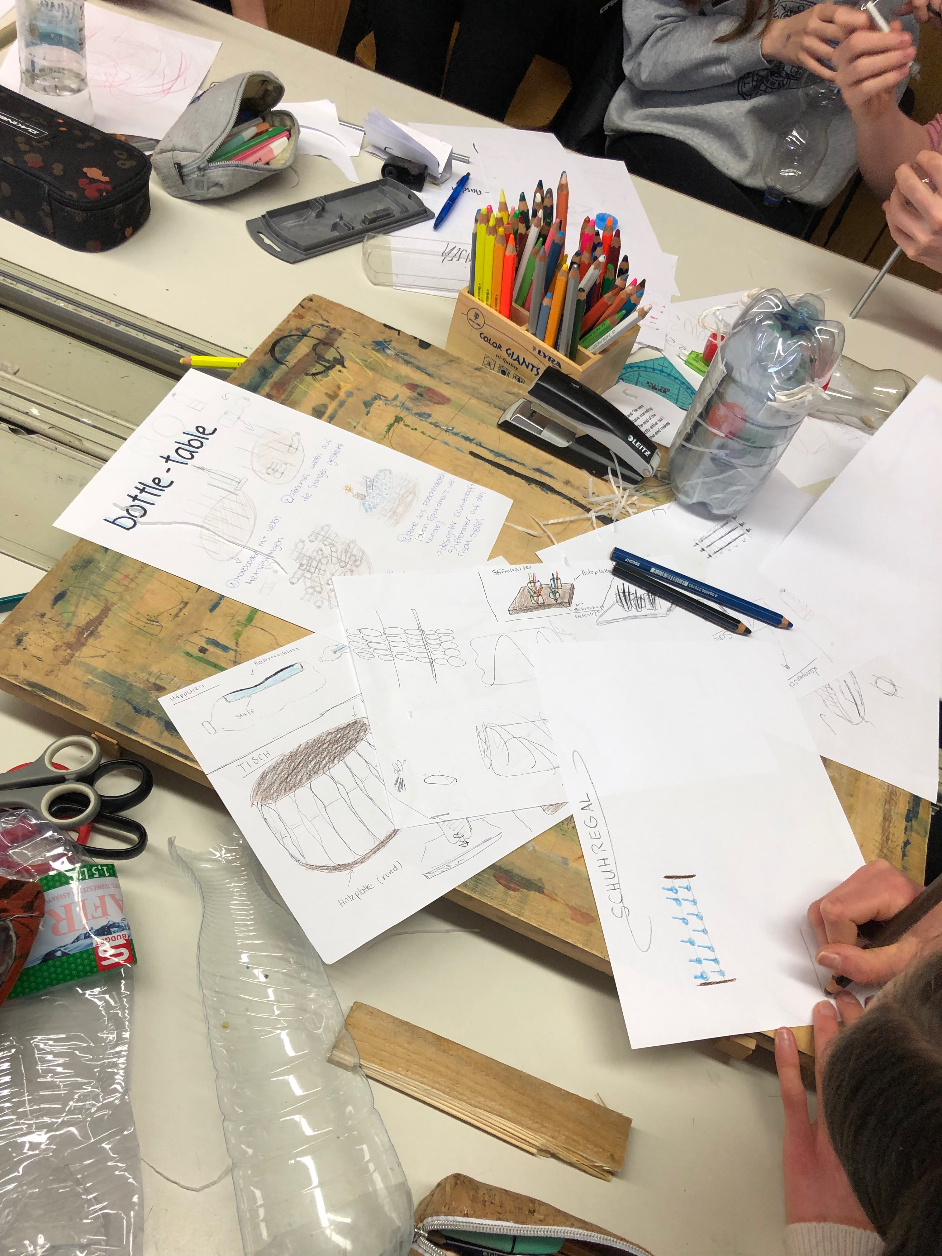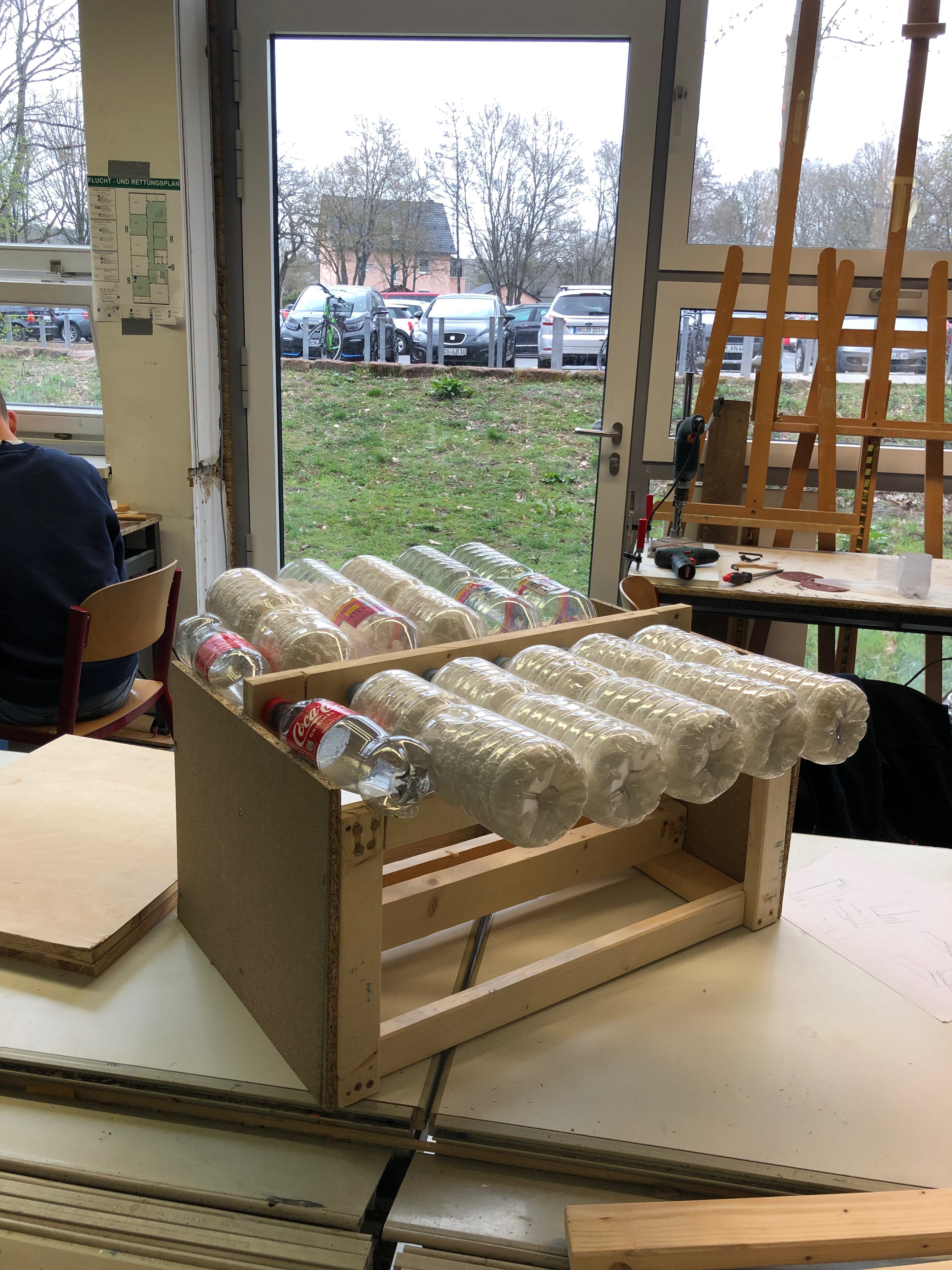 Nachdem zuerst ein Modell für eine Bottle Bank, also eine Sitzbank aus Holz und alten Plastikflaschen, erstellt wurde, machte sich ein Teil der Workshop-Teilnehmer*innen daran, ein größeres Exemplar zu bauen, das in der Cafeteria aufgestellt werden könnte. Der andere Teil entwickelte kreative neue Ideen, um Plastikflaschen zu verwerten, zum Beispiel als Stiftehalter oder Schuhregal. (Video zum Projekt)