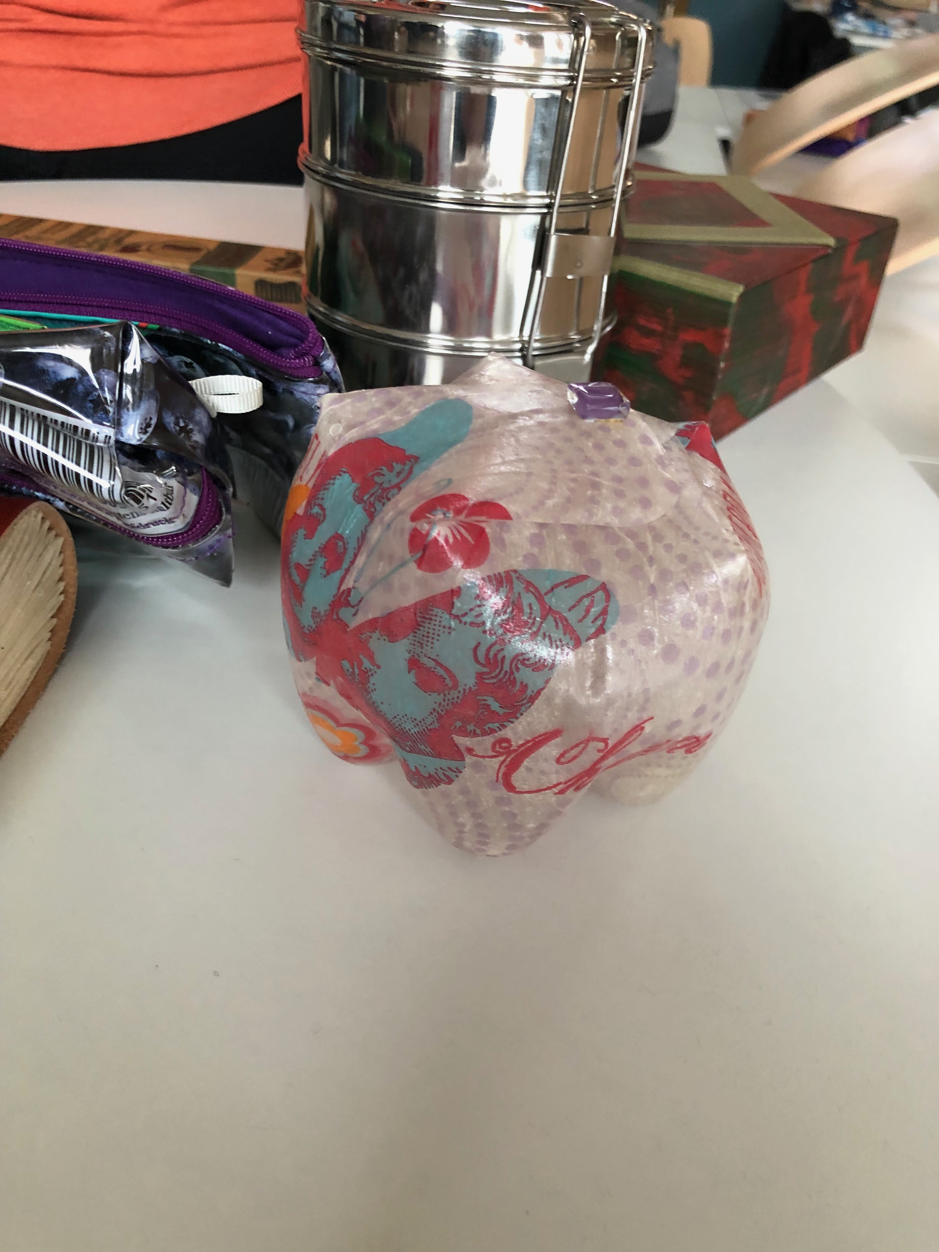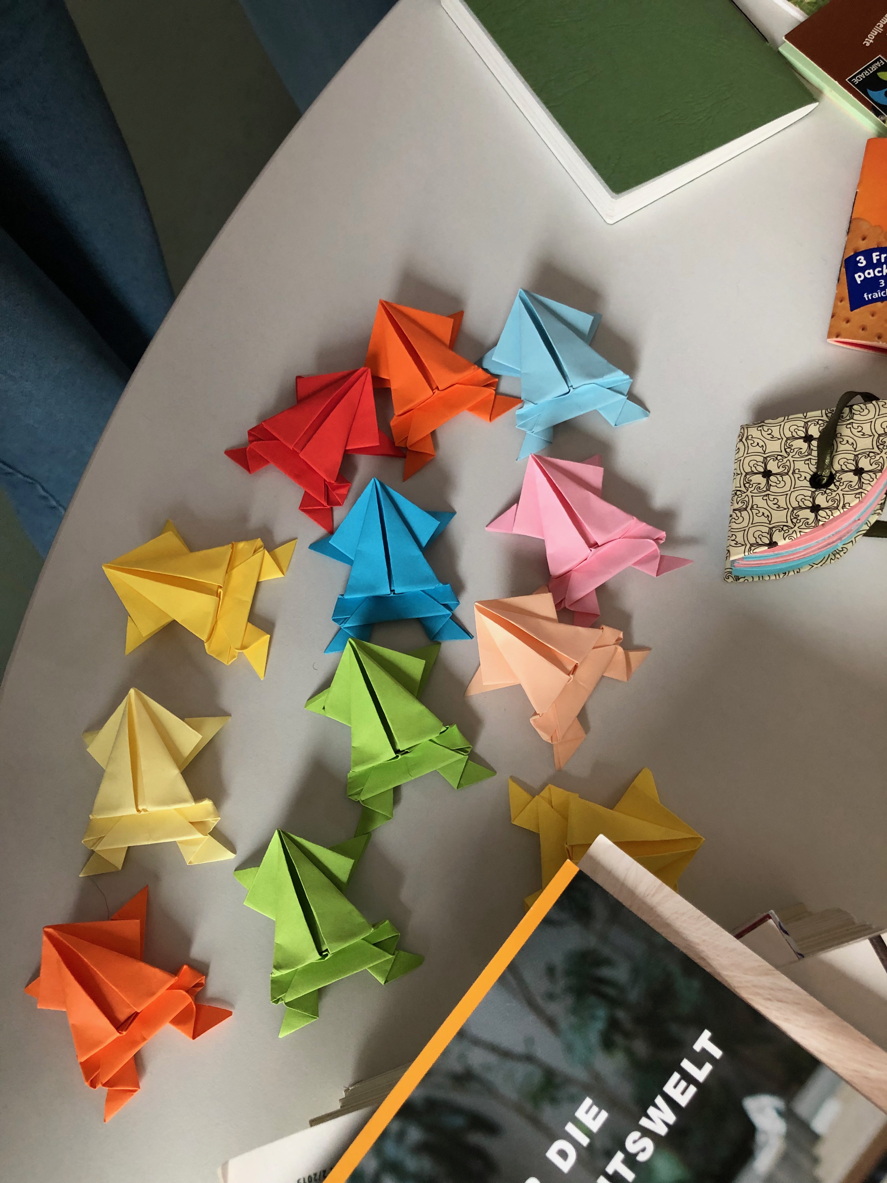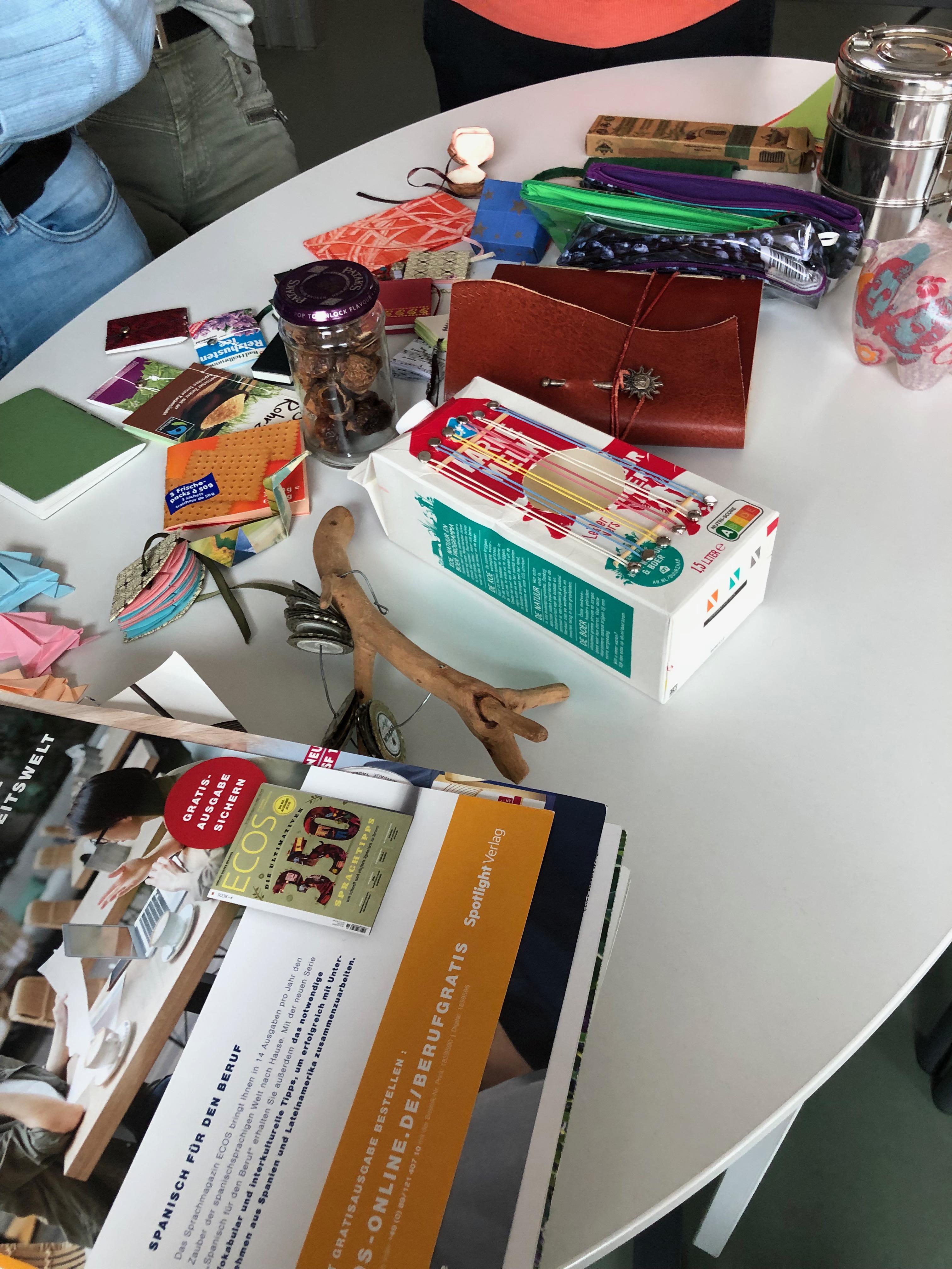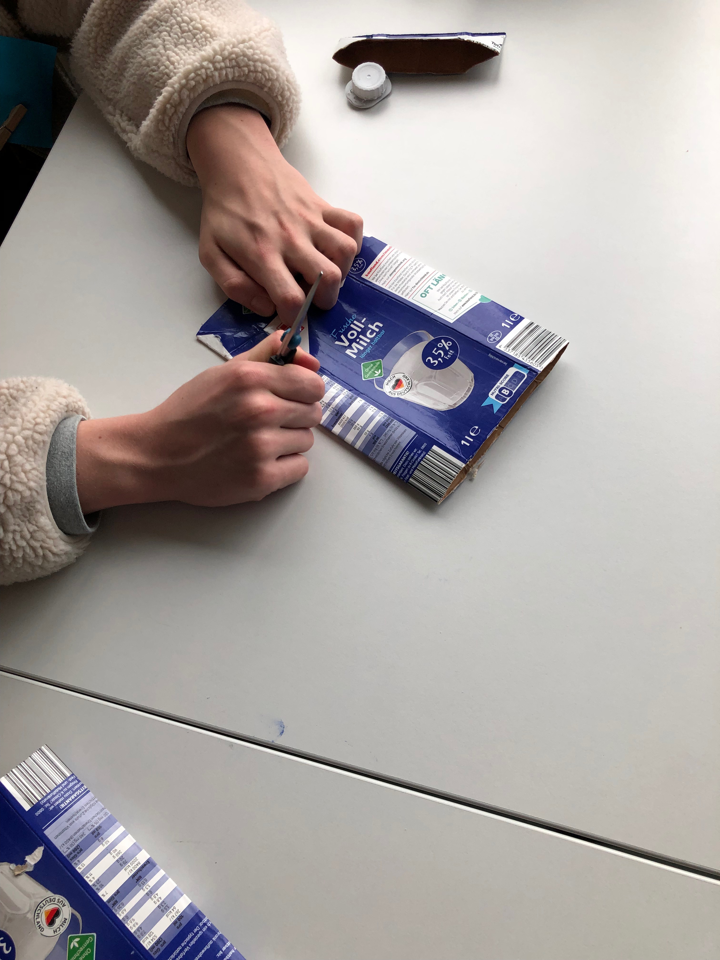 In diesem Workshop drehte sich alles um Müll und Müllminimierung. Große Teile des europäischen Mülls bleiben nämlich gar nicht in Europa, sondern werden in Länder des globalen Südens verschifft, wo sie die Umwelt verschmutzen. Um dem entgegenzuwirken, zeigte Rajya Karumanchi-Dörsam den Teilnehmer*innen Möglichkeiten, wie man aus scheinbarem Müll Gebrauchsgegenstände und Dekorationen schaffen kann, sie also upcycelt. Gemeinsam bastelten sie ein Portemonnaie aus einem alten Tetra Pak.